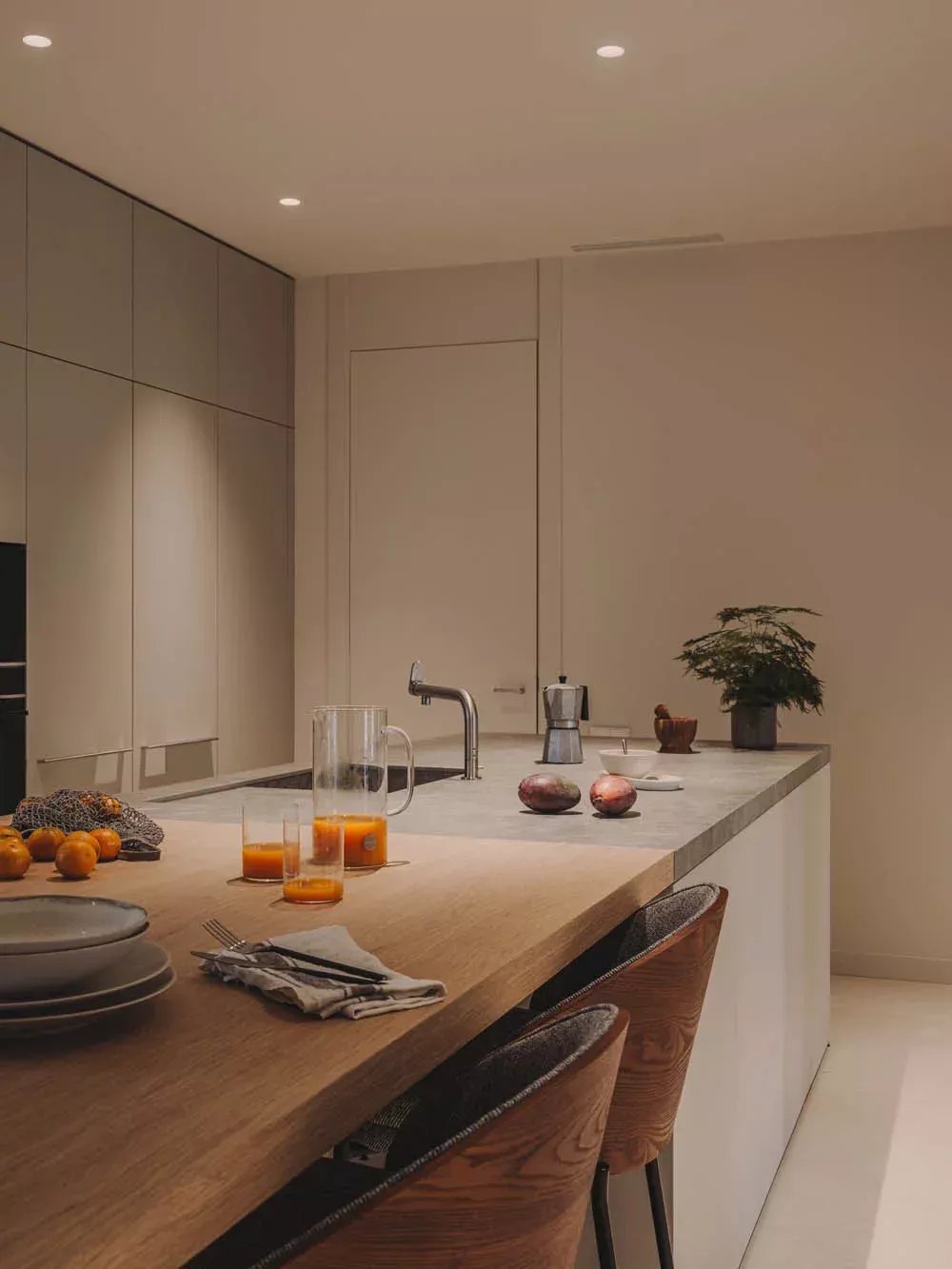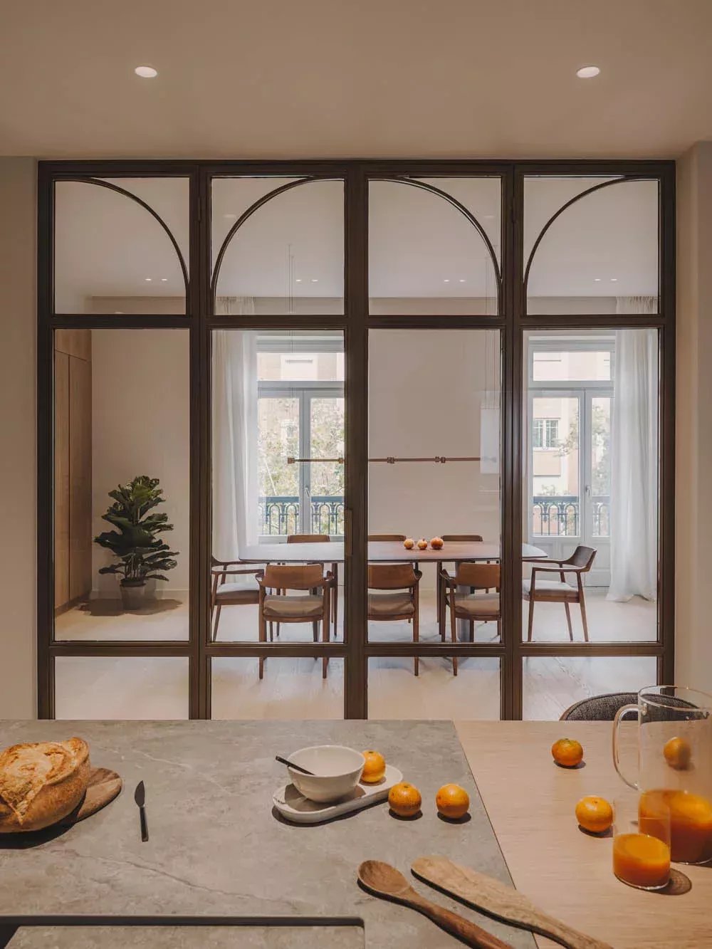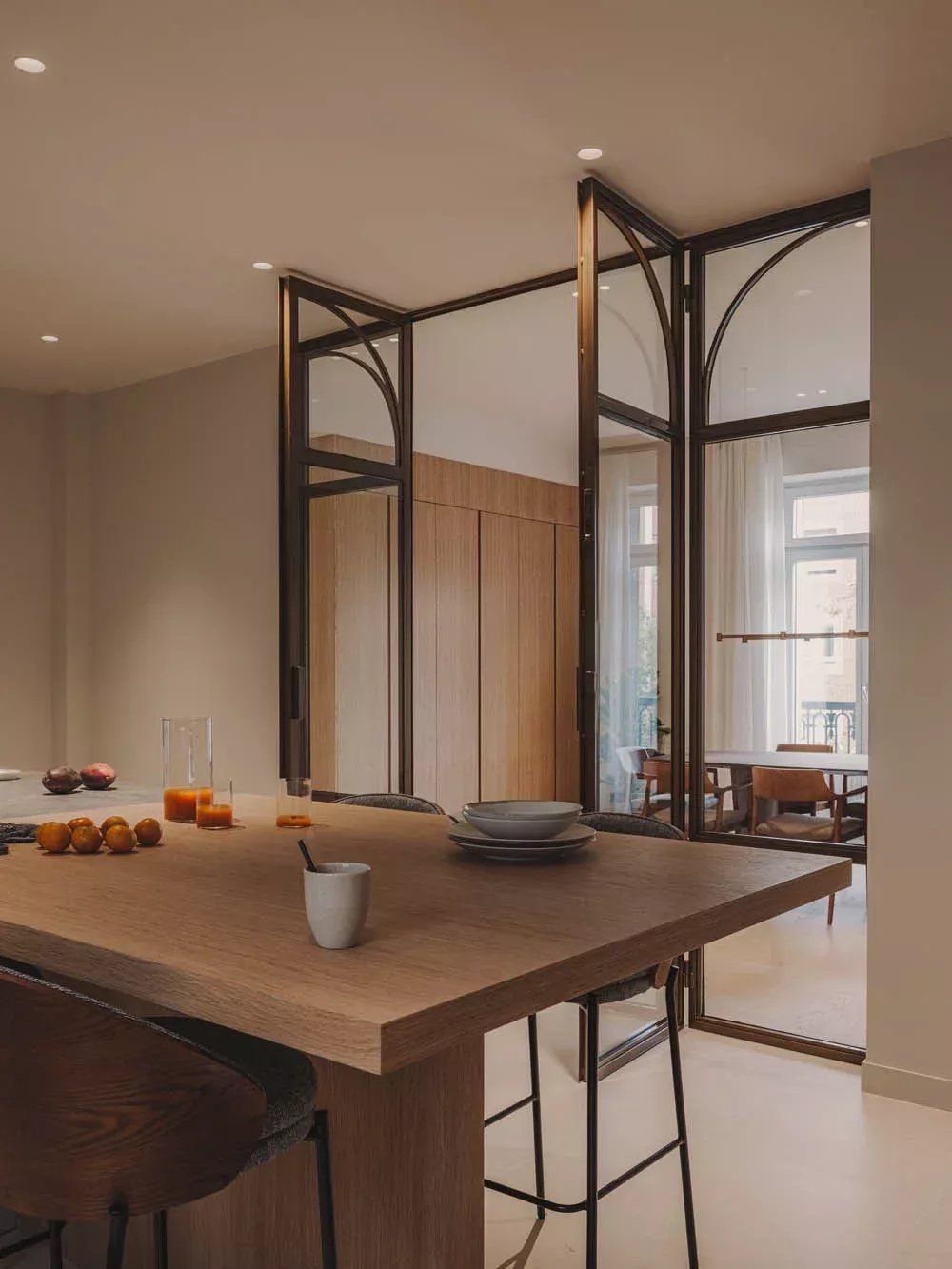 La cuisine, pensée comme une véritable pièce maîtresse, se dissimule derrière une cloison ajourée en verre et aluminium aux reflets cuivrés, un élément architectural qui adoucit la transition avec les salons tout en apportant une subtile touche de modernité. Les portes en verre et aluminium des espaces communs permettent une fluidité et une continuité visuelle remarquables. Entièrement équipée avec les derniers appareils Gaggenau et un mobilier Rimadesio, cette cuisine conjugue design et fonctionnalité au plus haut niveau.