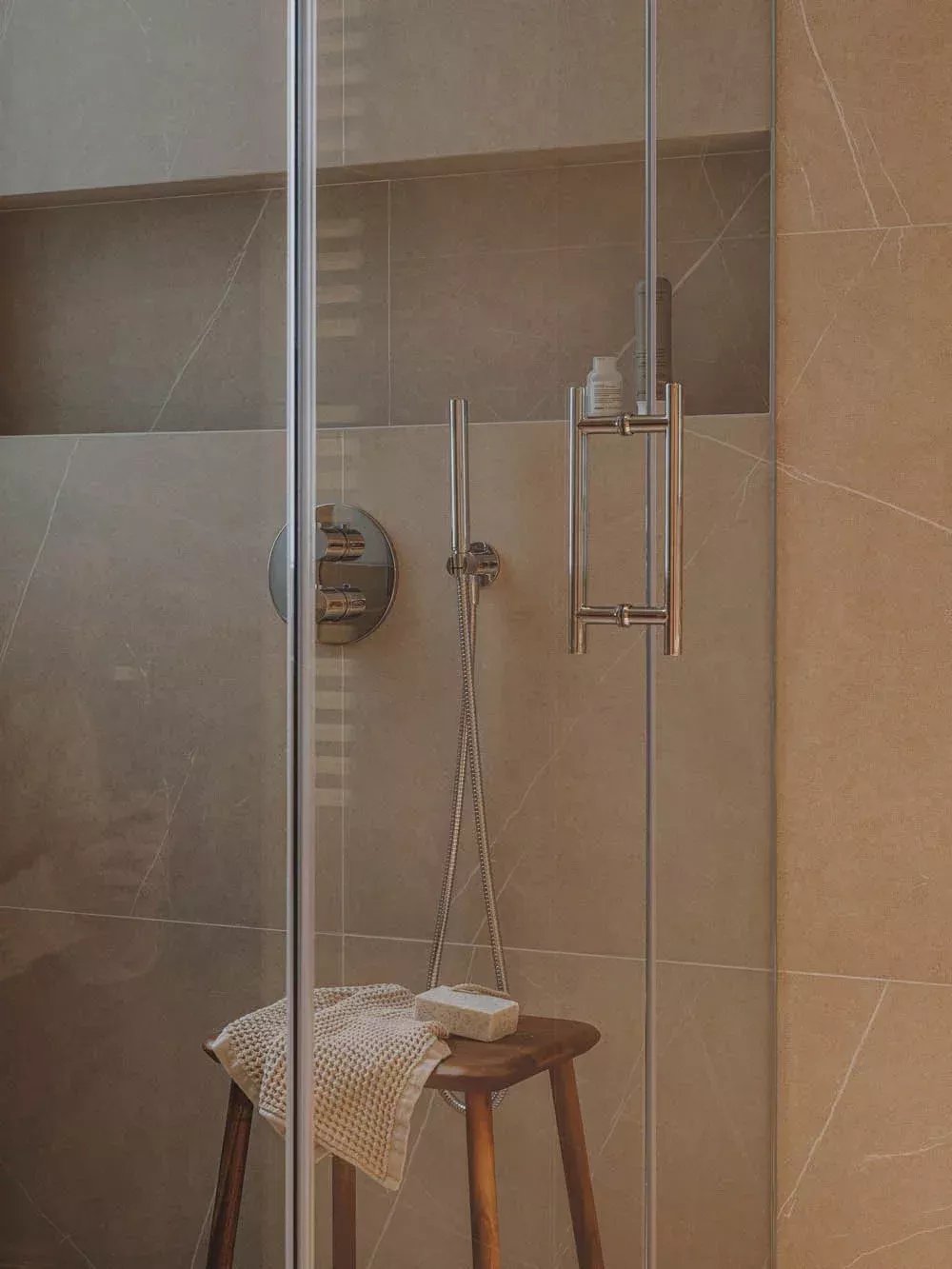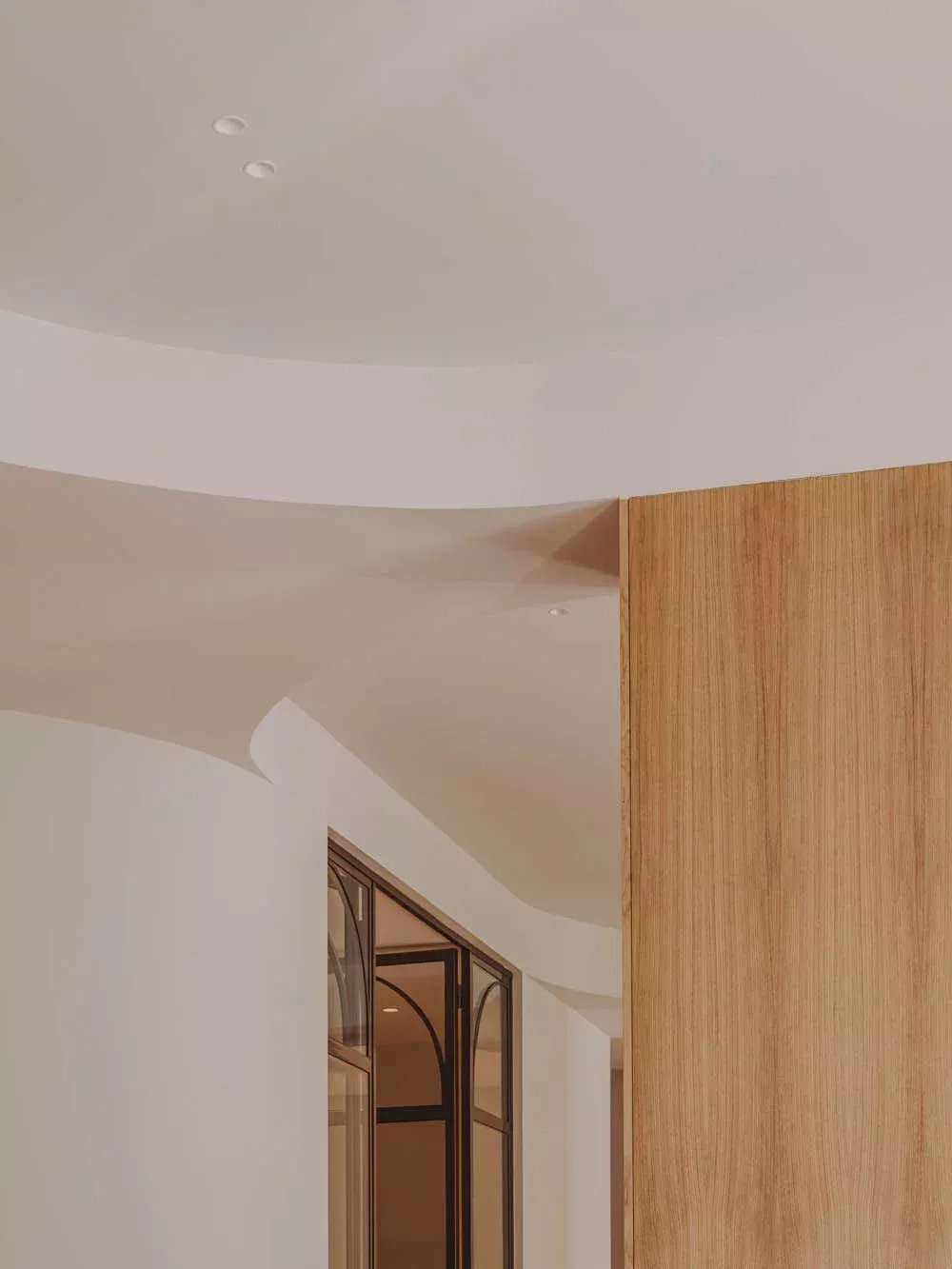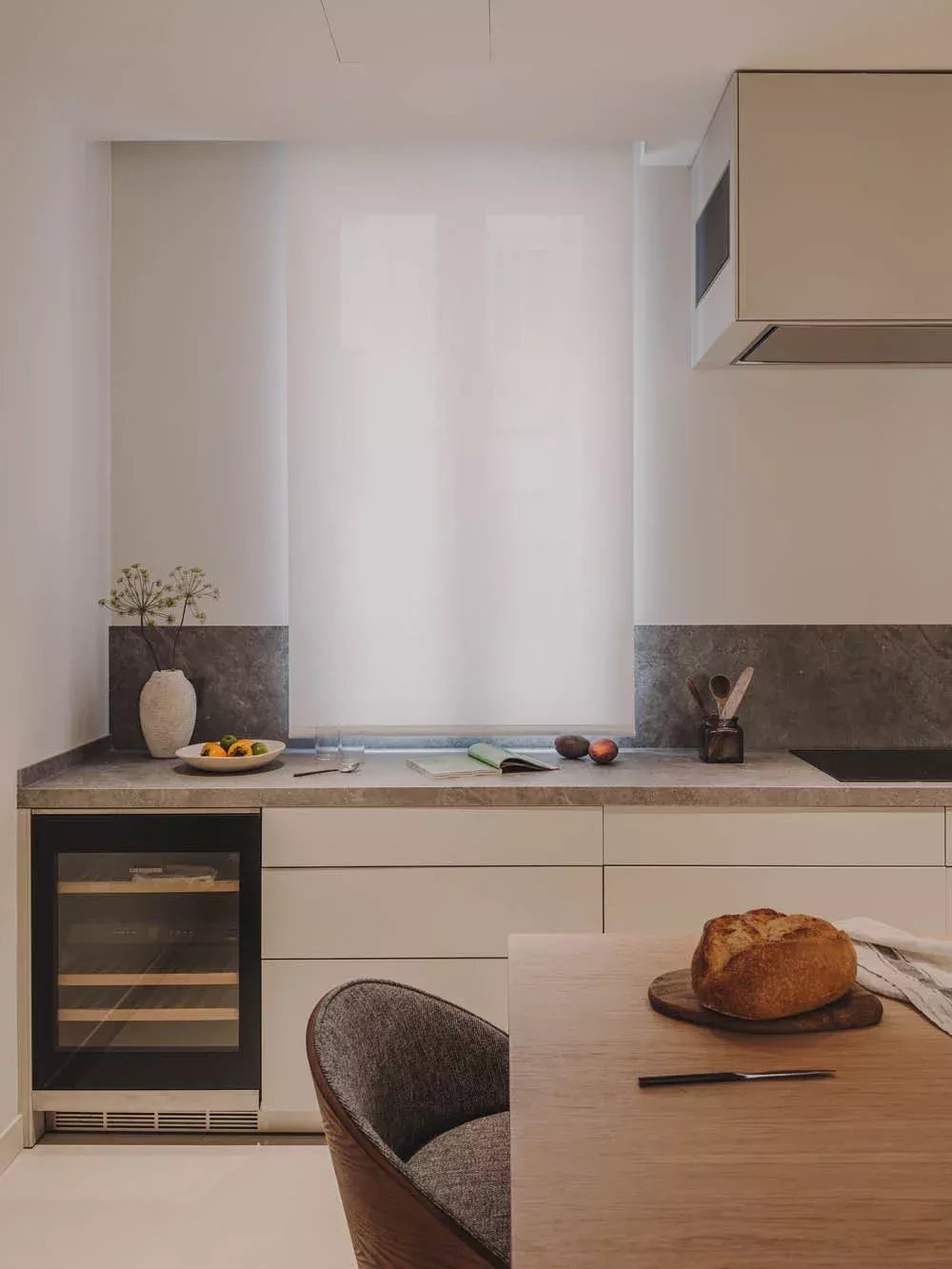 La cuisine, pensée comme une véritable pièce maîtresse, se dissimule derrière une cloison ajourée en verre et aluminium aux reflets cuivrés, un élément architectural qui adoucit la transition avec les salons tout en apportant une subtile touche de modernité. Les portes en verre et aluminium des espaces communs permettent une fluidité et une continuité visuelle remarquables. Entièrement équipée avec les derniers appareils Gaggenau et un mobilier Rimadesio, cette cuisine conjugue design et fonctionnalité au plus haut niveau.