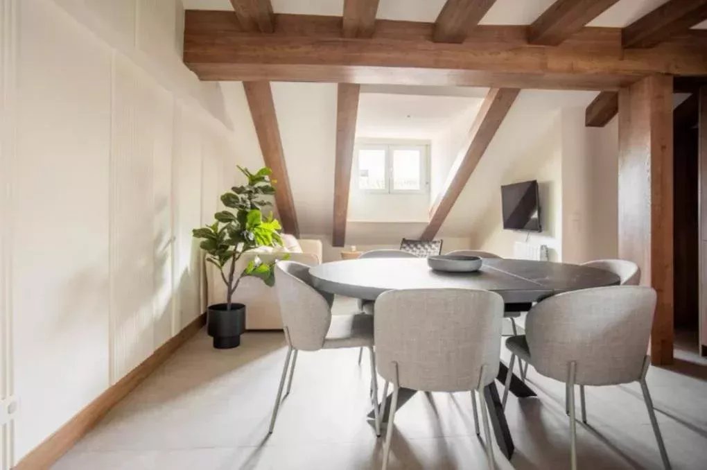 La lumière naturelle inonde chaque recoin du penthouse grâce à son orientation et aux fenêtres de toit type Velux, apportant une sensation d’espace et de chaleur dans toutes les pièces. La cuisine ouverte s’intègre harmonieusement au salon-salle à manger, créant un espace commun lumineux et accueillant, parfait pour la vie quotidienne comme pour recevoir.