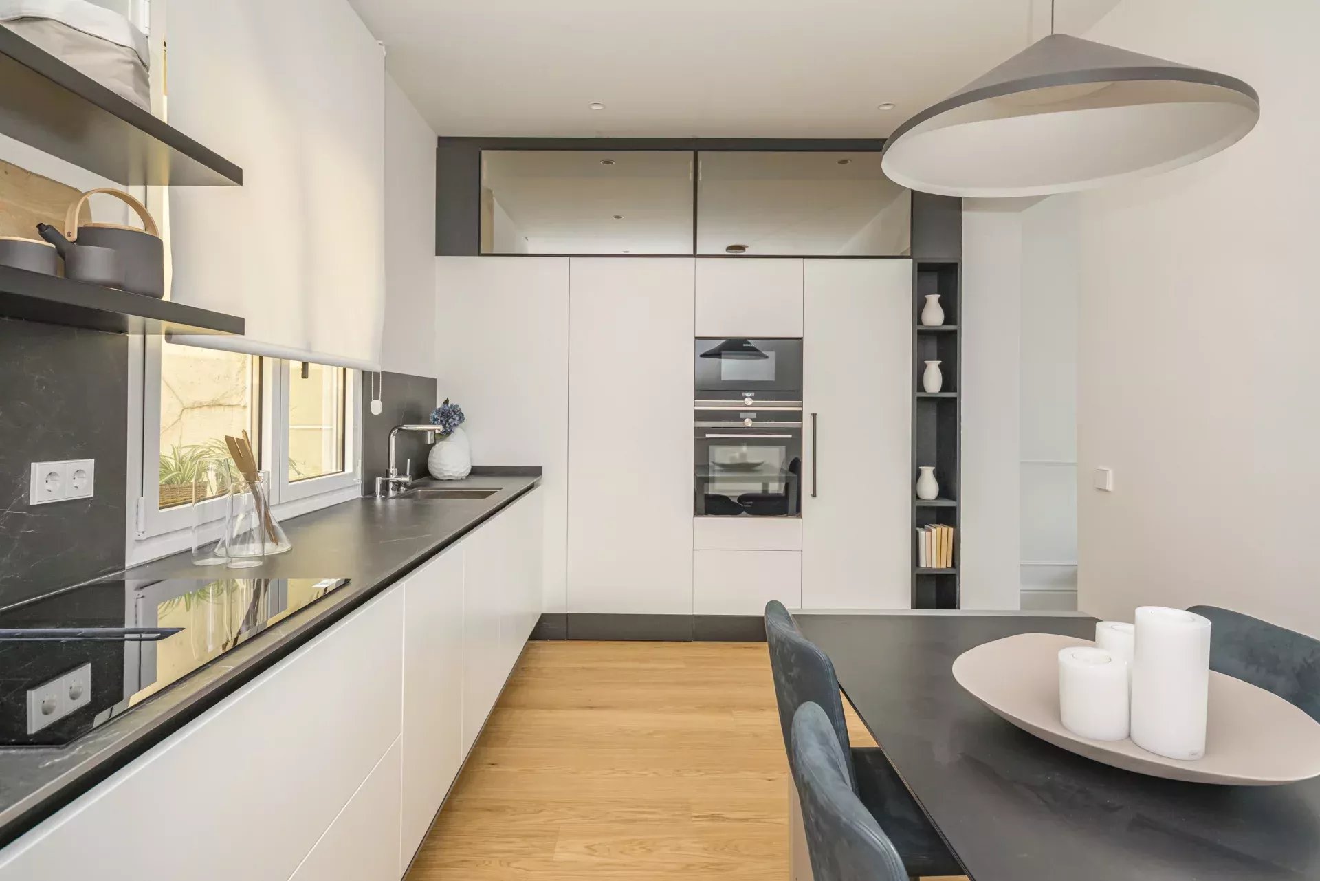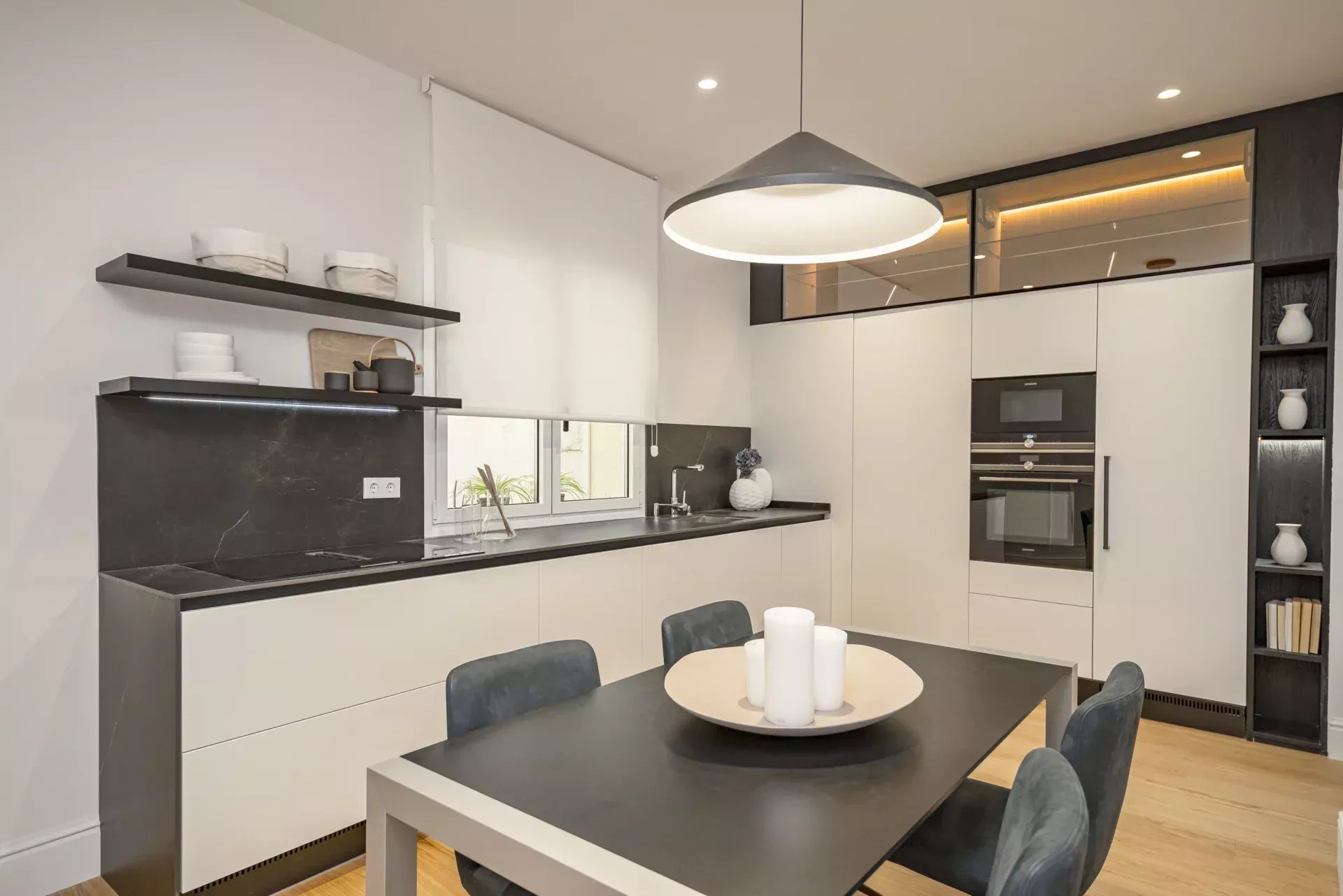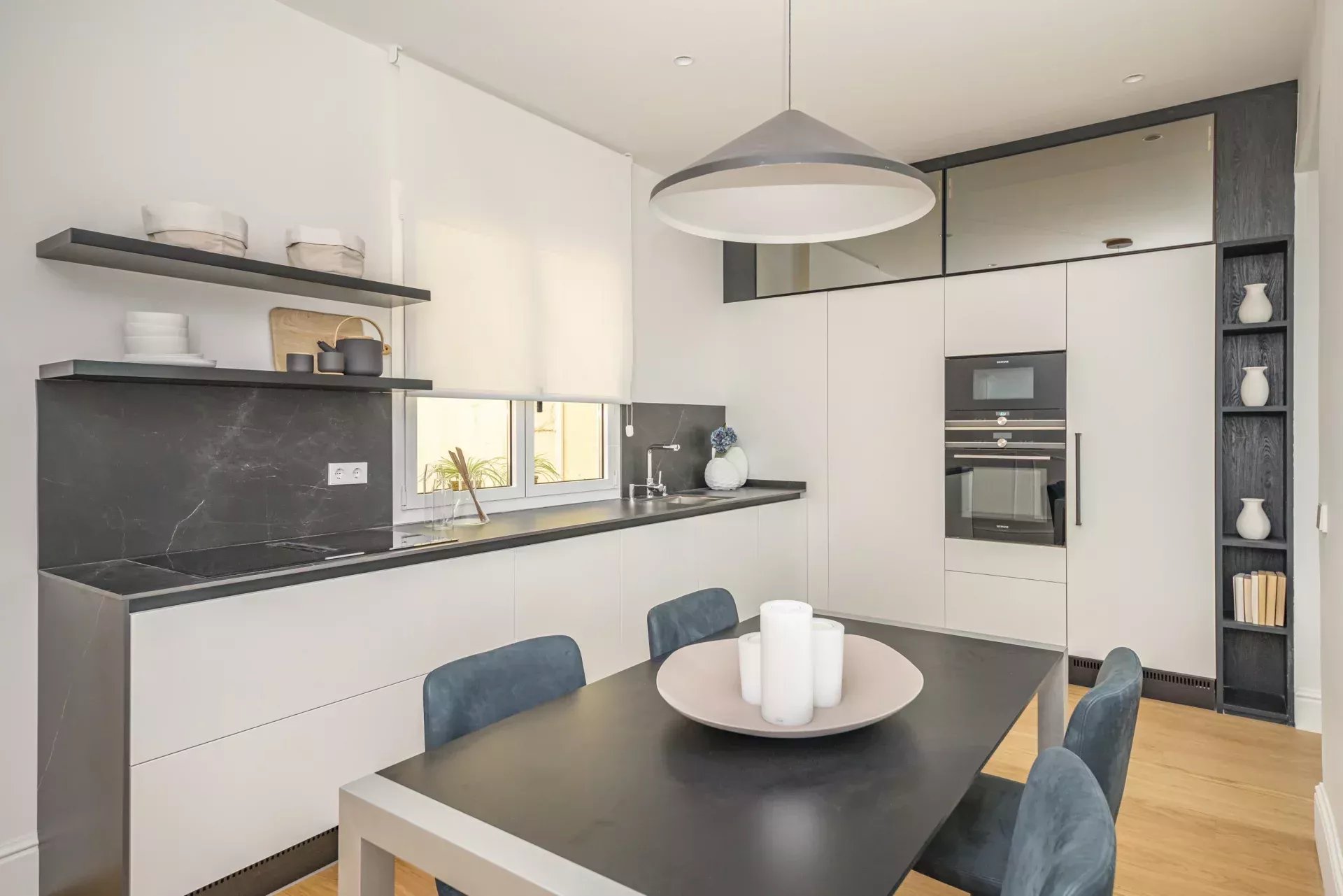 La décoration intérieure a été réalisée par le studio BANNI, qui a doté l'espace d'un style sophistiqué et fonctionnel. La cuisine haut de gamme BANNI-Arclinea, équipée d'appareils électroménagers Siemens Studio Line, s'intègre avec élégance dans le salon-salle à manger tout en conservant son indépendance visuelle. Les salles de bains, également conçues par BANNI, reflètent une esthétique moderne et soignée.