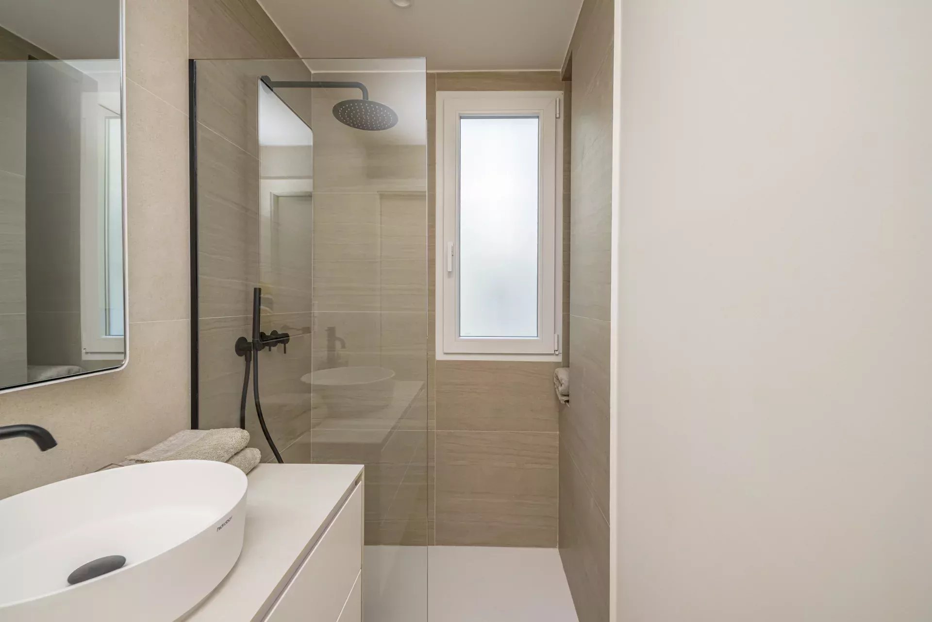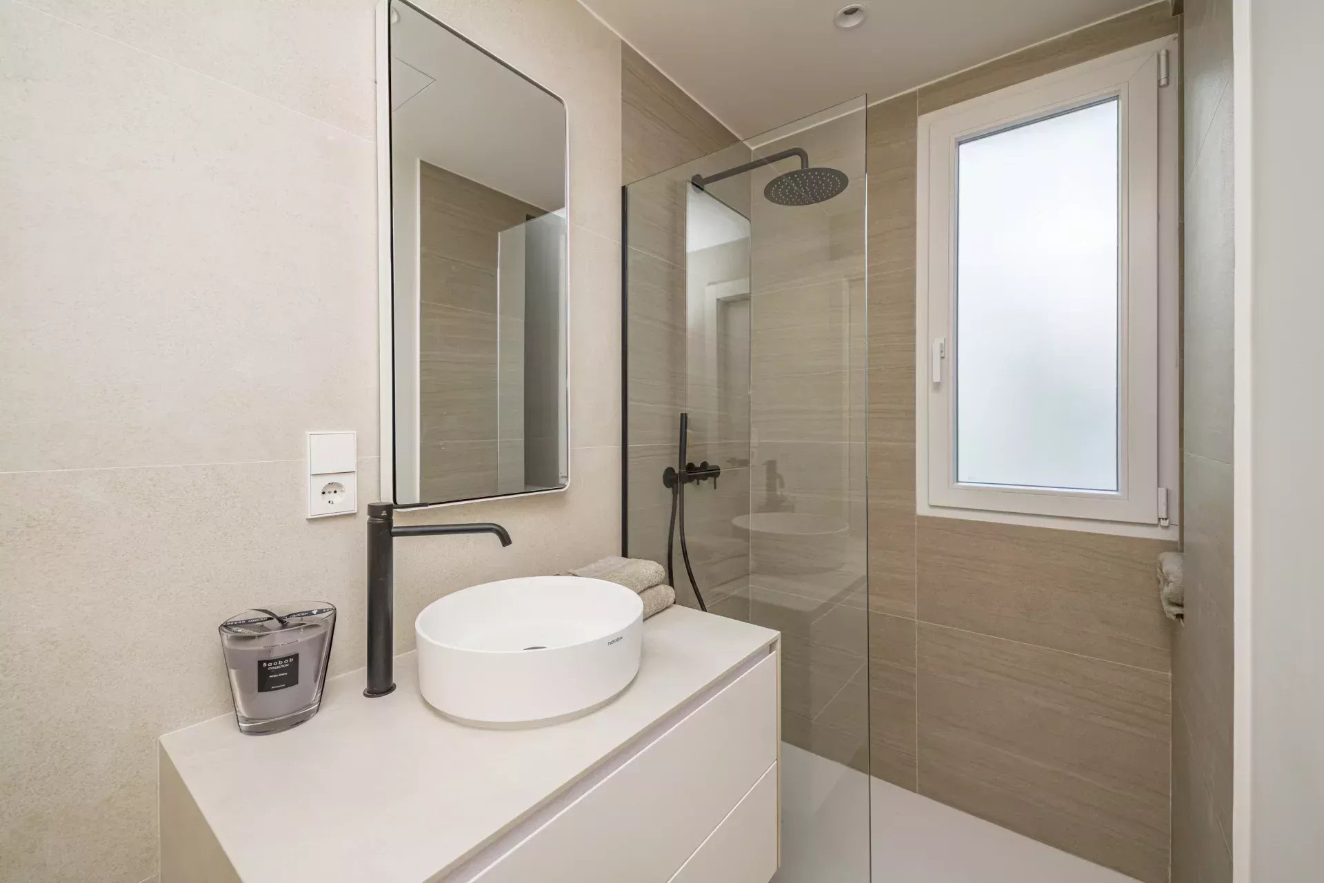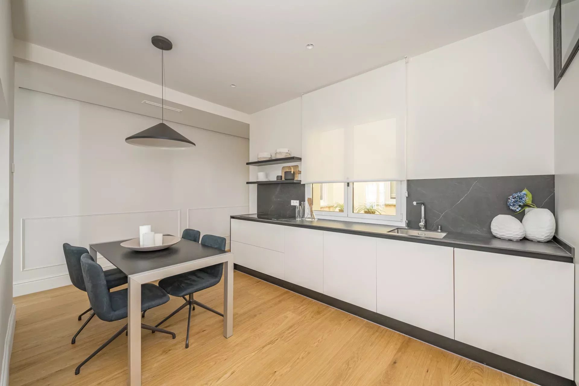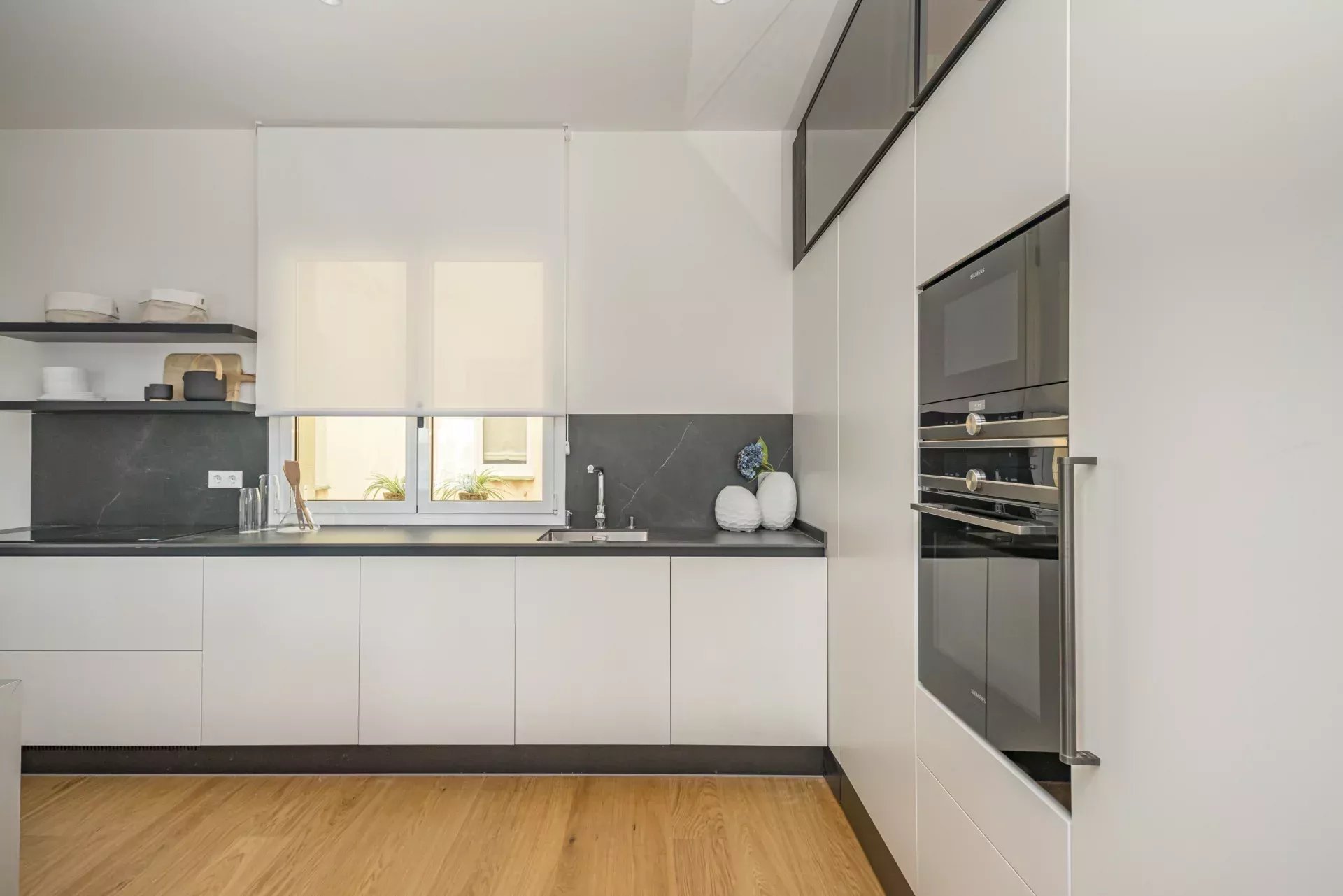 La décoration intérieure a été réalisée par le studio BANNI, qui a doté l'espace d'un style sophistiqué et fonctionnel. La cuisine haut de gamme BANNI-Arclinea, équipée d'appareils électroménagers Siemens Studio Line, s'intègre avec élégance dans le salon-salle à manger tout en conservant son indépendance visuelle. Les salles de bains, également conçues par BANNI, reflètent une esthétique moderne et soignée.