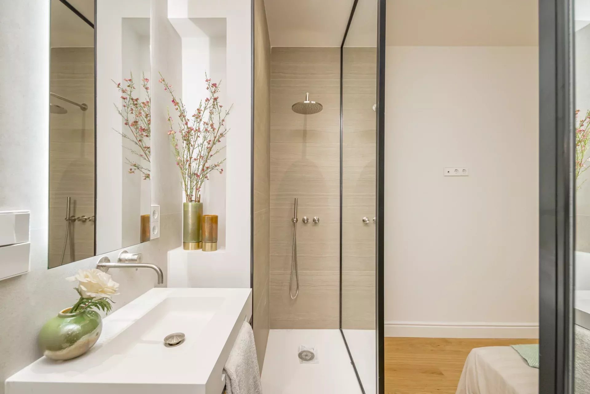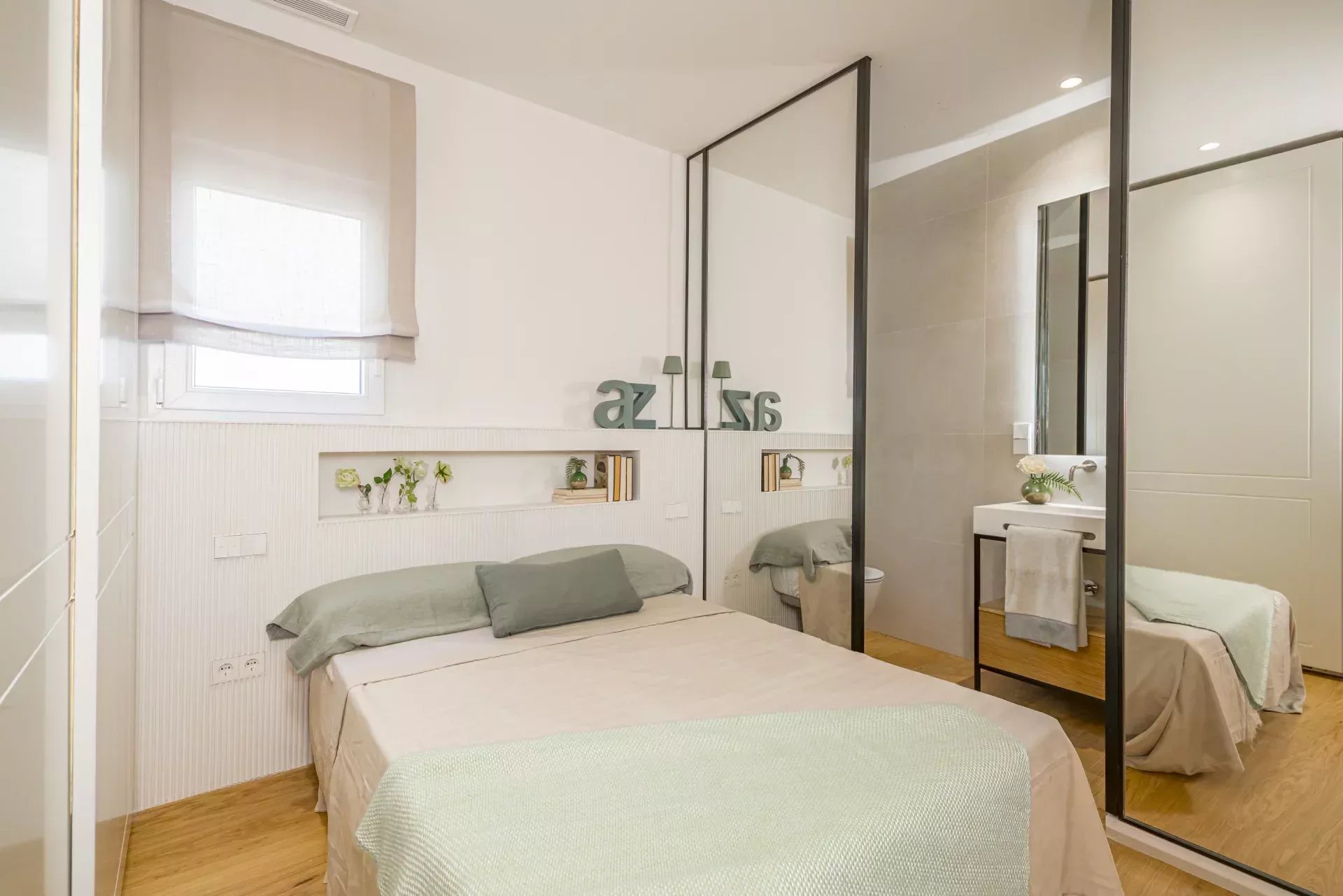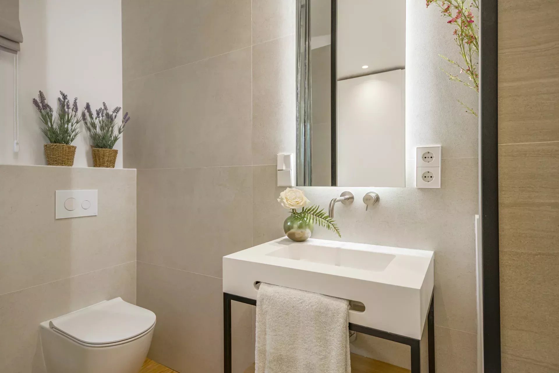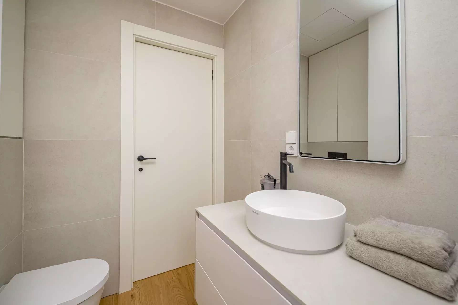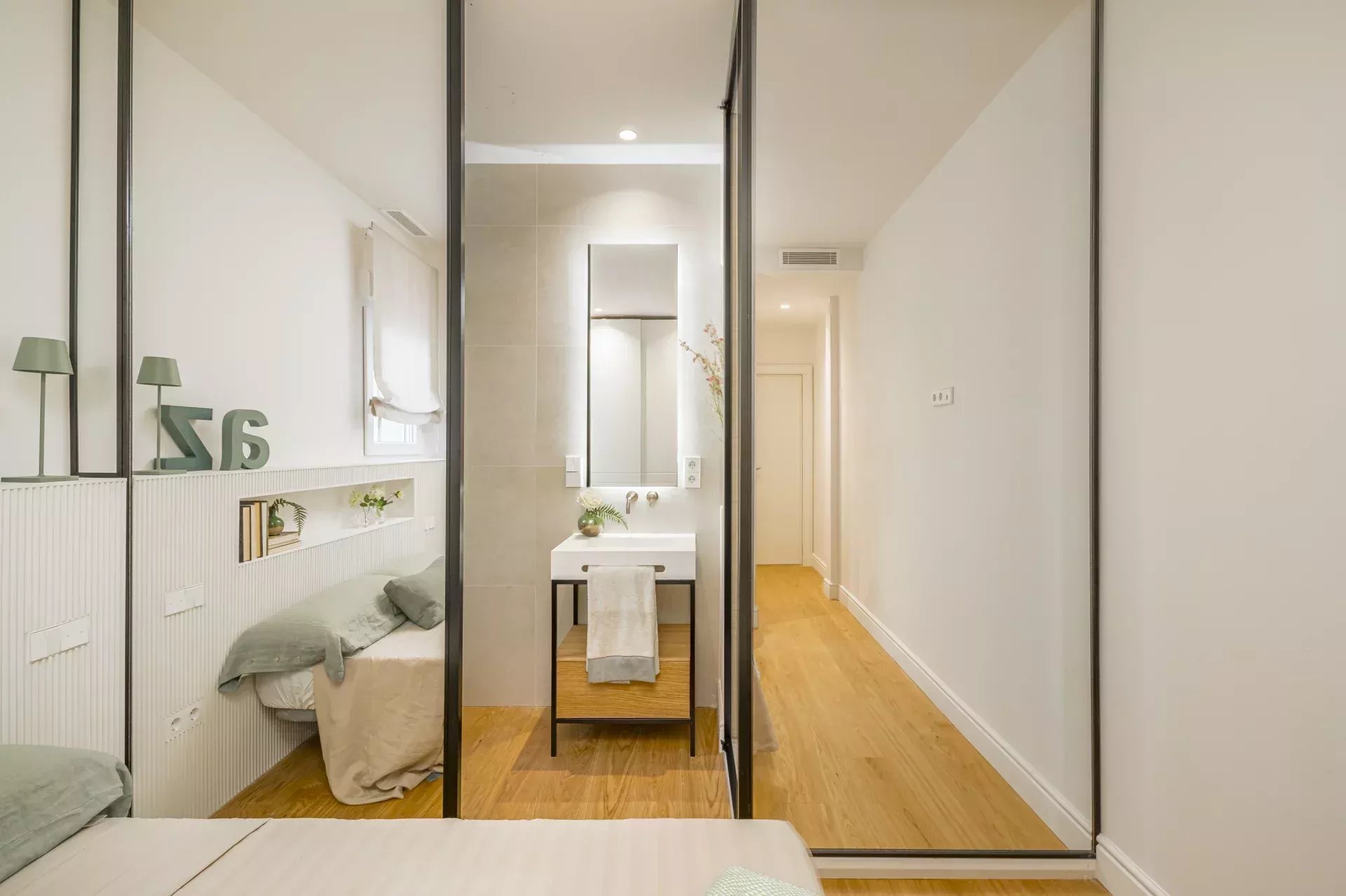 Elle se distingue par sa luminosité grâce à son orientation sud-est et ses grandes baies vitrées. Elle comprend deux chambres, dont une en suite, et deux salles de bains complètes, toutes dotées de finitions de la plus haute qualité. Les sols en bois naturel, le chauffage au sol et le système de climatisation Daikin chaud-froid garantissent un confort tout au long de l'année.