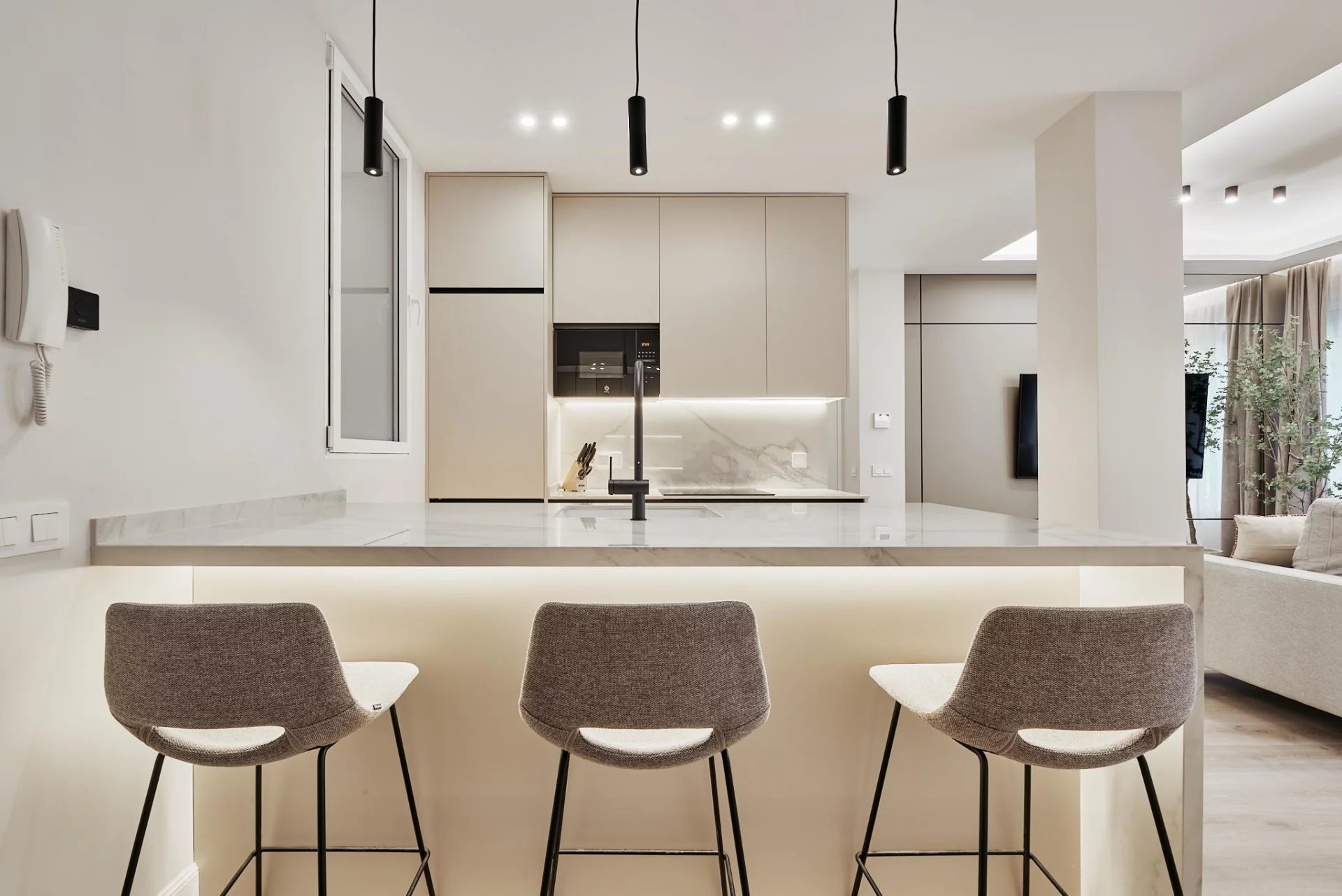 Avec une superficie cadastrale de 106 m², la distribution a été optimisée pour le confort et la luminosité. Le cœur de la maison est un grand salon-salle à manger avec une cuisine américaine intégrée, équipée d'appareils électroménagers haut de gamme.