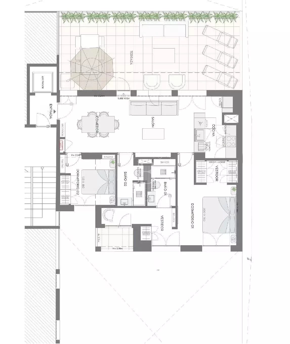 Il comprend 2 chambres spacieuses et 2 salles de bains complètes, dont une en suite et un dressing dans la suite parentale, une cuisine semi-ouverte et un salon-salle à manger avec accès à la terrasse de 45 mètres carrés pour profiter de l'air libre et de la vue.