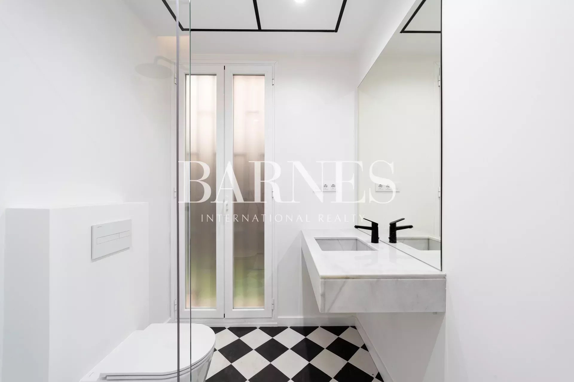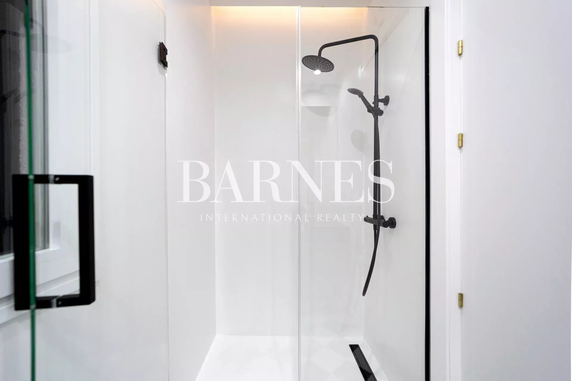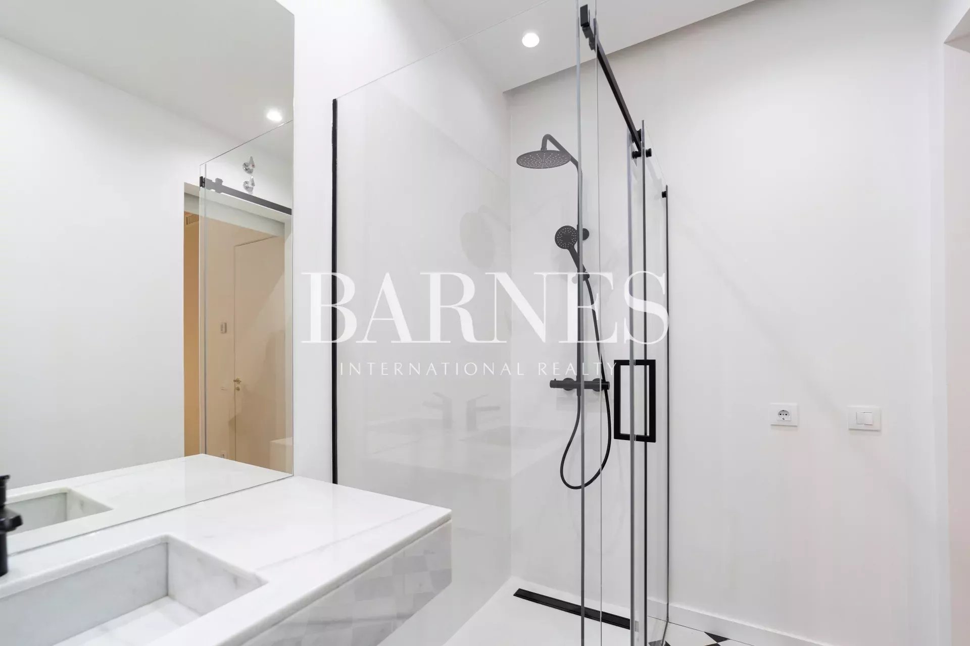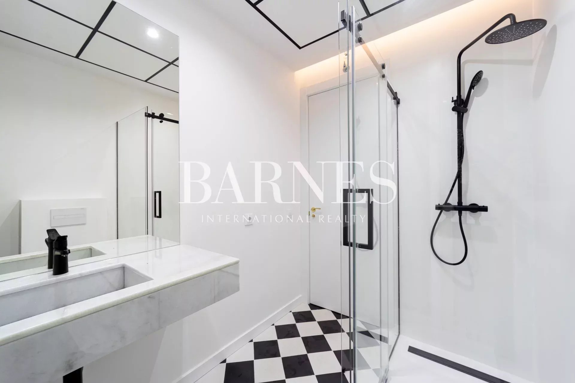 Salles de bains en marbre avec robinetterie noire, parquets en chêne, hauts plafonds, climatisation canalisée, vidéophone, portes coulissantes.