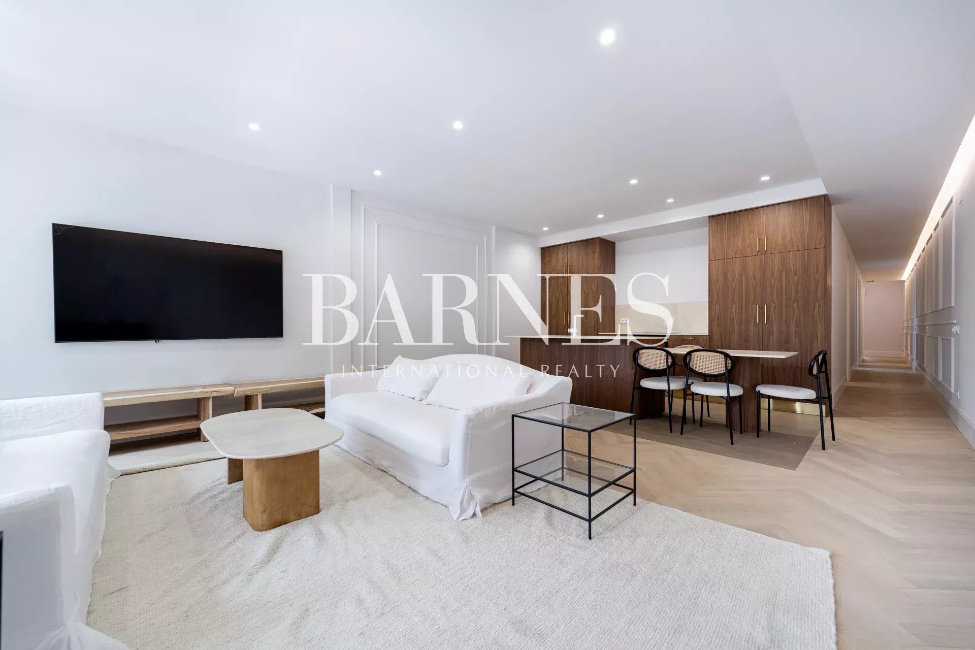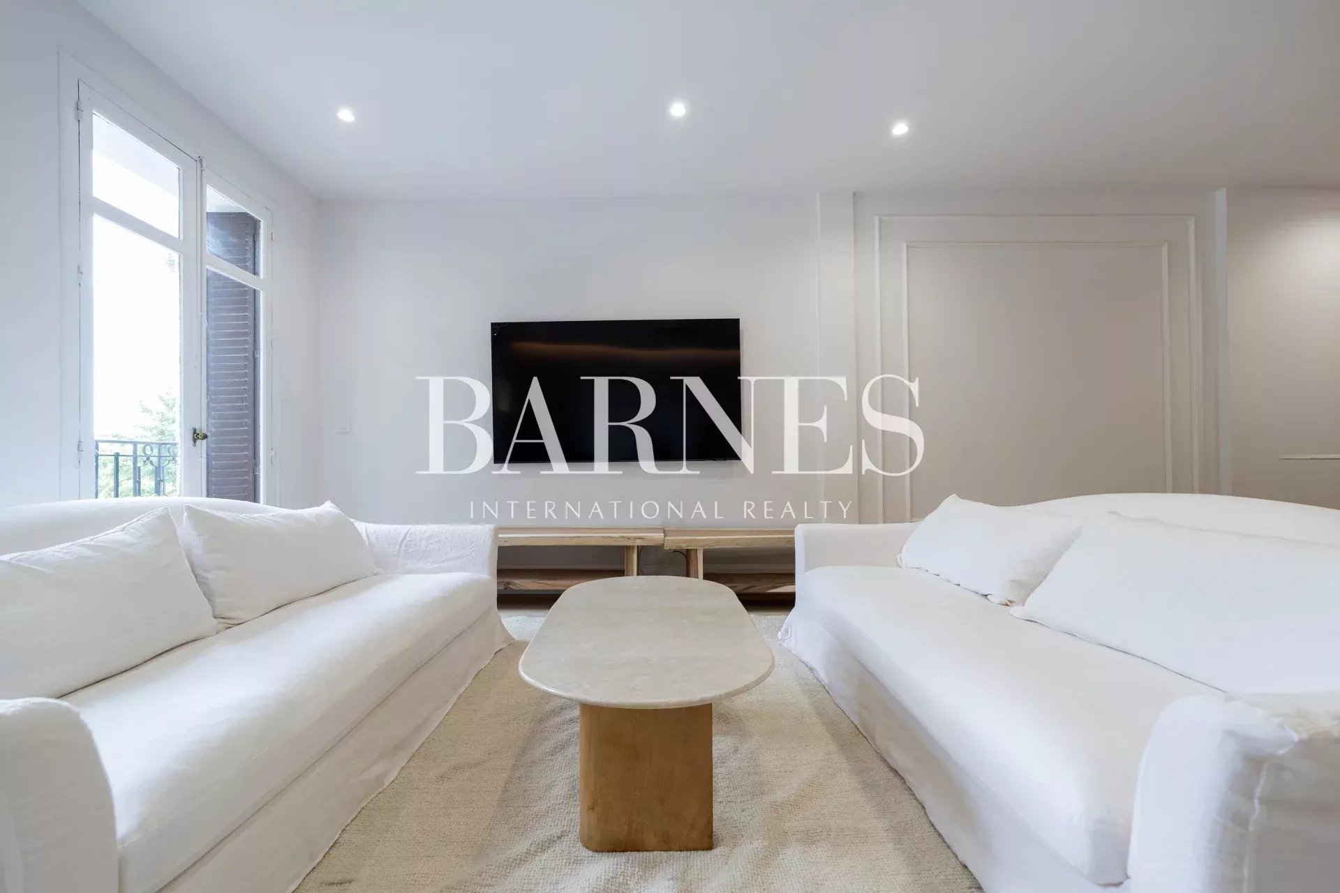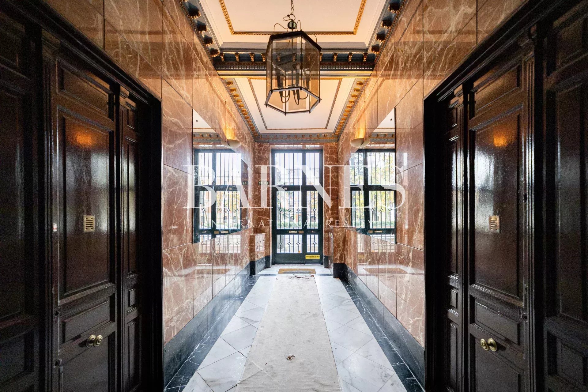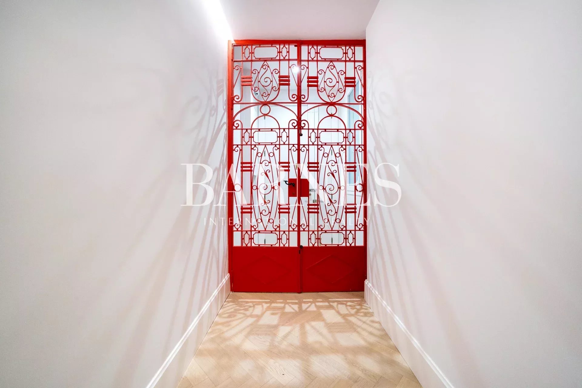 Salles de bains en marbre avec robinetterie noire, parquets en chêne, hauts plafonds, climatisation canalisée, vidéophone, portes coulissantes.