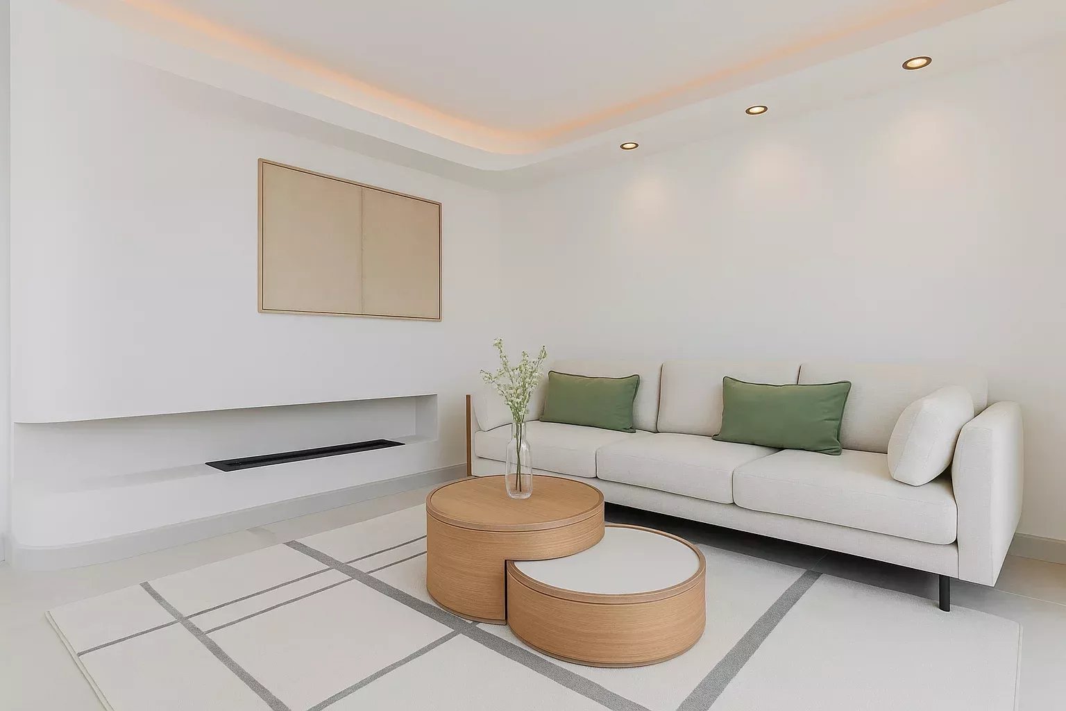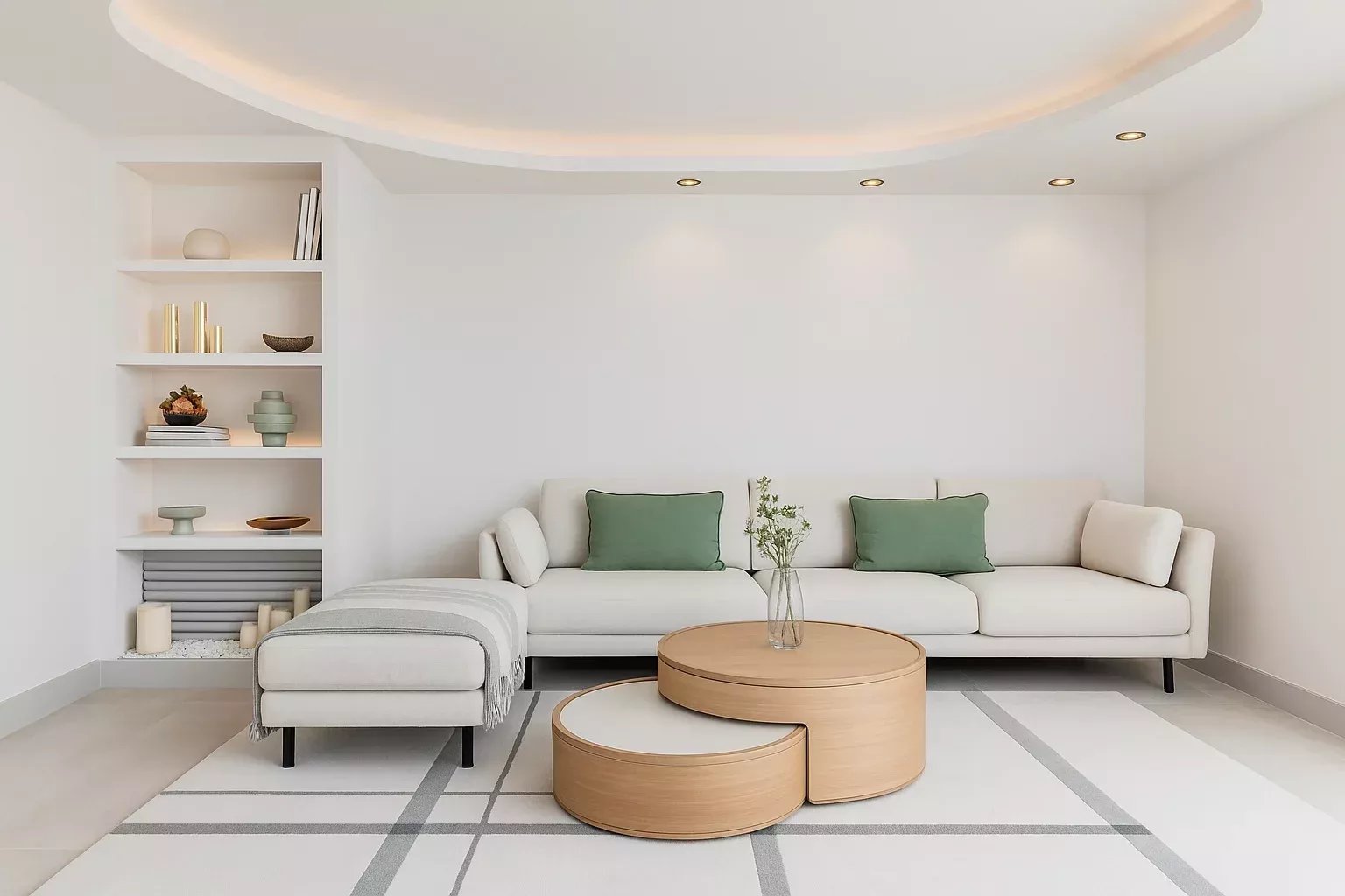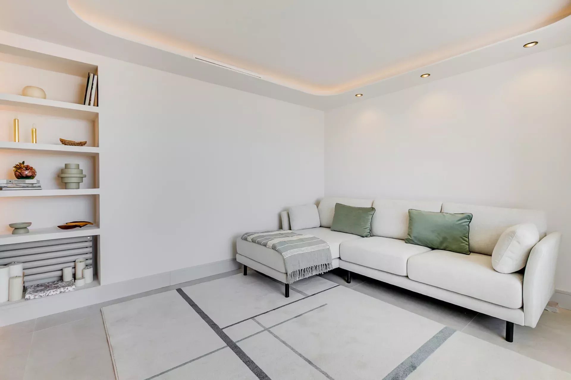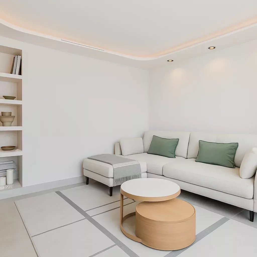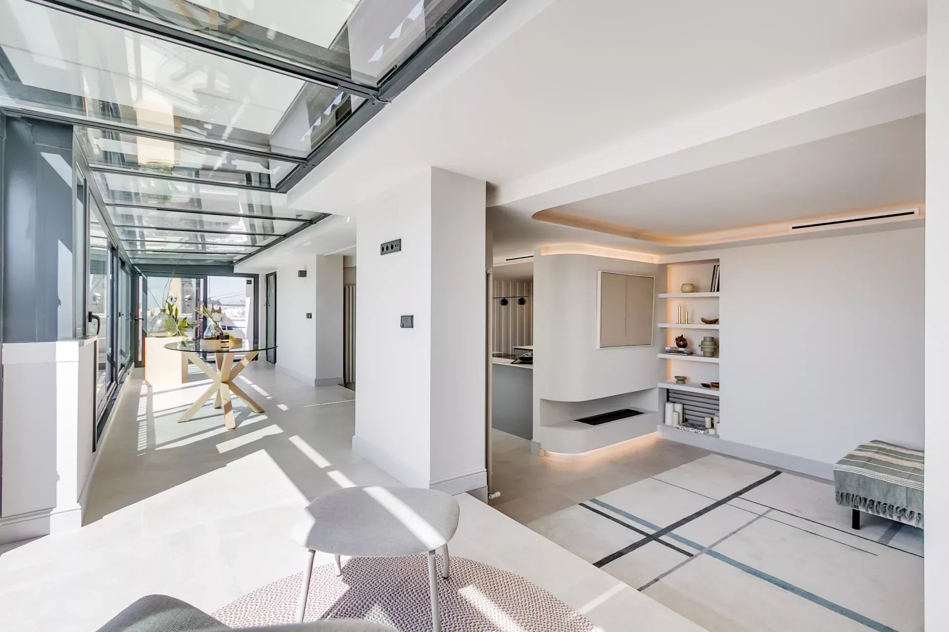 Éclairage LED réglable et plafonds à lumière indirecte.