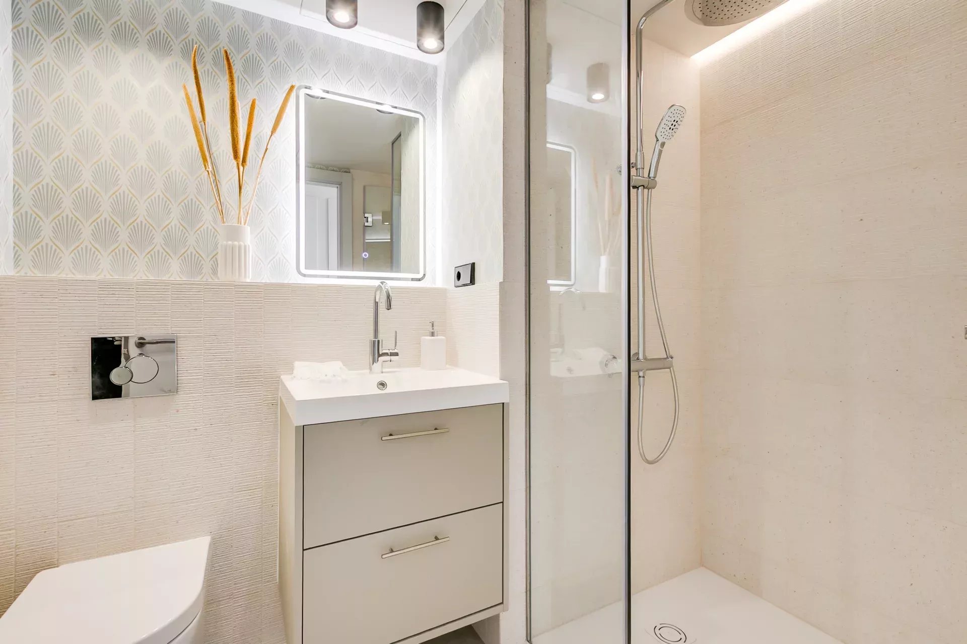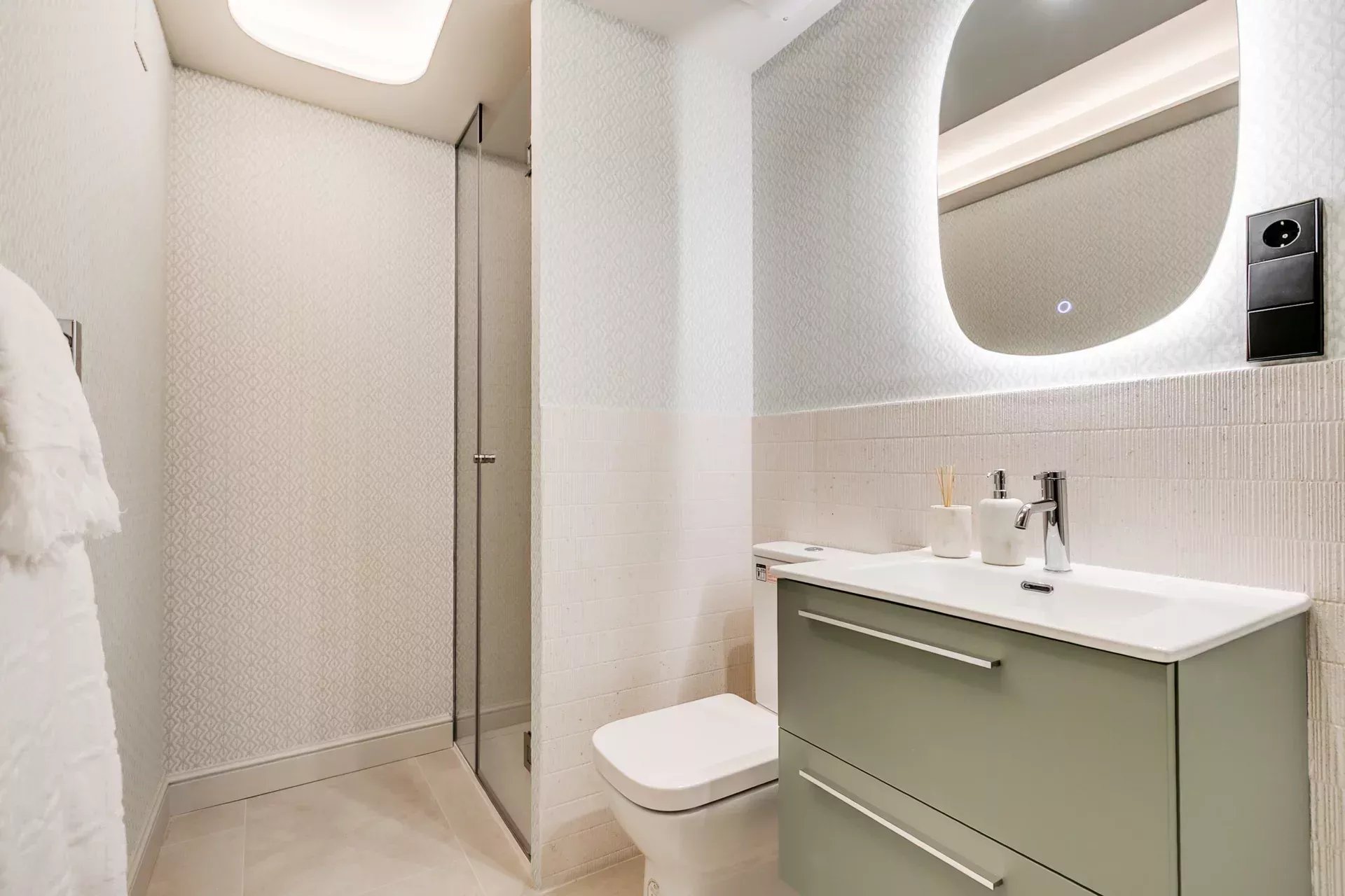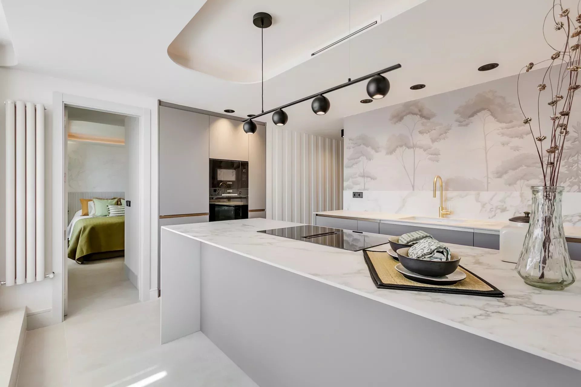 L’entrée se distingue par un vaste placard vestiaire et un éclairage indirect soigneusement conçu qui met en valeur les plafonds et crée une atmosphère sophistiquée dès les premiers instants. Le design intérieur, réalisé par un studio d’architecture et de décoration renommé, se caractérise par son esprit novateur, avec une palette de couleurs élégante, des papiers peints de créateur et des détails modernes qui confèrent à l’appartement une identité unique et contemporaine.