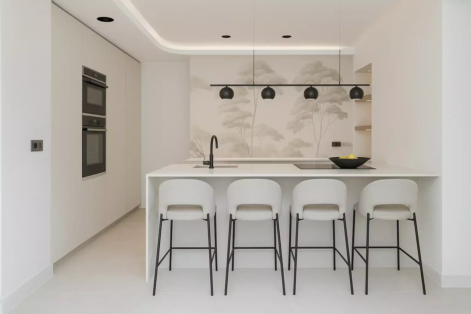 Une cuisine de design avec bar américain, équipée d’appareils électroménagers encastrés haut de gamme, de tabourets et de luminaires de créateur qui renforcent son caractère contemporain.