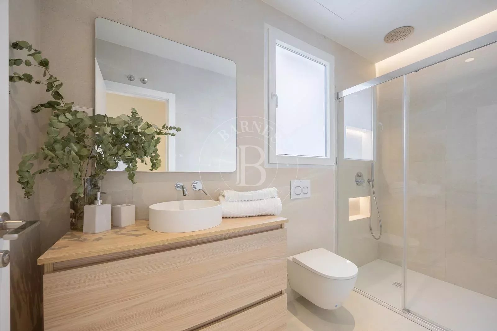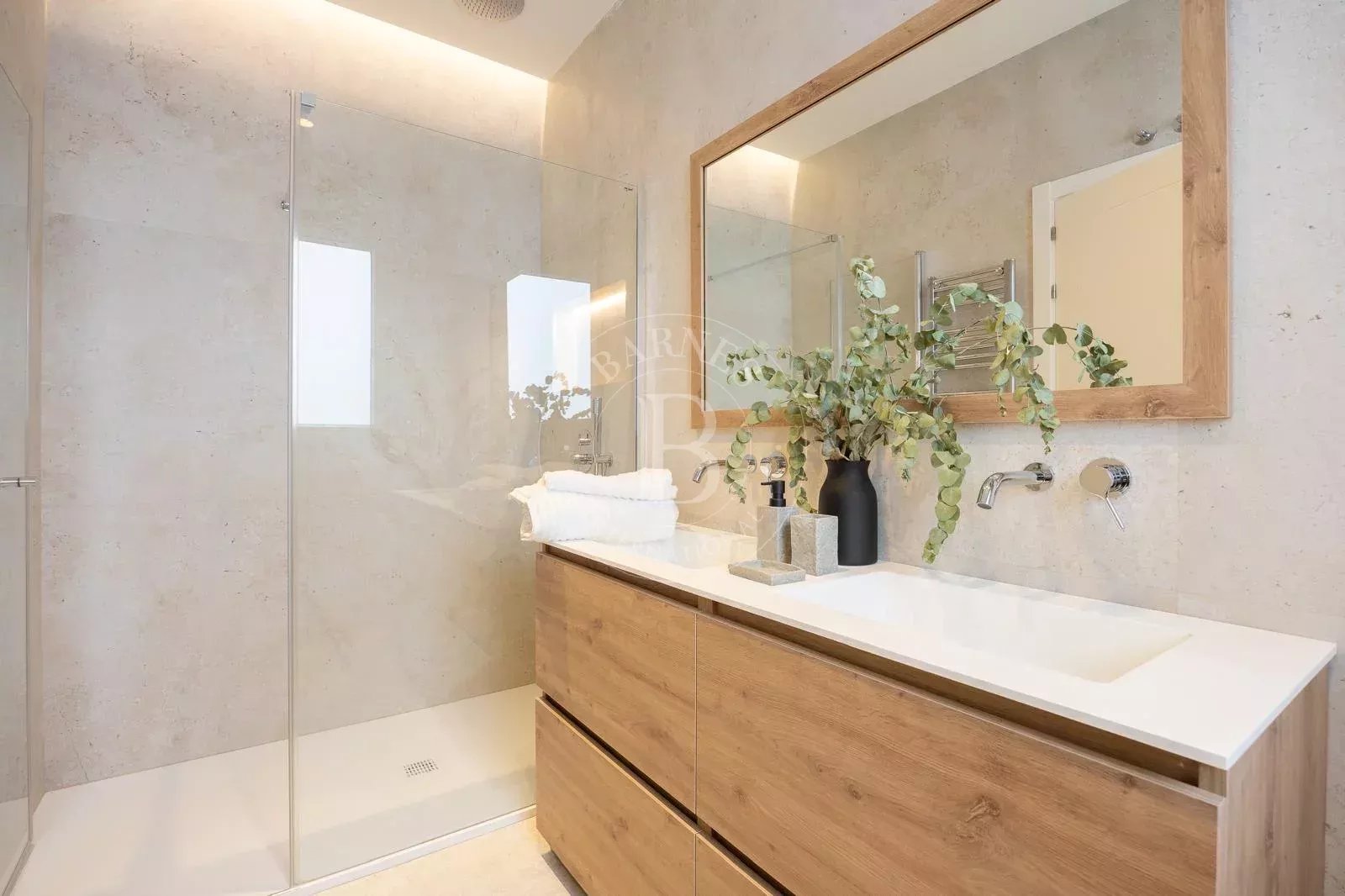 Le salon, avec sa cheminée à bois qui apporte chaleur et distinction, est complété par un élégant parquet en chêne naturel qui renforce le caractère exclusif de la maison. La cuisine haut de gamme, équipée d'appareils électroménagers BOSCH, dispose d'un îlot central recouvert de Neolith, idéal pour profiter de moments gastronomiques et conviviaux. De plus, les meubles de salle de bains sur mesure garantissent une touche d'exclusivité dans les espaces les plus privés.