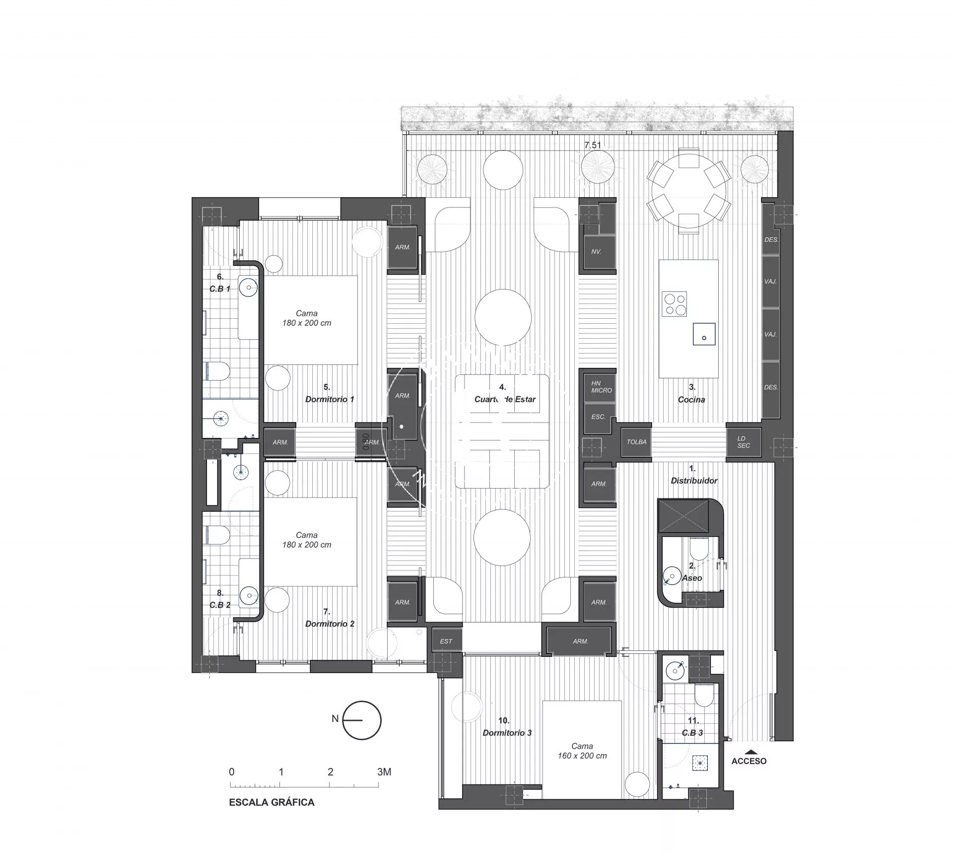 D’une superficie de 157 m², le bien se distingue par une distribution équilibrée et fonctionnelle, pensée pour optimiser le confort et la luminosité grâce à sa double orientation est-ouest. Le vaste salon-salle à manger constitue le cœur de l’appartement, avec des espaces ouverts favorisant une sensation d’amplitude et de fluidité.