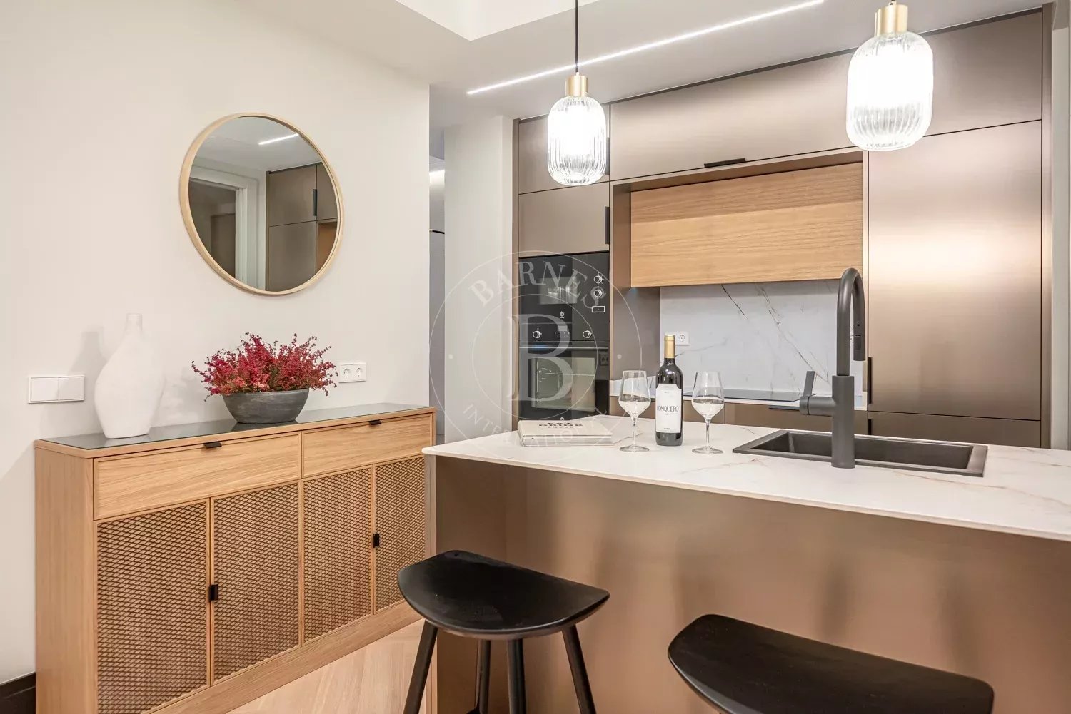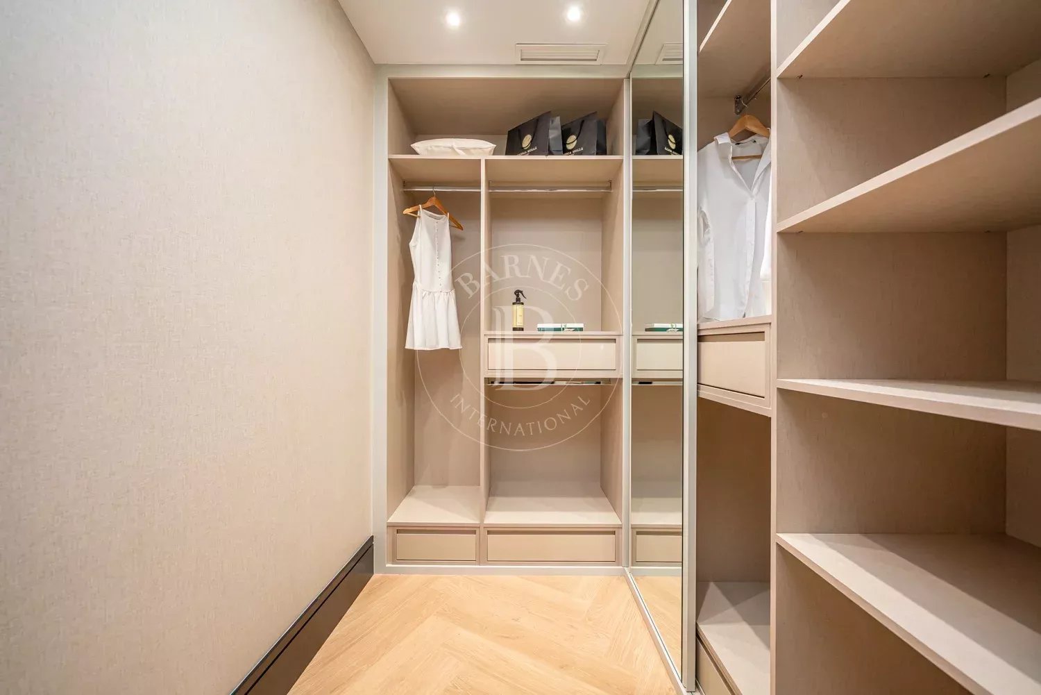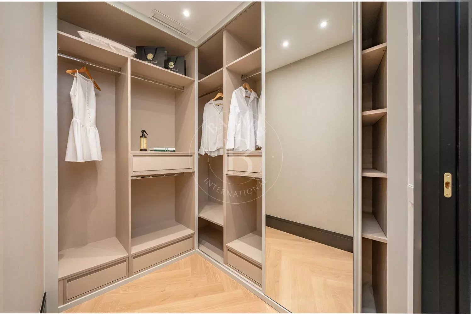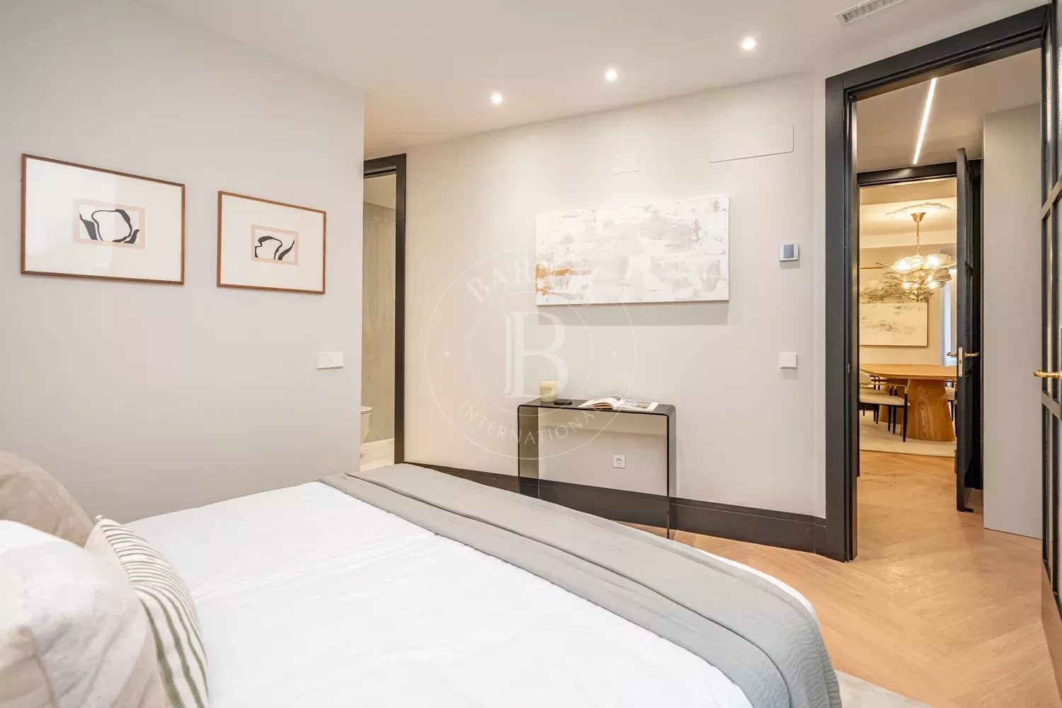 Le salon, spacieux et accueillant, est conçu pour profiter aussi bien de moments de détente que de réunions sociales, grâce à son équilibre entre confort et style contemporain. La zone privée comprend des chambres équipées d'armoires encastrées et de solutions de rangement sur mesure, qui optimisent l'espace sans renoncer à l'esthétique. Les salles de bains, au design impeccable, intègrent des matériaux nobles et un éclairage soigné qui rehausse leur caractère exclusif.