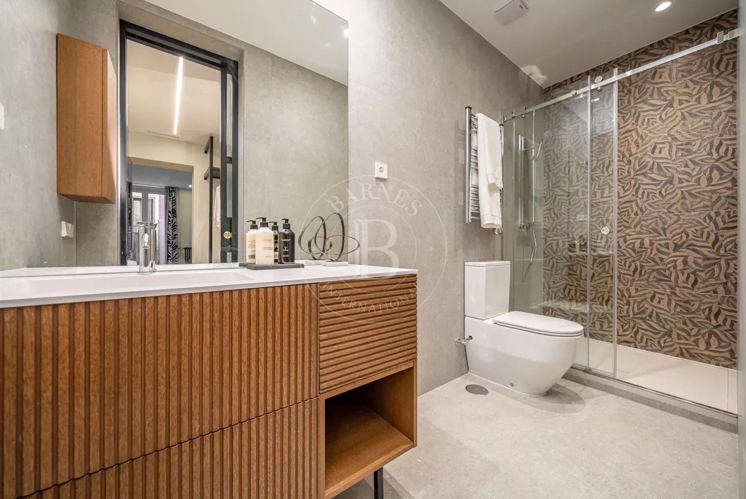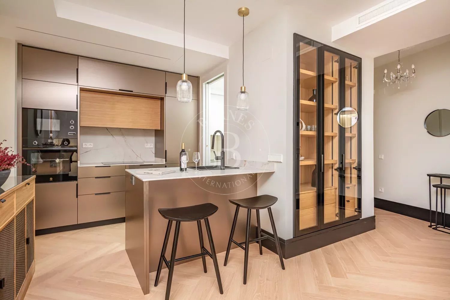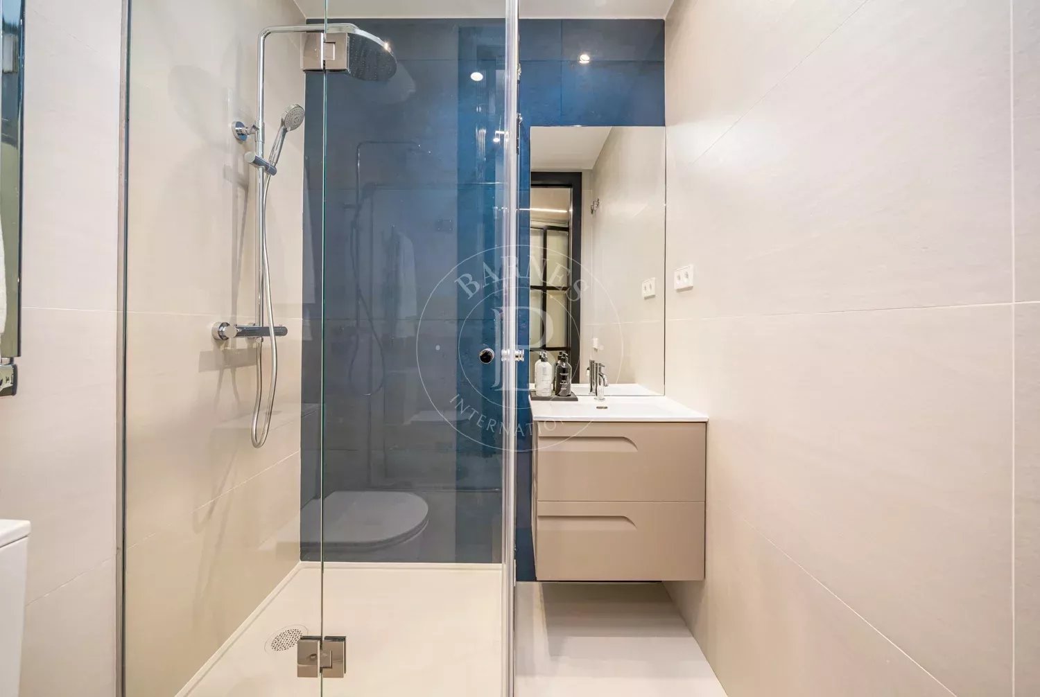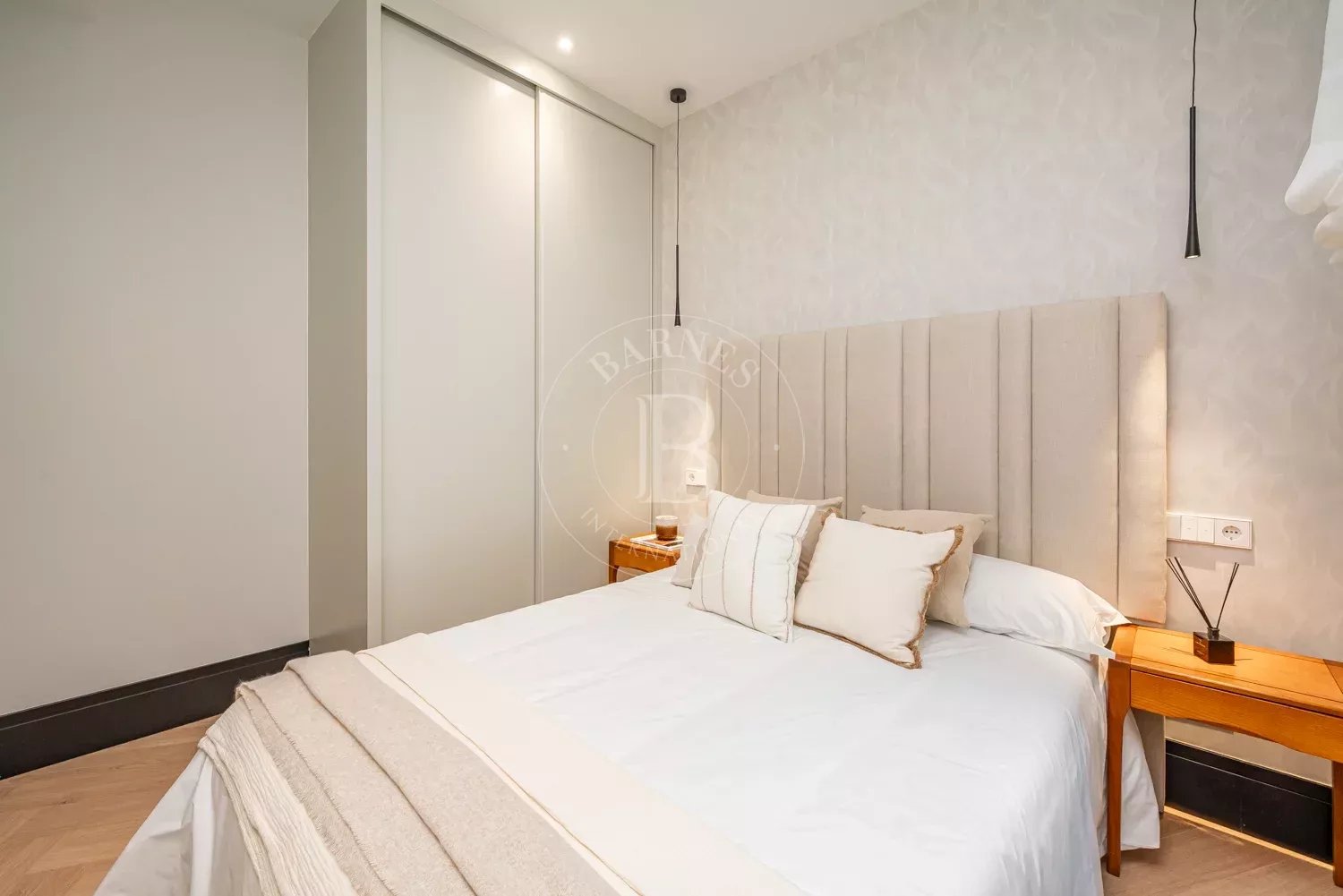 Le salon, spacieux et accueillant, est conçu pour profiter aussi bien de moments de détente que de réunions sociales, grâce à son équilibre entre confort et style contemporain. La zone privée comprend des chambres équipées d'armoires encastrées et de solutions de rangement sur mesure, qui optimisent l'espace sans renoncer à l'esthétique. Les salles de bains, au design impeccable, intègrent des matériaux nobles et un éclairage soigné qui rehausse leur caractère exclusif.