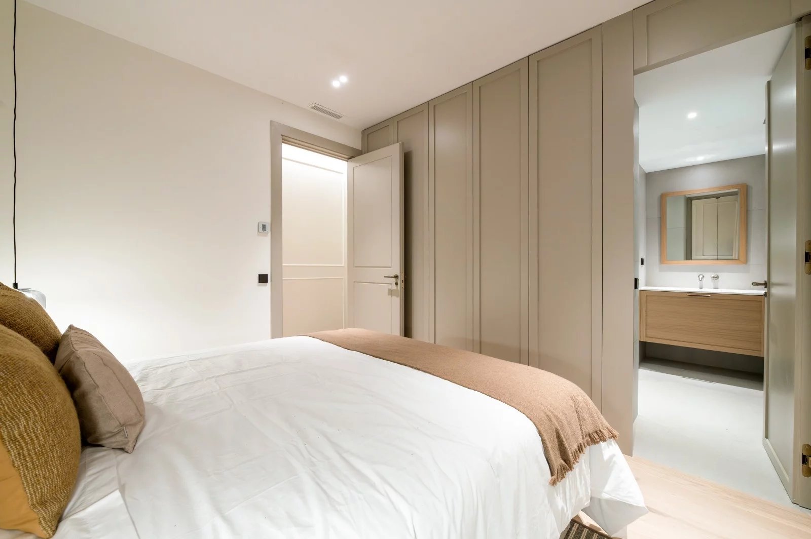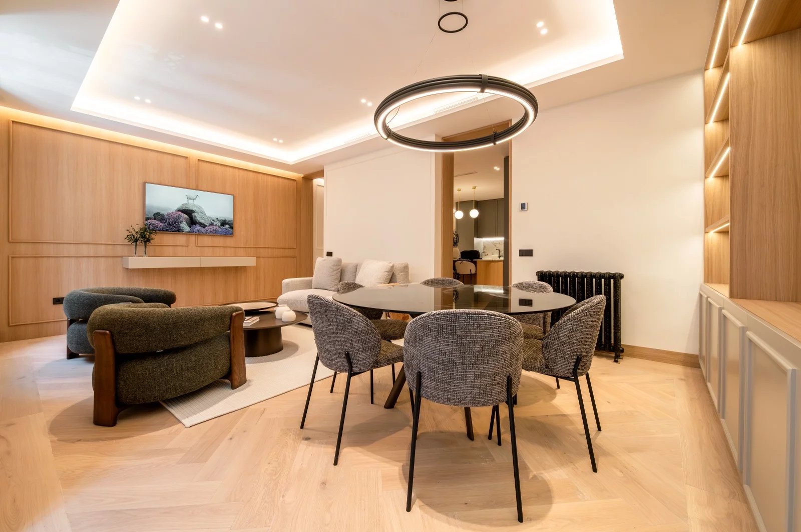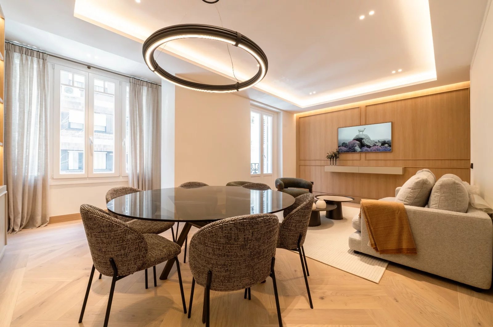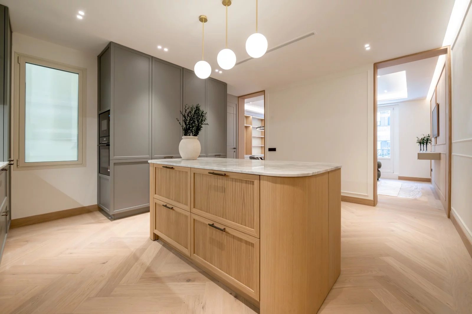 Appartement de 167 m² entièrement rénové avec une qualité exceptionnelle, situé au premier étage élevé, côté rue, d'un immeuble distingué du quartier de Salamanque. Le bien a été conçu avec une philosophie de vie moderne et sophistiquée, en accordant une attention particulière aux matériaux, à la lumière et à la fonctionnalité de chaque espace. Il comprend trois chambres en suite, chacune avec sa propre salle de bain privée, ainsi qu'un WC visiteurs. La chambre principale se distingue par son élégant dressing intégré, transformant la zone de repos en un véritable espace de bien-être. La zone de vie, composée d'un lumineux salon-salle à manger orienté sur la rue, est complétée par une cuisine design ouverte, équipée d'un îlot central en bois naturel et d'un plan de travail en marbre — des finitions qui associent l'esthétique contemporaine à la chaleur des matériaux naturels. Le parquet en chevrons, l'éclairage indirect périphérique et la menuiserie laquée sur mesure confèrent à l'ensemble une élégance sobre et intemporelle. L'appartement dispose également de la climatisation, du double vitrage, de volets électriques et d'un visiophone.