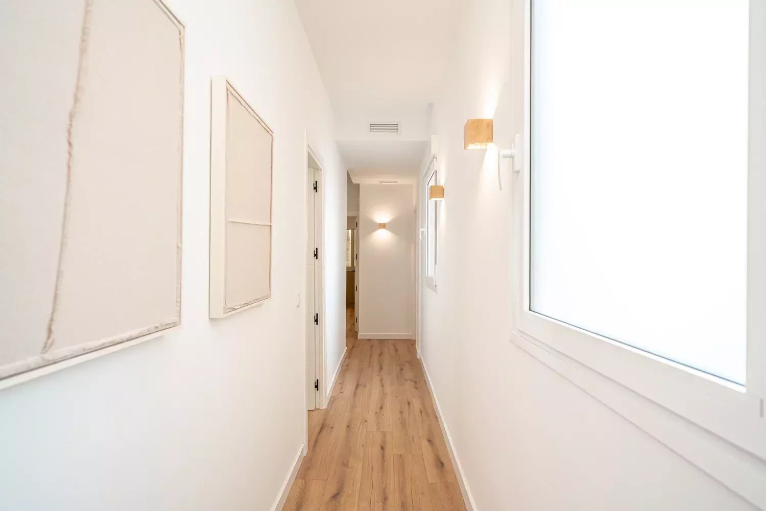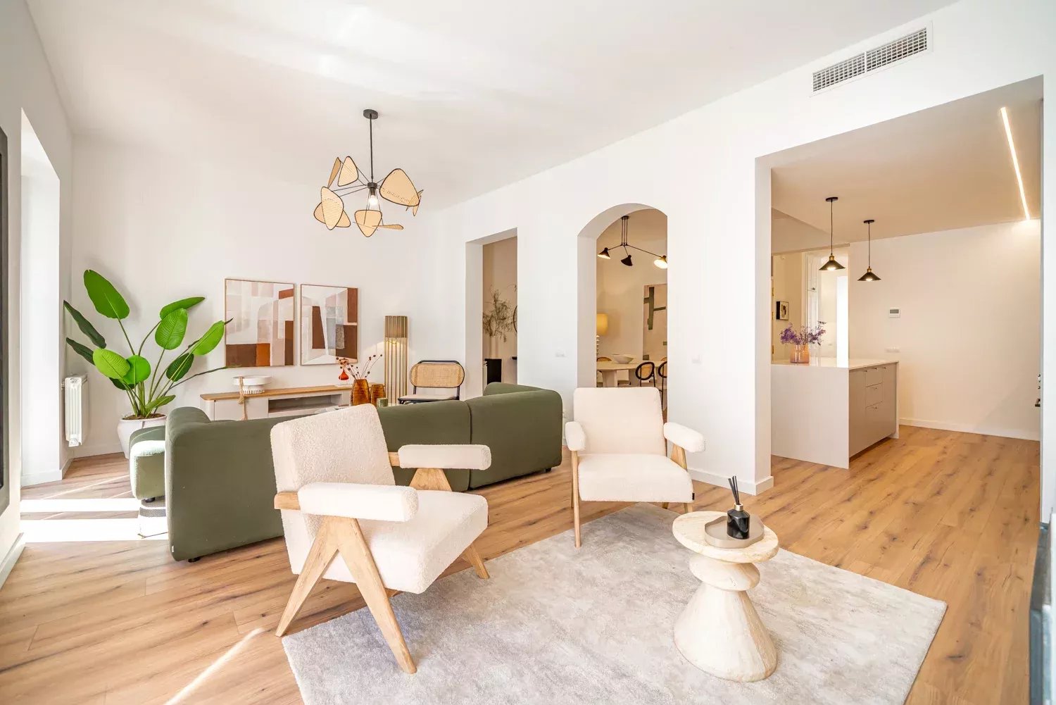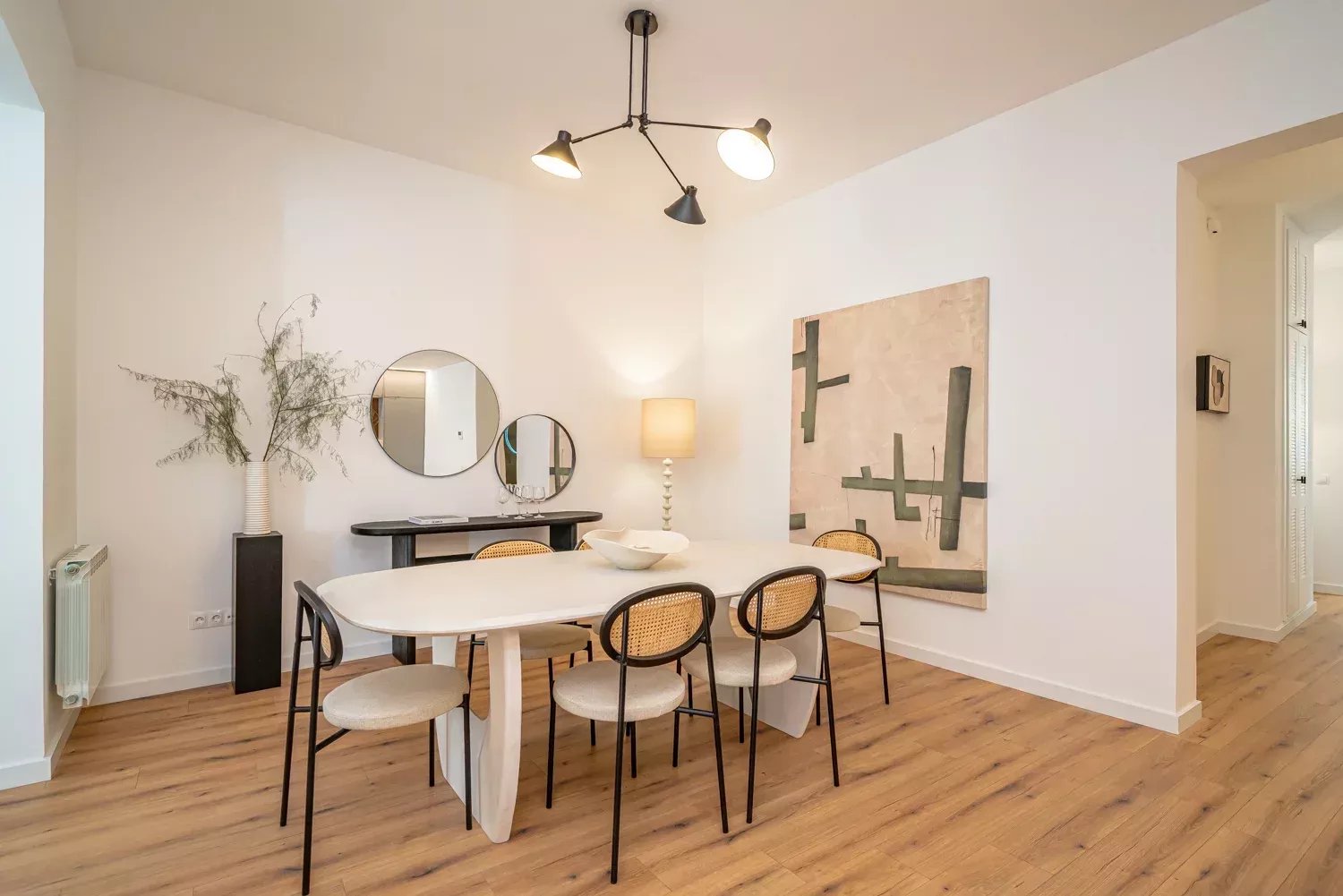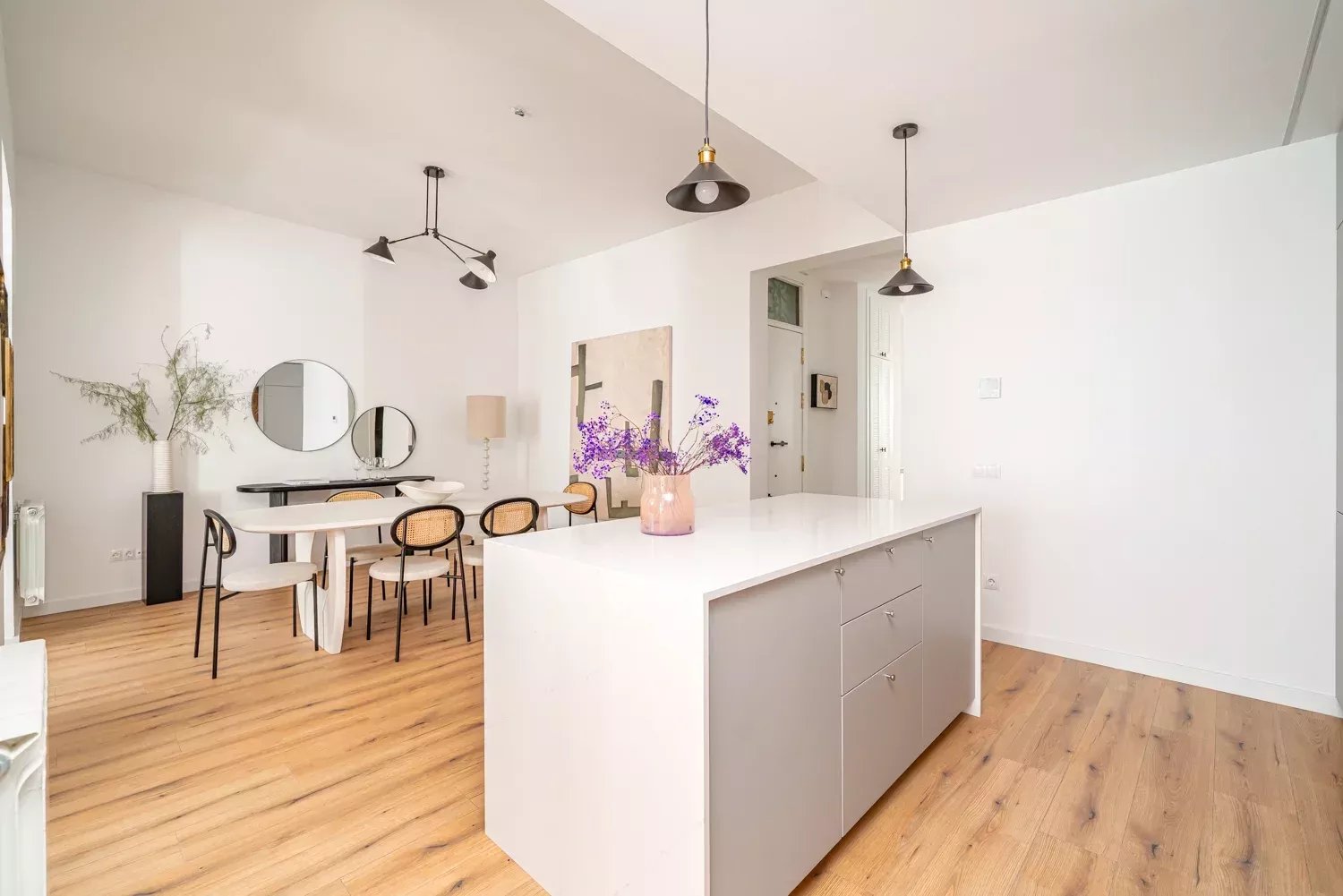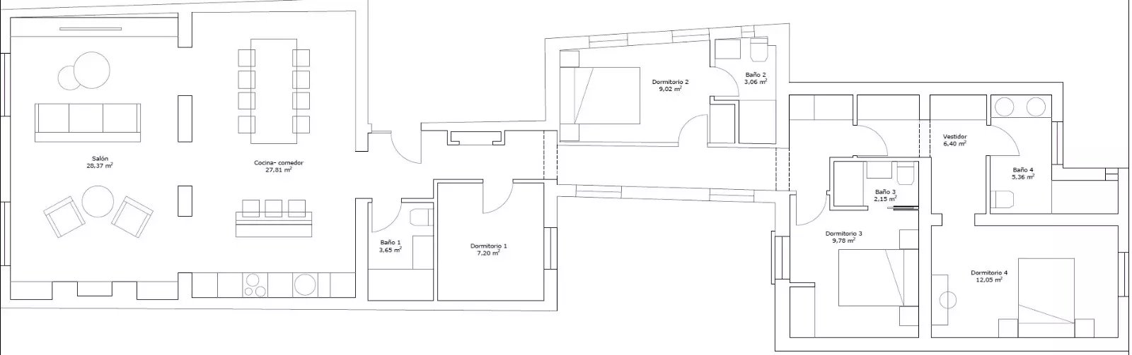 Situé au troisième étage d'un immeuble classique rénové, le bien se distingue par son élégance et la luminosité apportée par ses deux balcons donnant sur la rue. L'appartement a été rénové avec des matériaux de première qualité, en soignant chaque détail pour garantir fonctionnalité et confort. Il dispose d'un grand salon avec une cuisine design intégrée, de quatre chambres aux dimensions généreuses, de quatre salles de bains complètes en suite et d'un WC supplémentaire, ce qui lui confère une grande indépendance et un grand confort. La climatisation par conduits et les menuiseries haut de gamme garantissent une excellente performance énergétique et une atmosphère confortable tout au long de l'année.