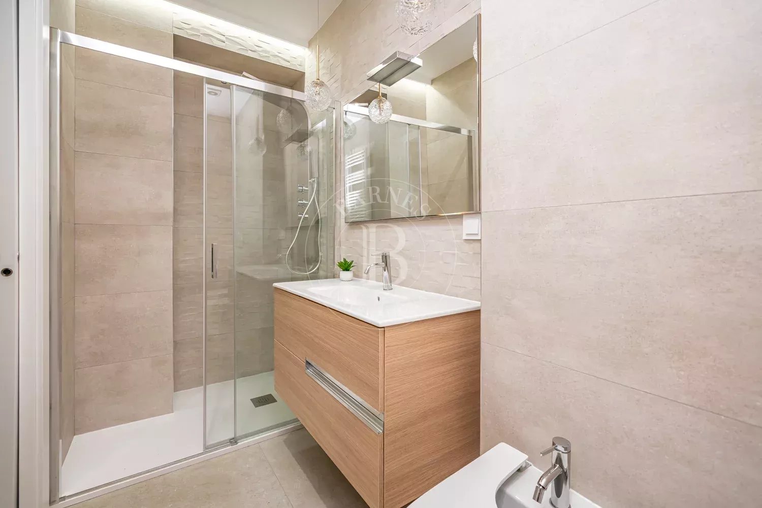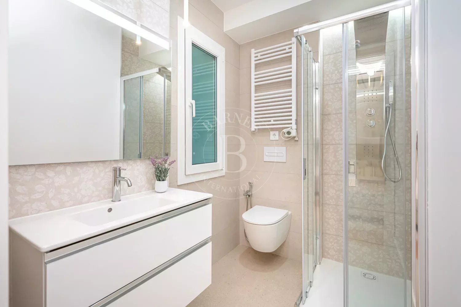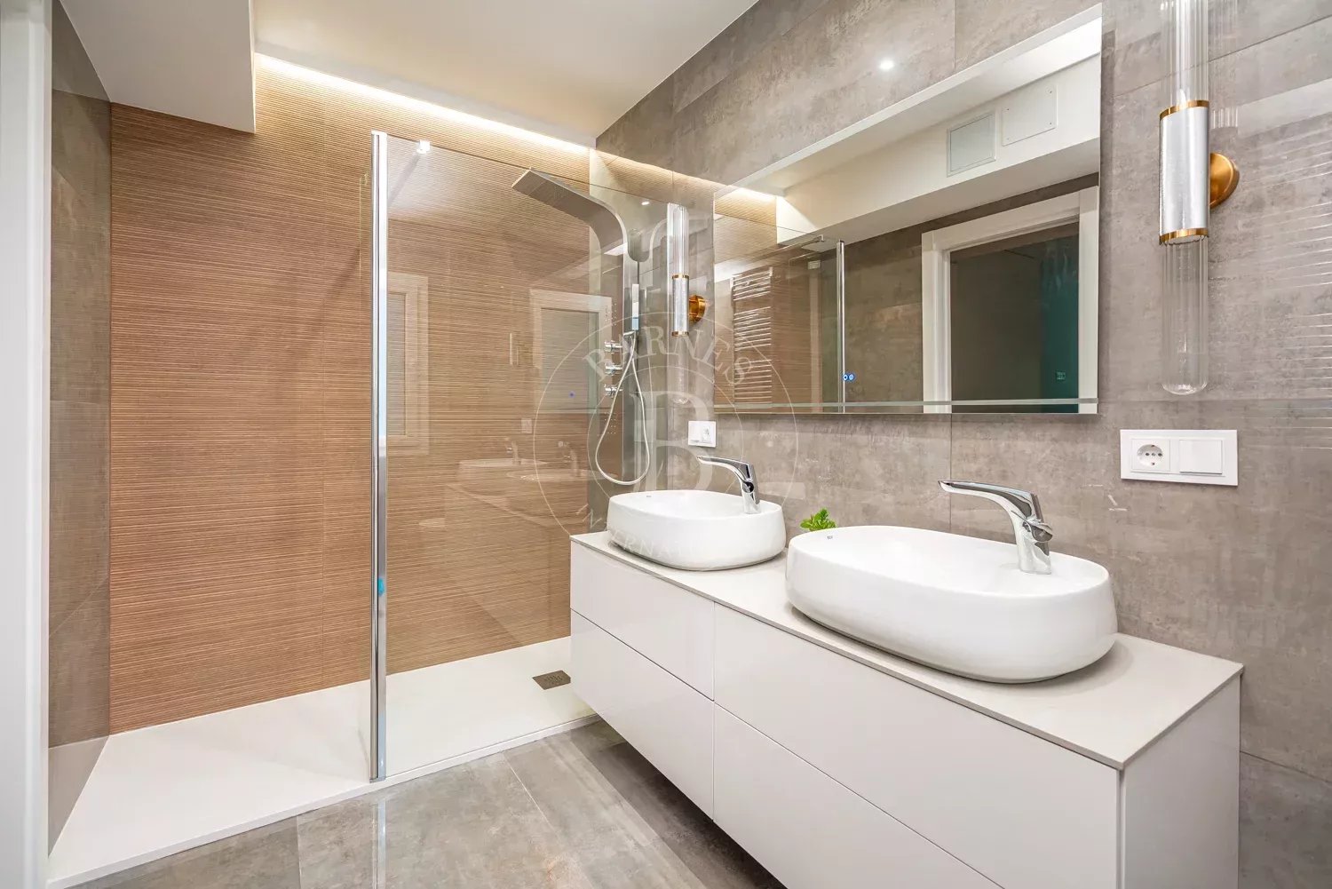 Chacune des trois chambres dispose de sa propre salle de bains, une rareté dans les appartements classiques du quartier. La suite parentale comprend un espace dressing et une salle de bains double vasque avec douche à l’italienne, finitions en pierre naturelle et robinetterie en laiton. Les deux autres chambres bénéficient du même soin du détail. Une salle d’eau supplémentaire pour les invités, un espace buanderie séparé et des rangements intégrés viennent parfaire l’agencement.