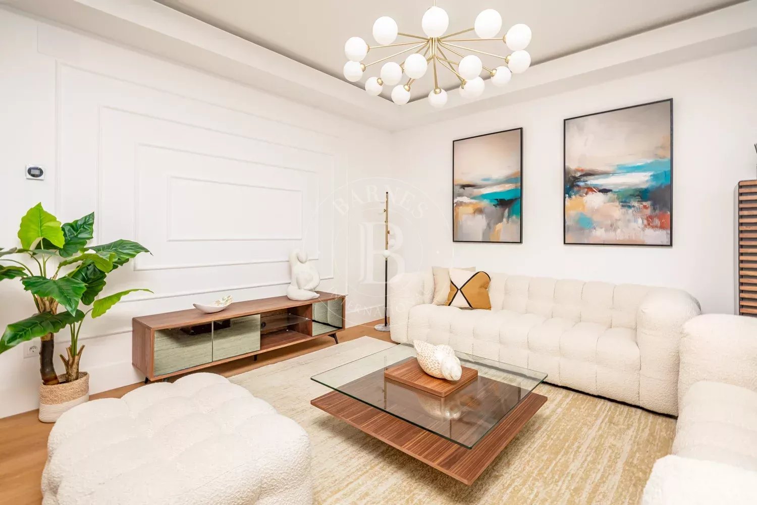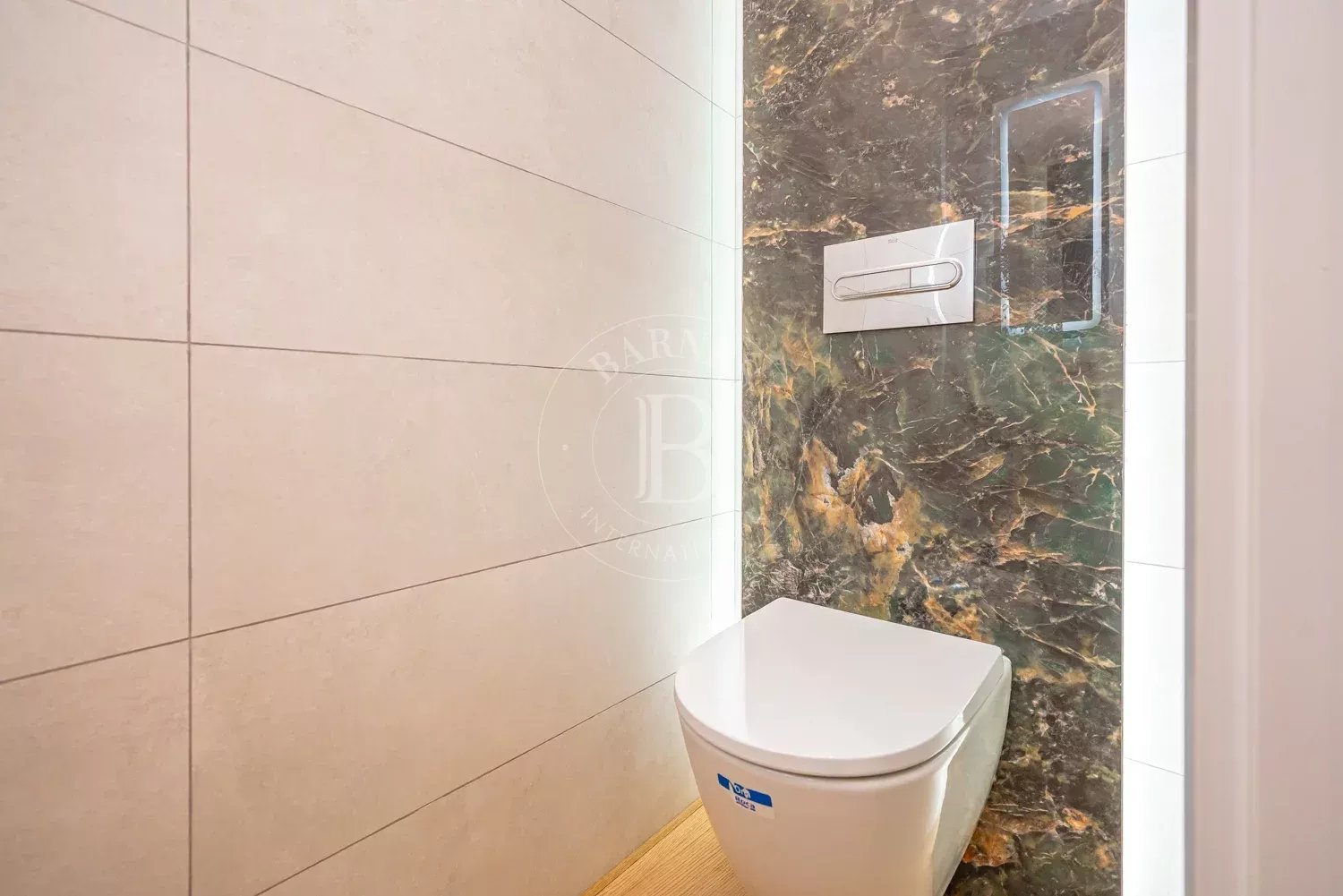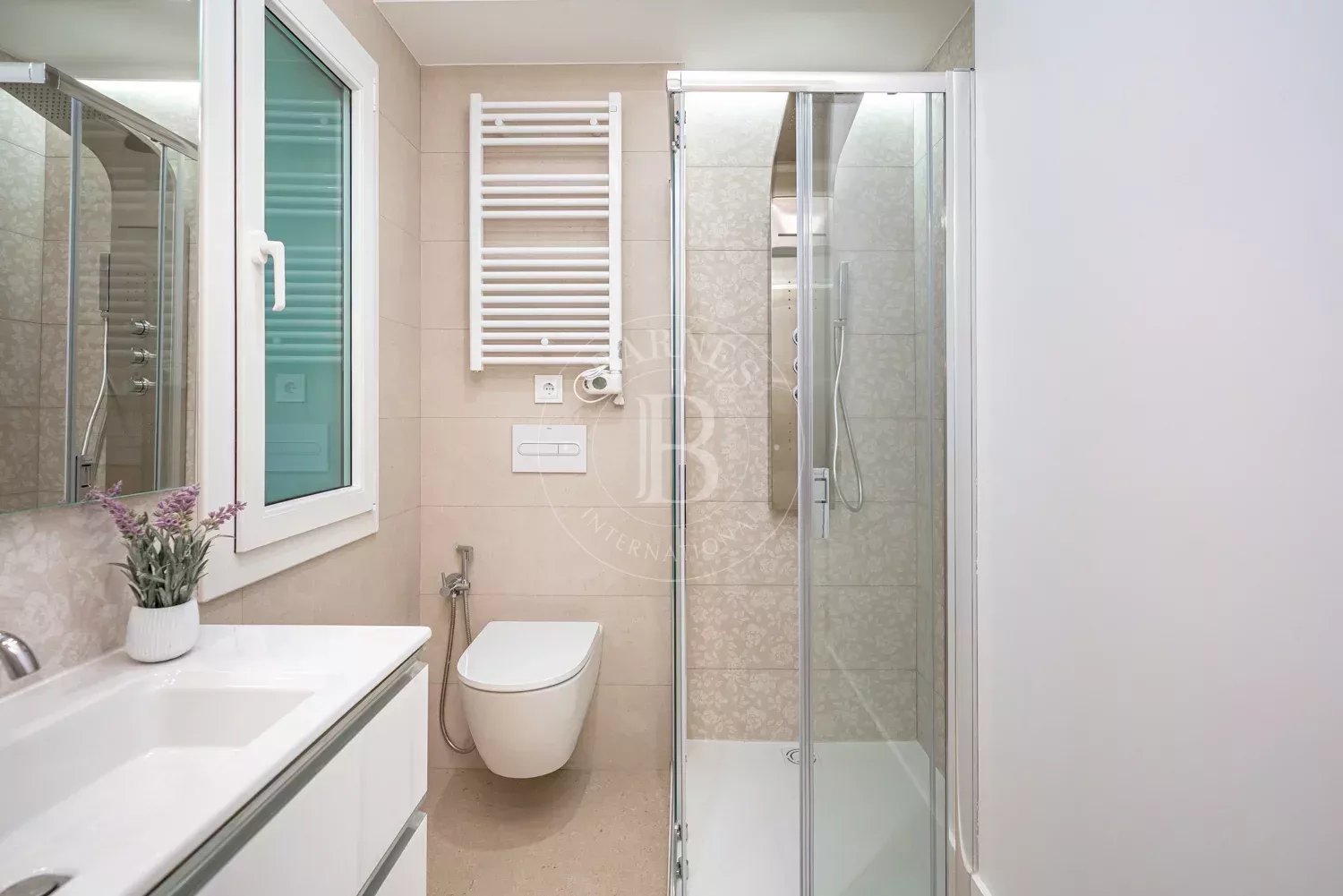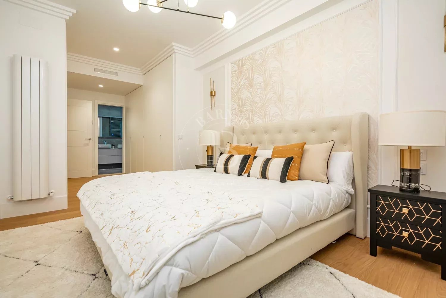Chacune des trois chambres dispose de sa propre salle de bains, une rareté dans les appartements classiques du quartier. La suite parentale comprend un espace dressing et une salle de bains double vasque avec douche à l’italienne, finitions en pierre naturelle et robinetterie en laiton. Les deux autres chambres bénéficient du même soin du détail. Une salle d’eau supplémentaire pour les invités, un espace buanderie séparé et des rangements intégrés viennent parfaire l’agencement.