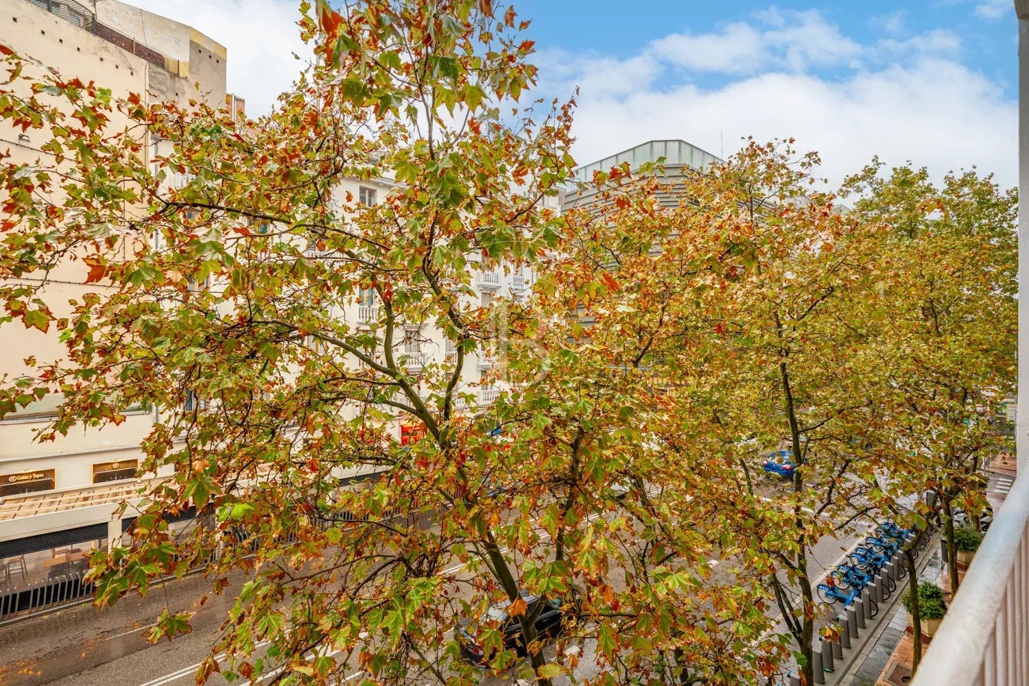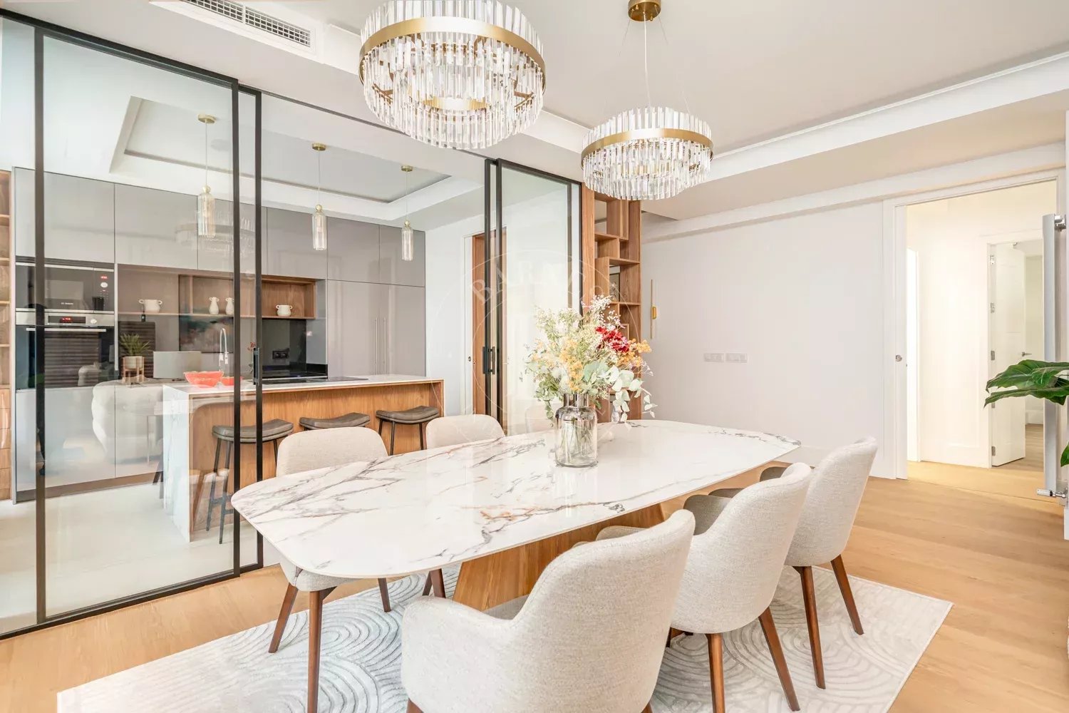 Ce qui rend ce bien vraiment exceptionnel, c’est sa configuration en angle, permettant à la lumière naturelle de pénétrer à toute heure du jour grâce à une double orientation et des baies toute hauteur. Dès l’entrée, un vestibule habillé de boiseries sur mesure en noyer donne le ton, menant à un vaste séjour-salle à manger où les matériaux nobles — parquet en chêne clair, plafonds hauts, luminaires sculpturaux — créent une ambiance élégante, fluide et intemporelle.
