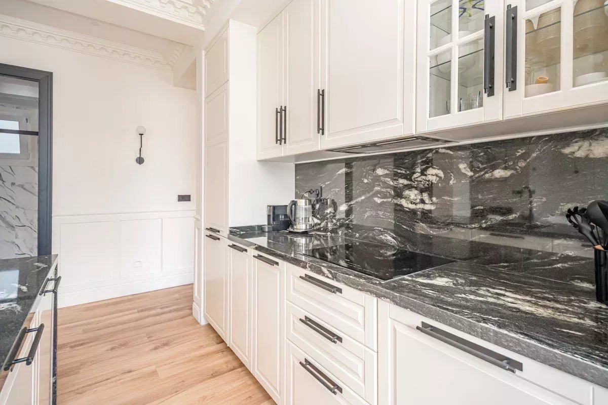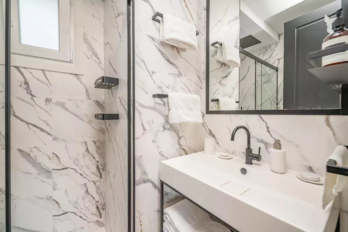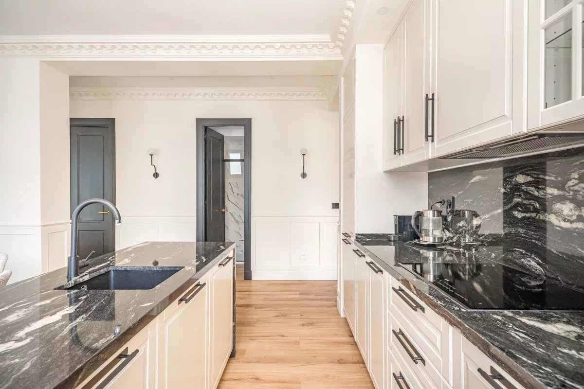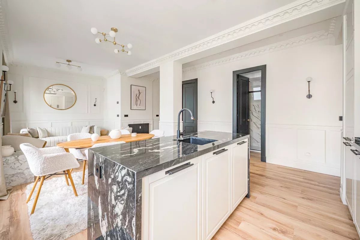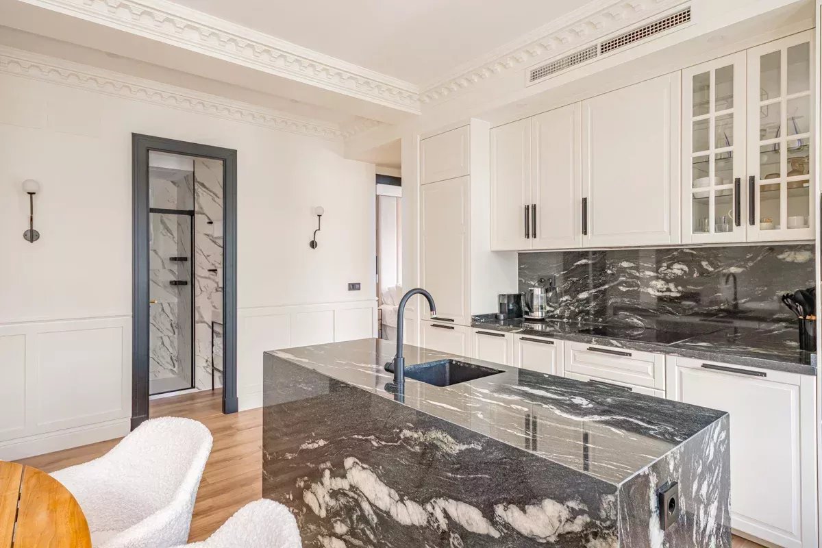 Le salon-salle à manger spacieux et lumineux s’intègre parfaitement à une cuisine design contemporaine avec des finitions haut de gamme en pierre naturelle. Chaque espace a été pensé pour créer une atmosphère élégante et fonctionnelle.