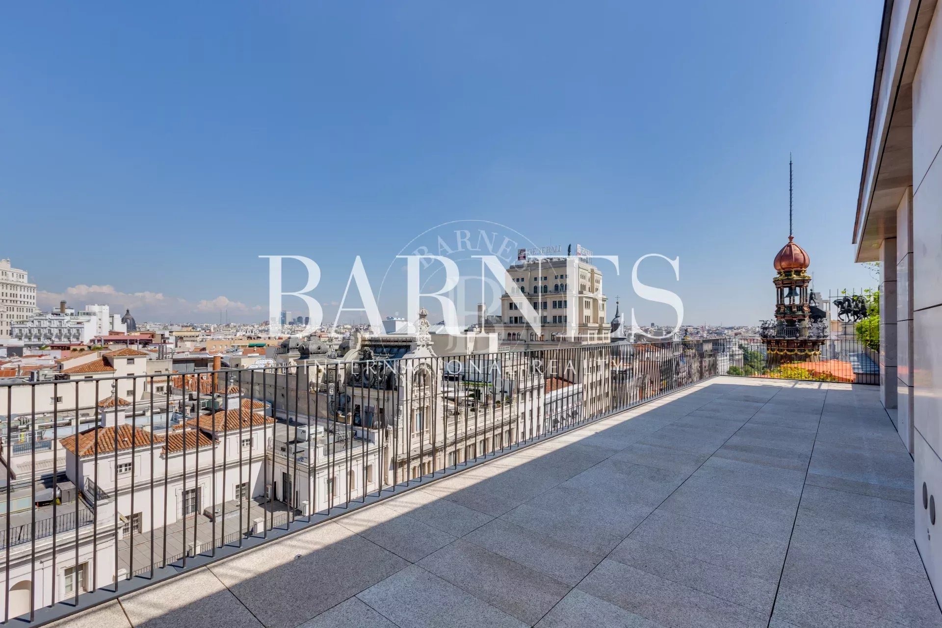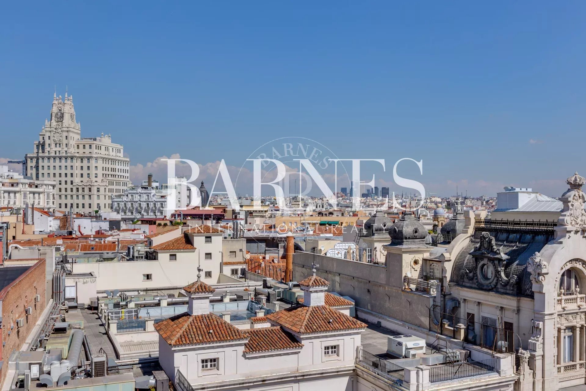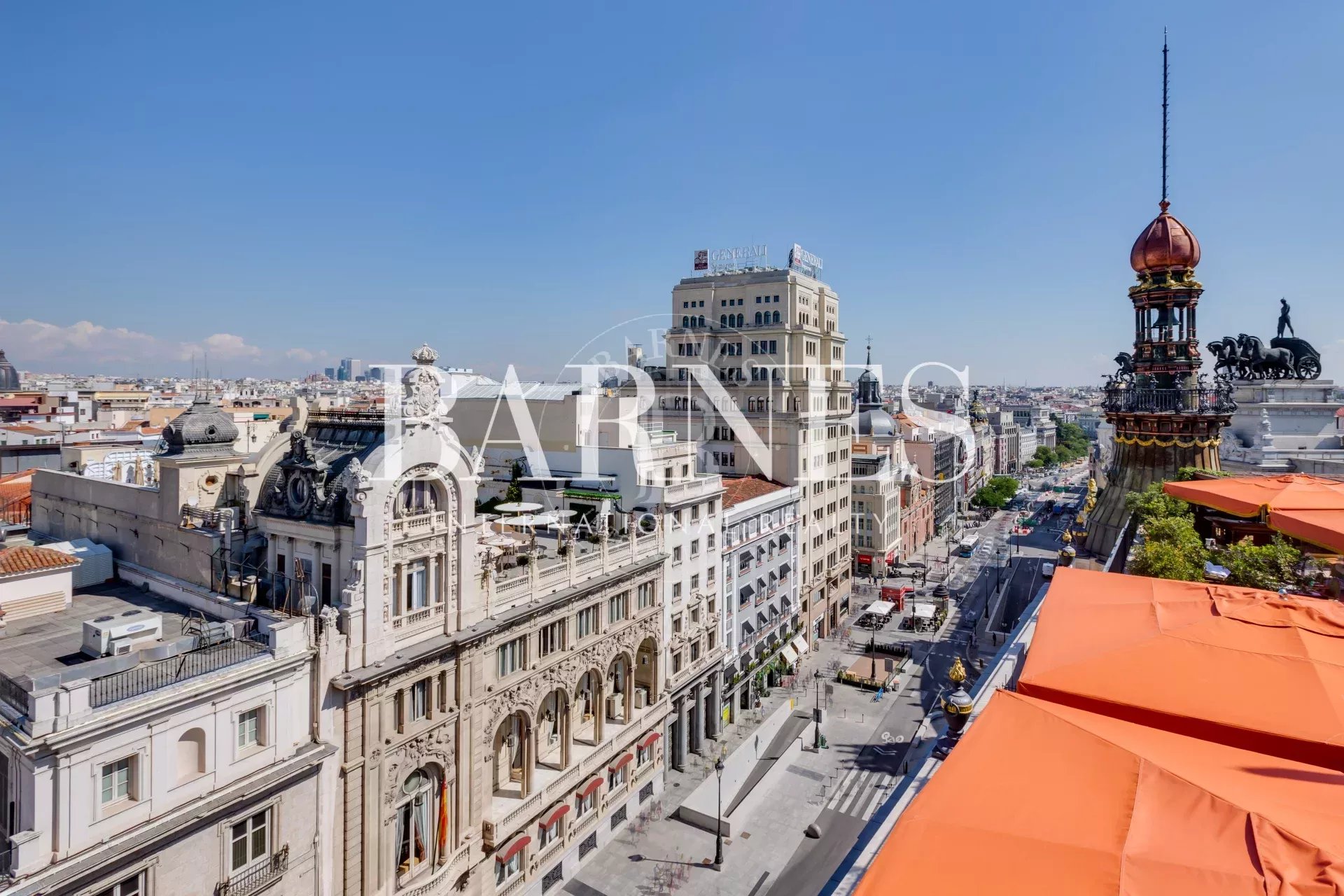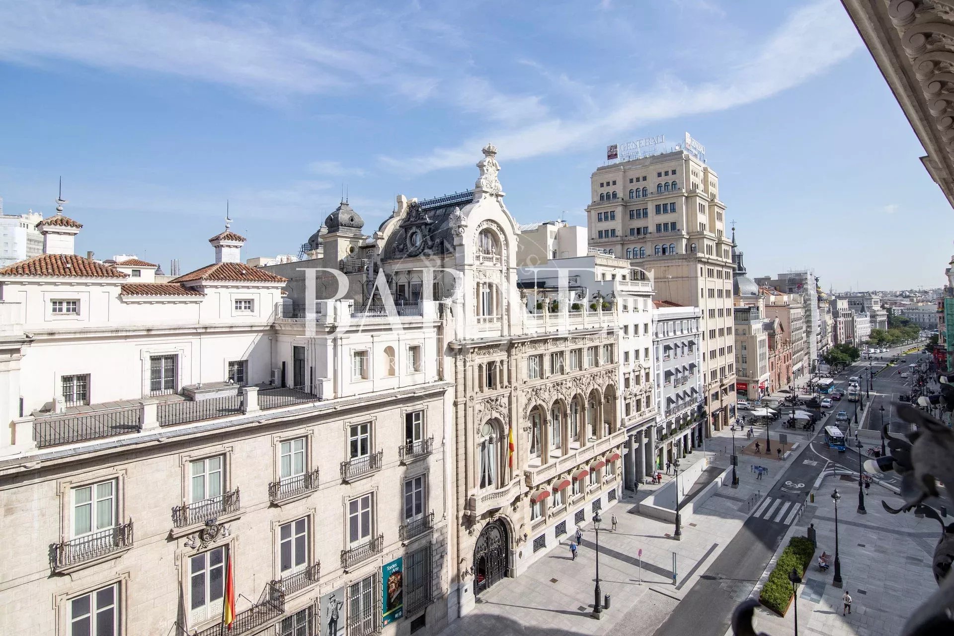 Depuis le hall d’entrée avec placards intégrés, on accède à un vaste salon–salle à manger doté de grandes baies vitrées offrant une vue spectaculaire sur la Calle Alcalá et son architecture emblématique.