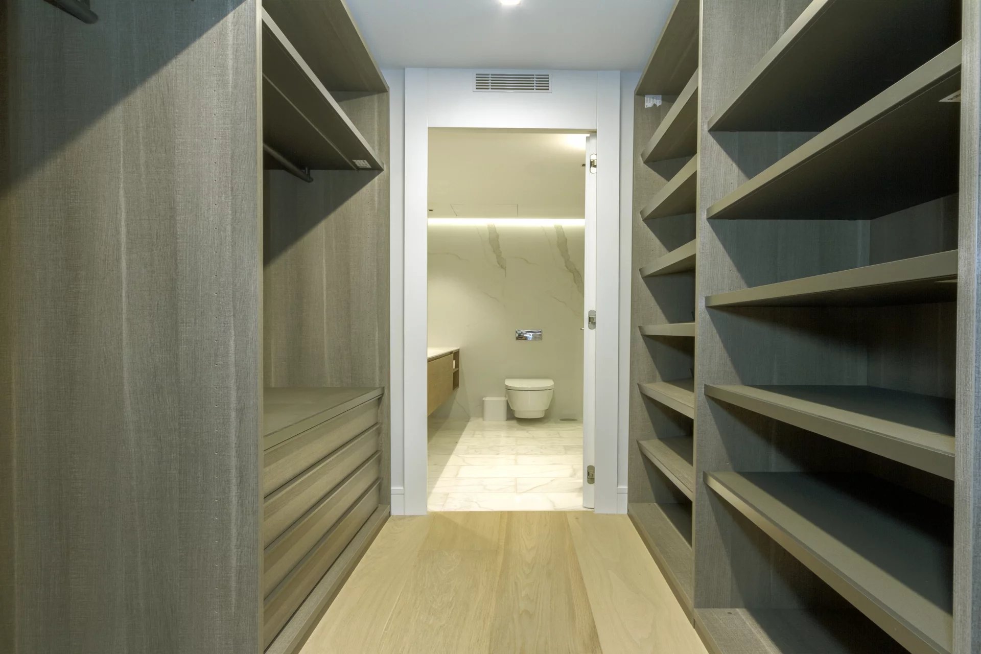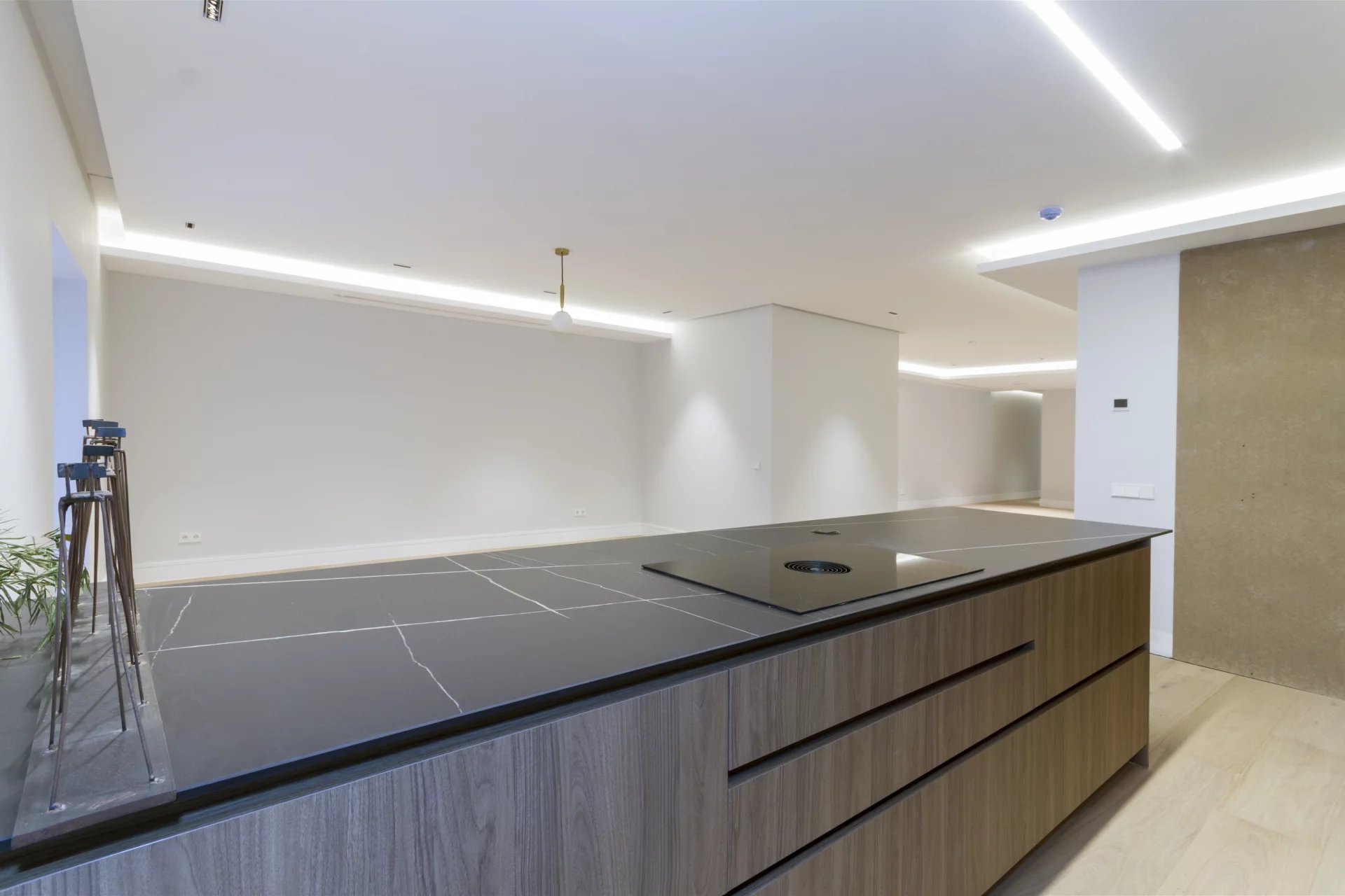 La distribution commence par un élégant hall d’entrée menant à un vaste salon, bénéficiant de trois balcons extérieurs offrant une belle luminosité. La salle à manger, également extérieure, complète l’espace de réception aux côtés d’une spectaculaire cuisine design, équipée de mobilier haut de gamme Moldulnova et Santos, et d’électroménagers professionnels Gaggenau.