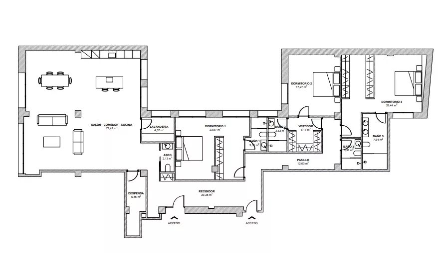 La superficie totale de l'appartement, enregistrée dans l'acte notarié, est de 280 m², dont 242 m² correspondent à la superficie utile de l'appartement et 38 m² aux parties communes. La distribution actuelle comprend un grand salon-salle à manger extérieur orienté au sud, avec une magnifique lumière naturelle tout au long de la journée, trois chambres, trois salles de bains et une cuisine indépendante avec accès de service. Grâce à son plan rectangulaire et à l'absence quasi totale de murs porteurs, cette propriété offre un énorme potentiel de redistribution pour s'adapter à un style de vie contemporain, avec des zones jour et nuit parfaitement différenciées et de grands espaces ouverts.