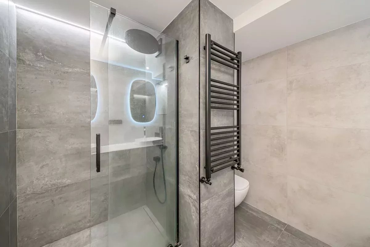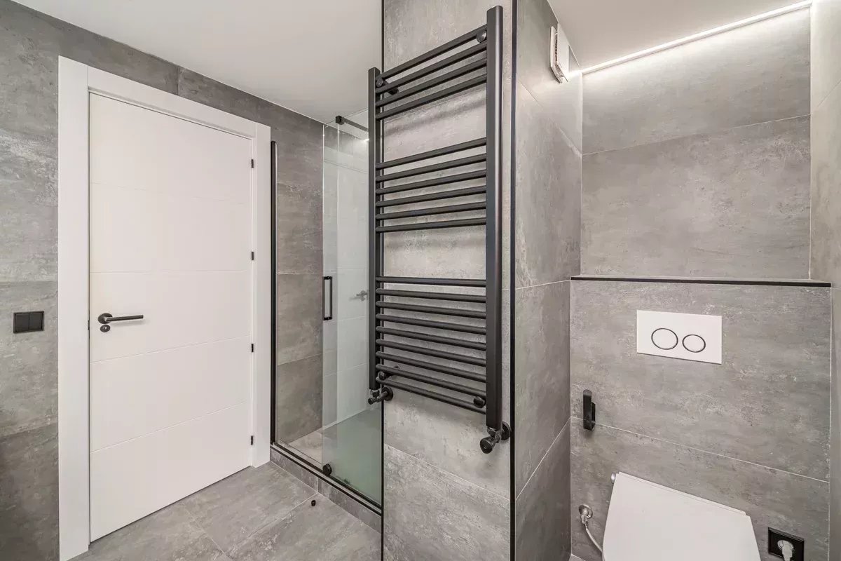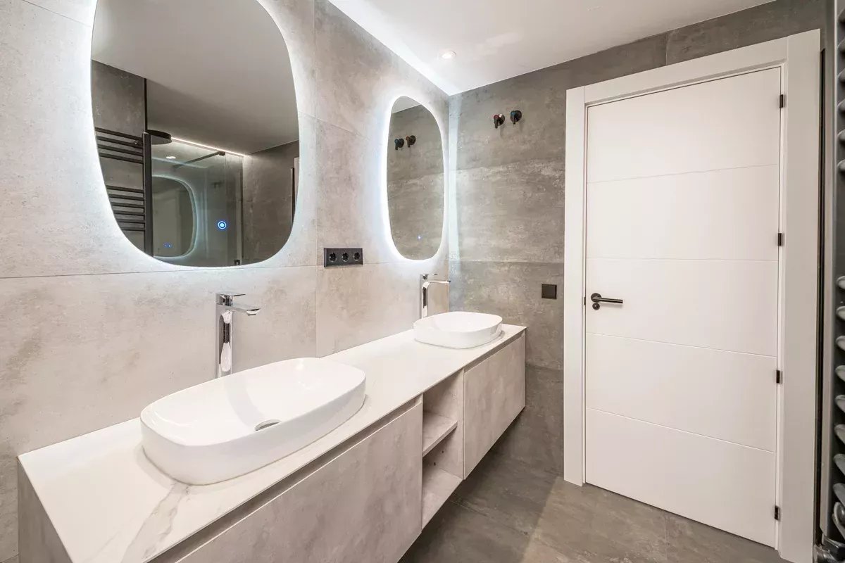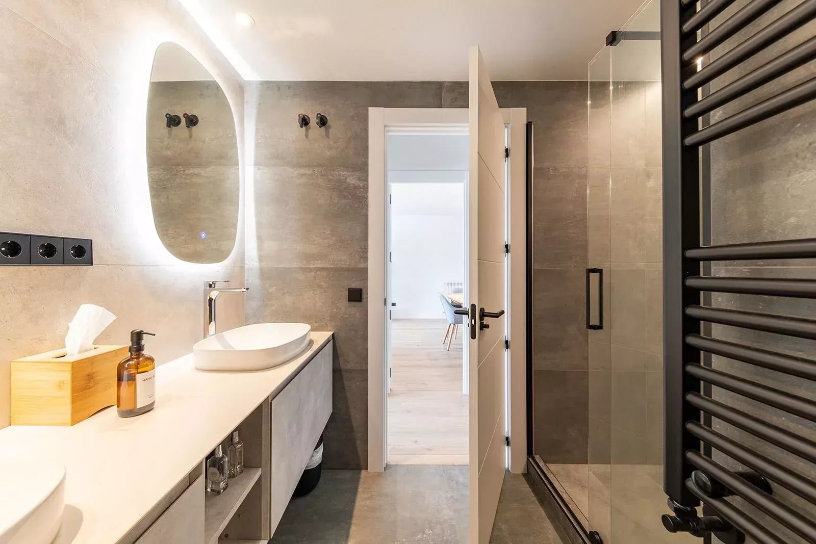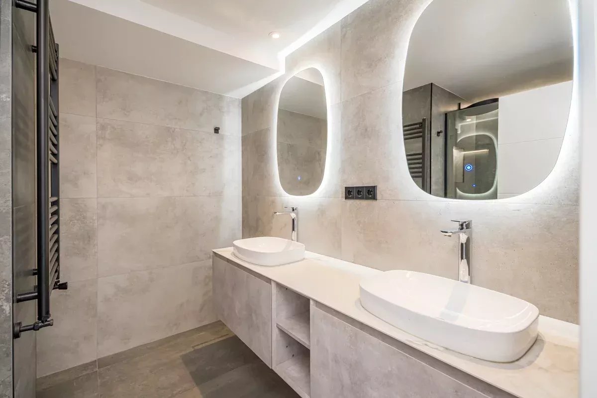 Il dispose de trois chambres avec placards intégrés et de deux salles de bains aux finitions design. La salle de bains principale comprend un double lavabo, des miroirs anti-buée, un extracteur d’humidité, une douche effet pluie et un WC japonais avec contrôle de la température.