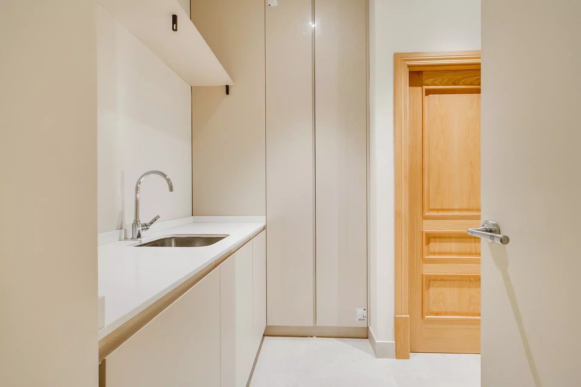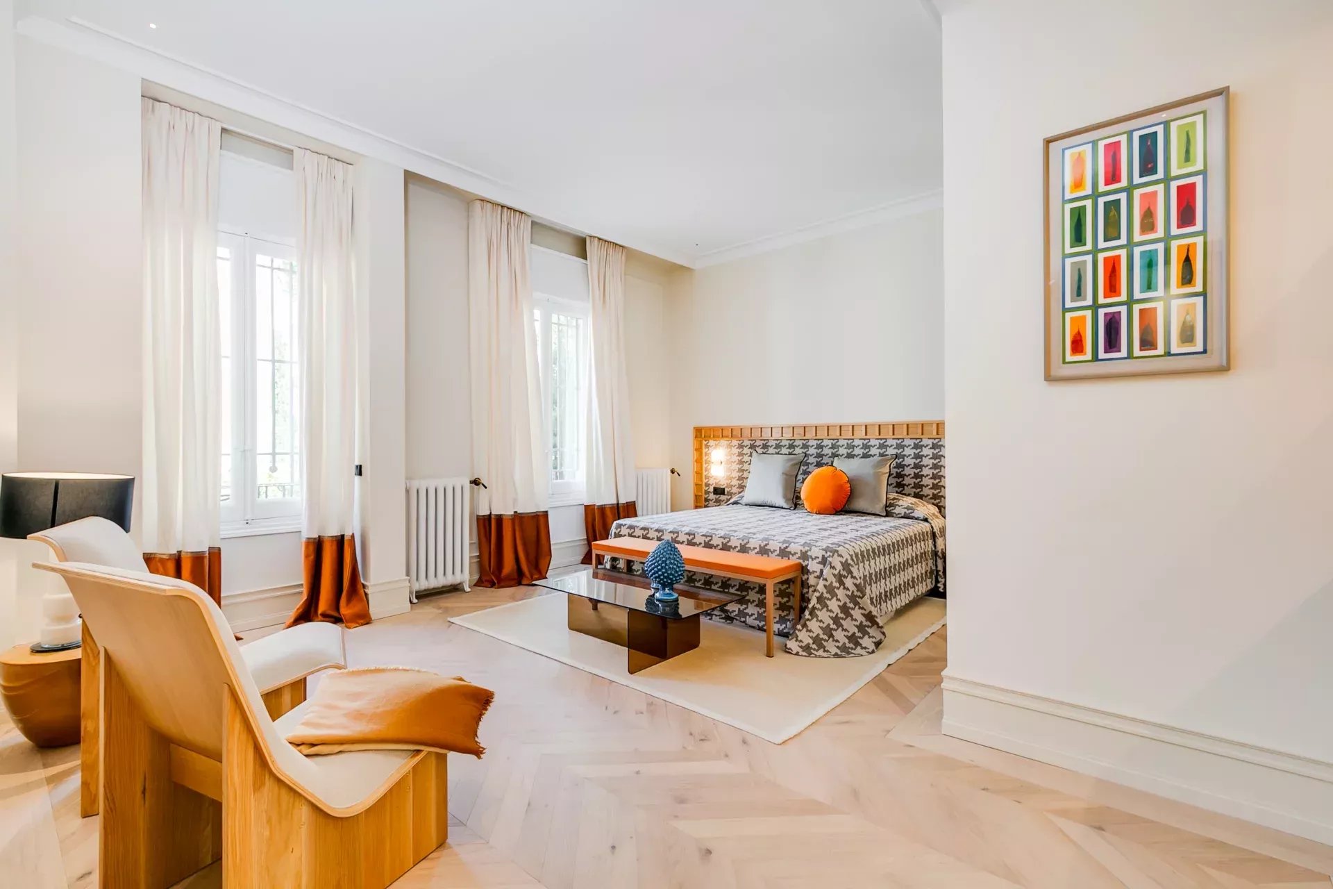 Le grand salon principal, aux hauts plafonds, s’organise en entrée, deux espaces de séjour, bar raffiné et salle à manger indépendante ; la cuisine séparée associe bois et marbre avec des électroménagers haut de gamme. La zone nuit comprend cinq chambres : quatre suites avec salle de bains et placards sur mesure, plus une cinquième chambre idéale comme chambre de service ; la suite principale dispose d’un dressing de grande capacité, d’un espace coiffeuse, d’un double lavabo, d’une double douche effet pluie, de deux toilettes indépendantes et d’une baignoire autoportante. Parmi les atouts : larges couloirs, double vitrage, système Airzone dans chaque pièce pour une climatisation indépendante, buanderie, débarras de 10 m² et place de stationnement extérieure.
