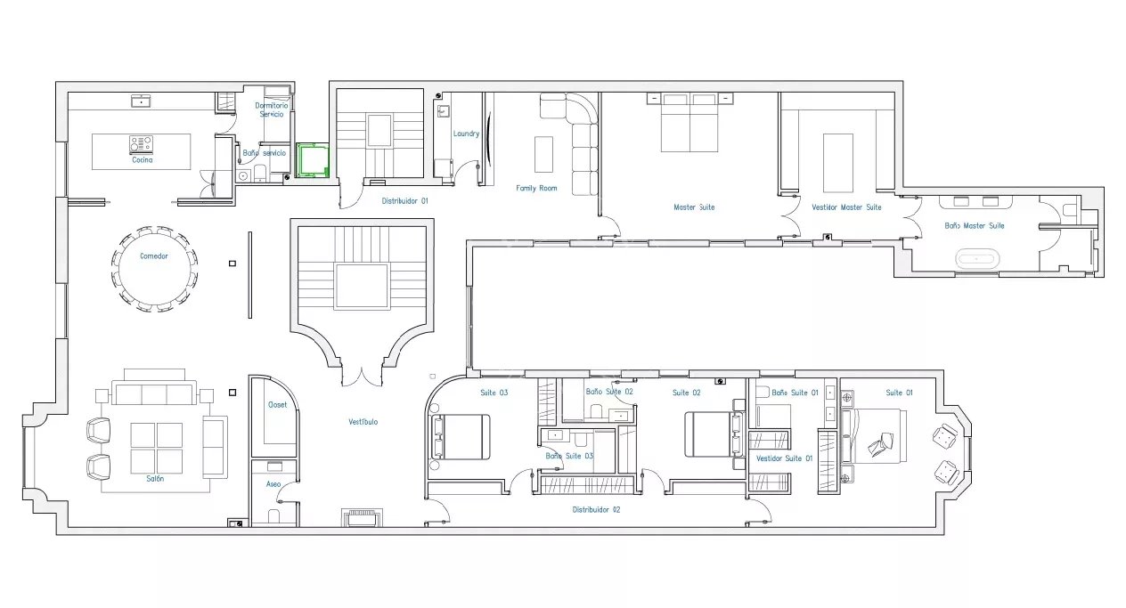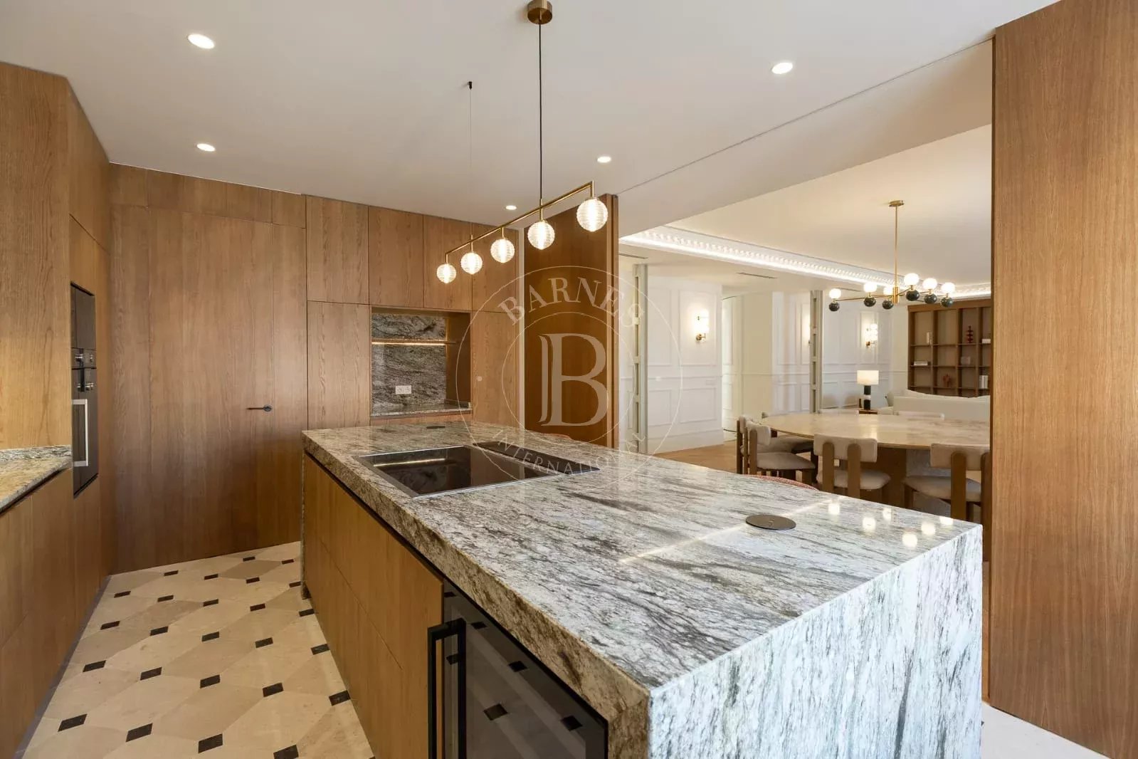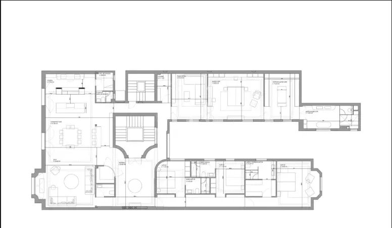Actuellement, la rénovation prévue comprend quatre chambres en suite, chacune avec salle de bain privée et dressing, ainsi qu'un WC supplémentaire. Les salons principaux, aux dimensions extraordinaires, bénéficient d'une orientation extérieure et de grandes baies vitrées qui inondent les pièces de lumière naturelle, mettant en valeur les hauts plafonds, l'élégance classique et le caractère représentatif propre aux immeubles majestueux du quartier.