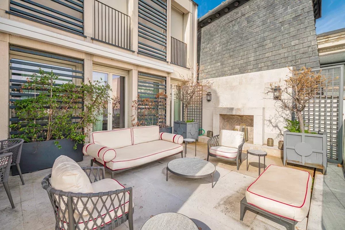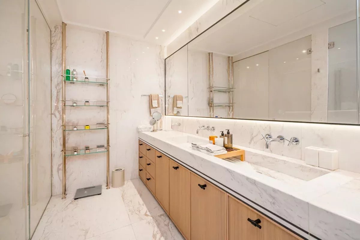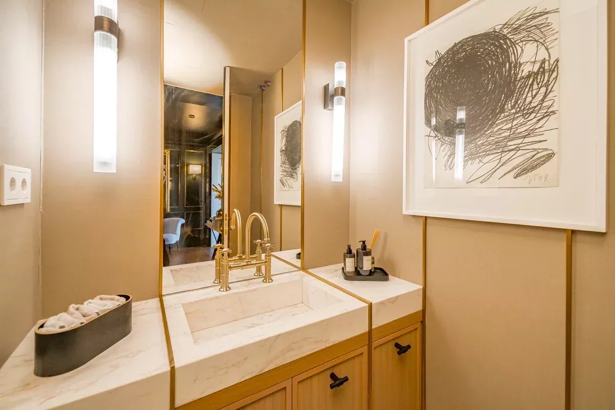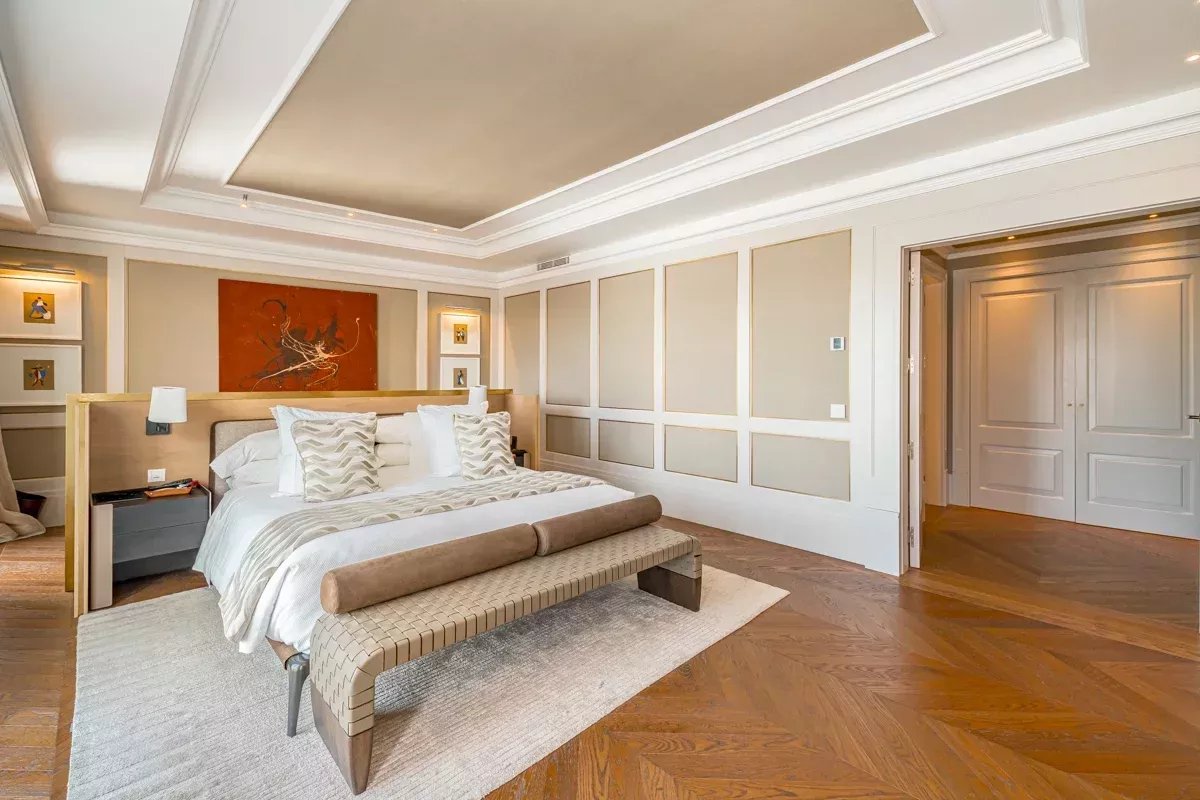 L’espace nuit se compose de quatre suites extérieures, avec vue sur rue ou sur la grande cour arborée avec piscine. La suite parentale se distingue par ses généreuses dimensions, un dressing au design italien et une salle de bains en marbre de Carrare avec douche à effet pluie et baignoire îlot. Les trois autres chambres, également en suite, disposent de dressings individuels et de salles de bains privatives, toutes dotées de matériaux nobles et de finitions luxueuses.