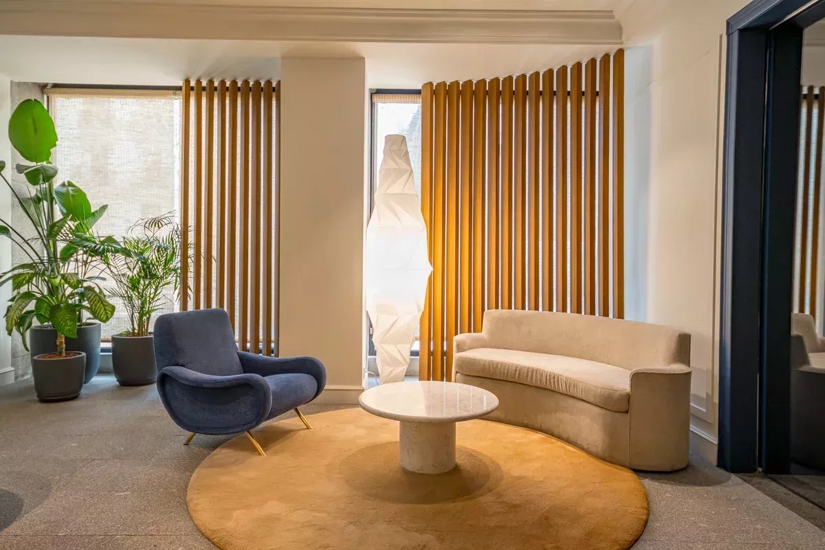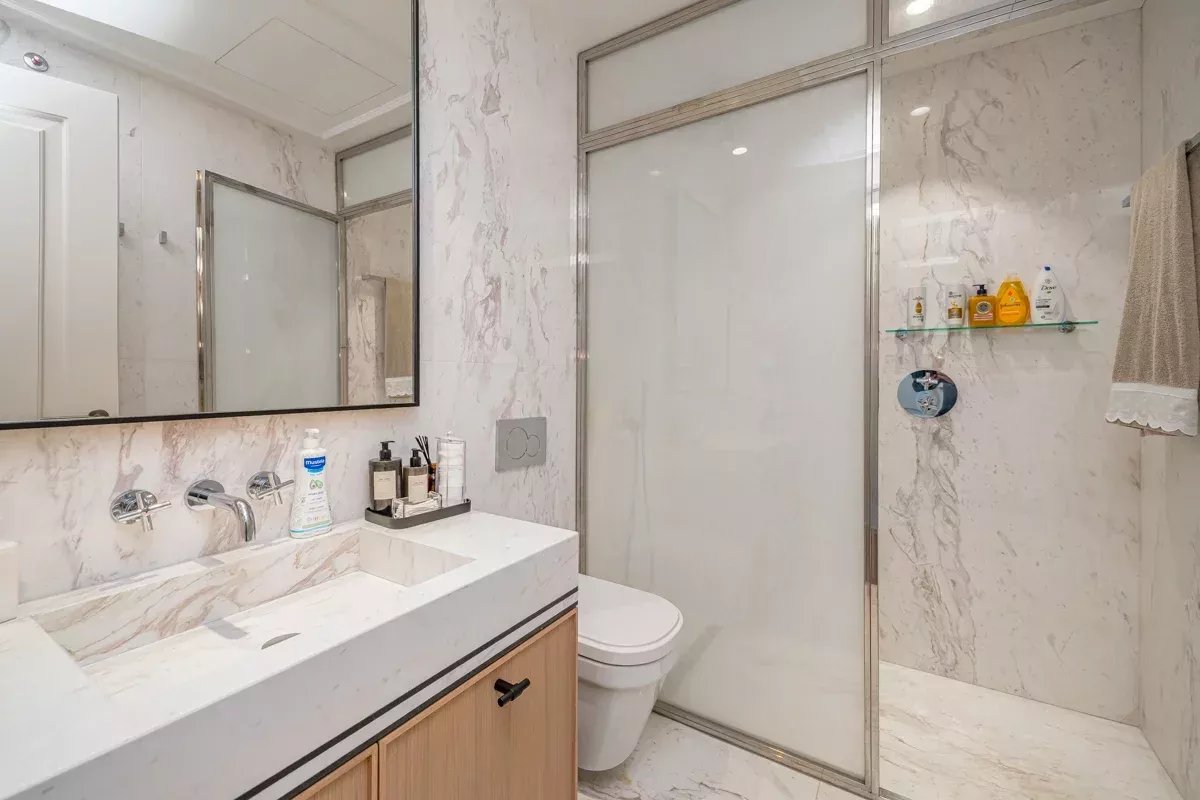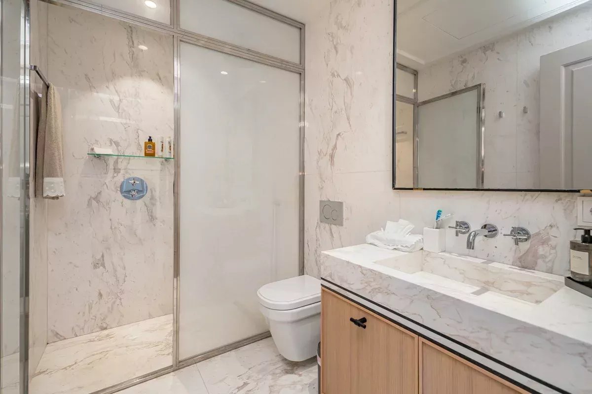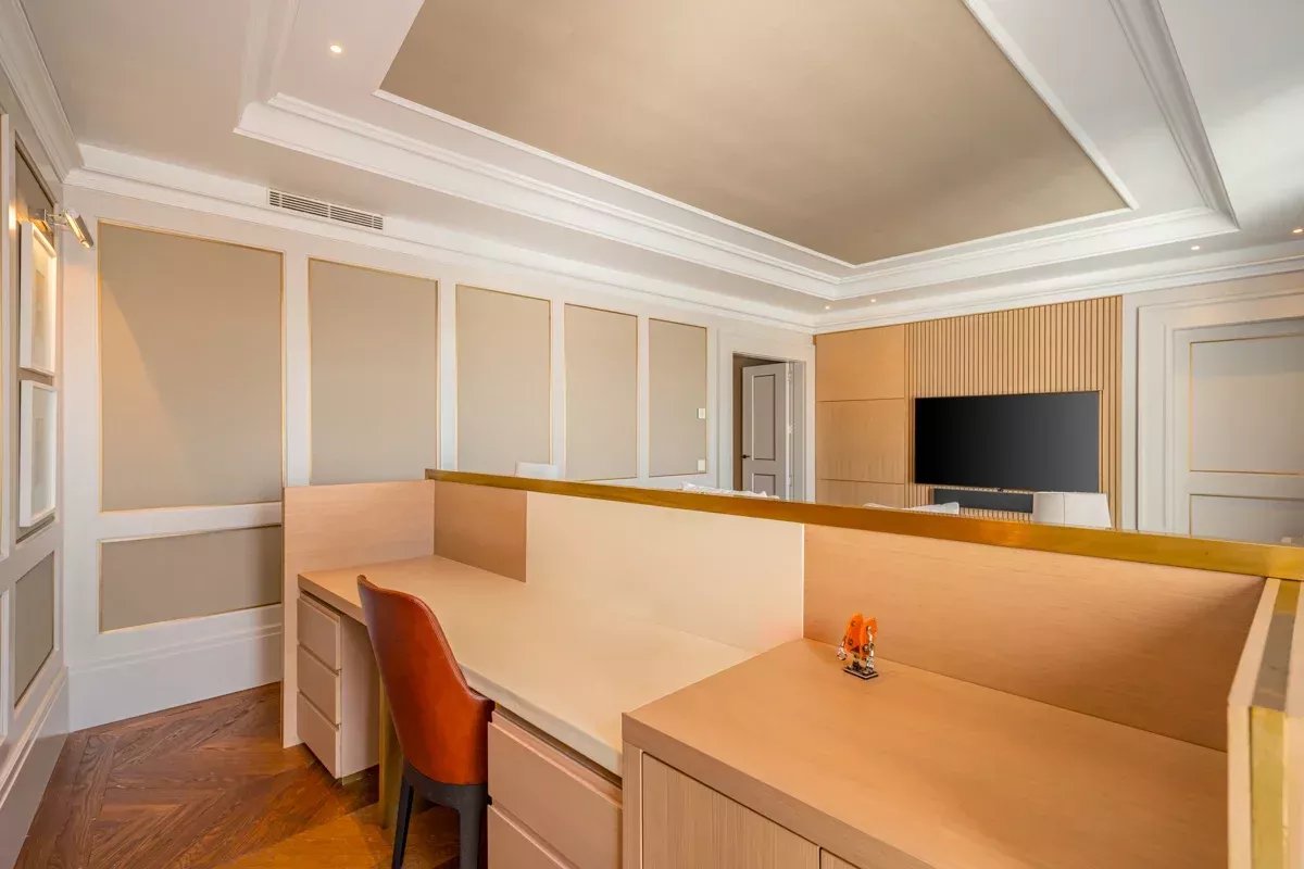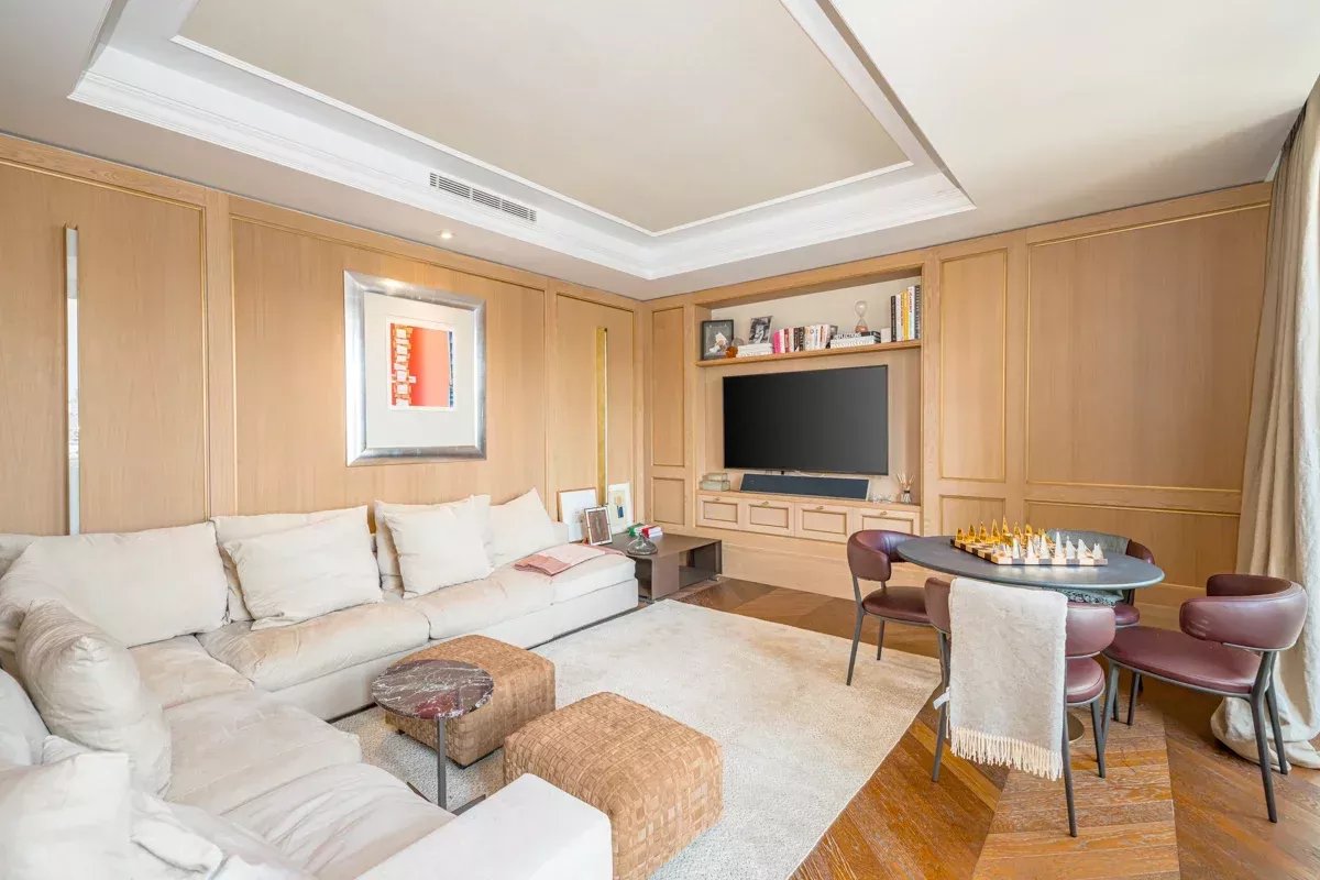 L’espace jour comprend un vaste hall d’entrée avec un sol en marbre grand format et des détails en bois noble, menant à un salon principal spacieux baigné de lumière naturelle grâce à de grandes baies vitrées donnant accès direct à la terrasse. La salle à manger indépendante est reliée au salon, tandis qu’un bureau ou une bibliothèque — habillé de bois de noyer — constitue un espace lumineux, serein et privatif.