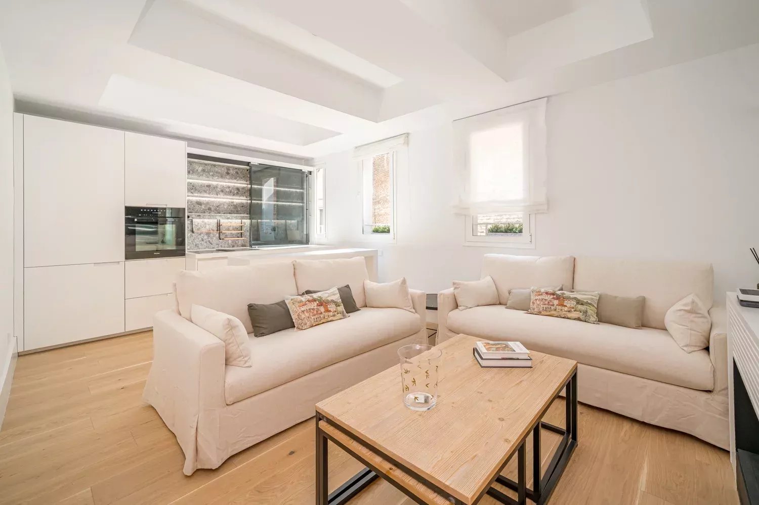 Le salon se compose d’un espace élégamment aménagé avec trois fenêtres extérieures et d’une cheminée décorative à vapeur. La cuisine entièrement équipée et panneauée, intégrée en toute discrétion, crée une atmosphère accueillante et contemporaine. Le système de climatisation gainable assure une température optimale toute l’année.