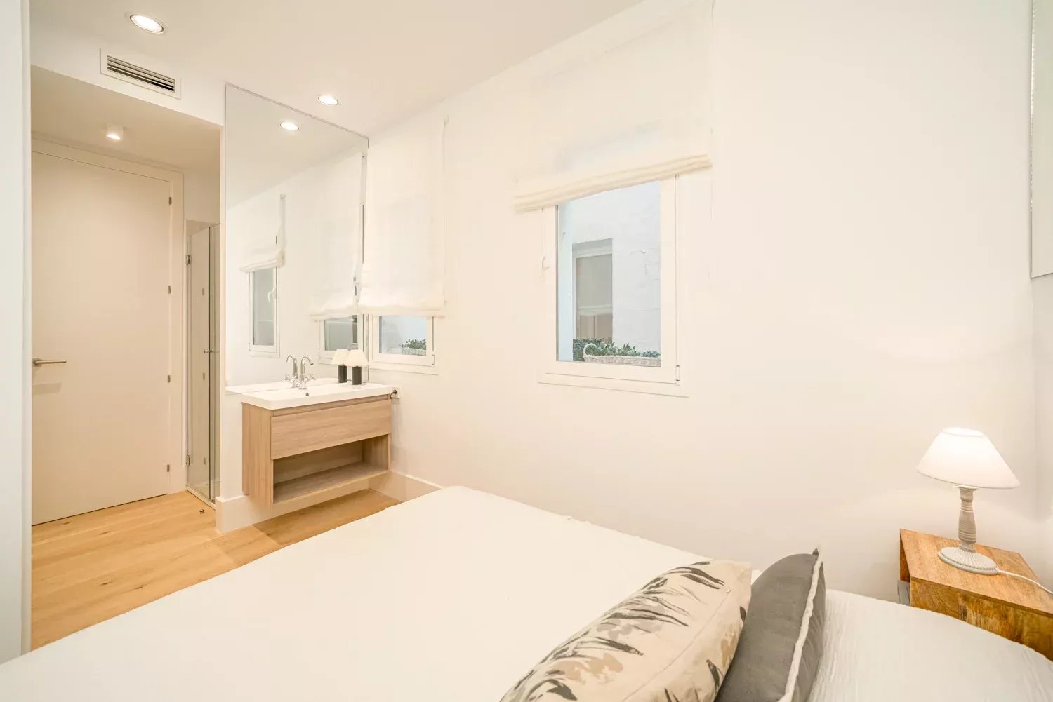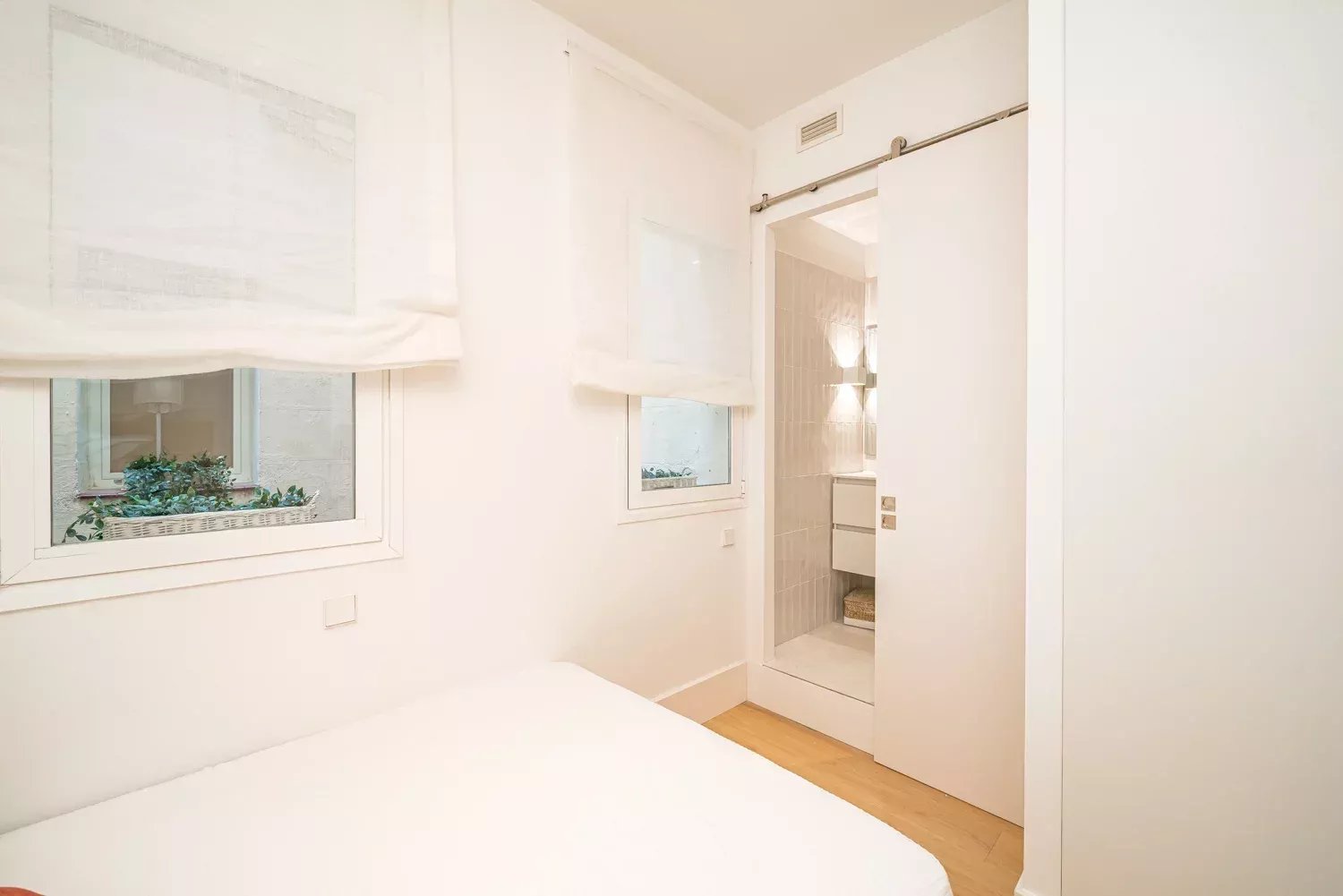 La distribution commence par une chambre secondaire lumineuse dotée d’une fenêtre et d’une salle de bains attenante moderne avec cabine de douche. Un couloir naturellement éclairé mène à un WC invité, à un spacieux placard encastré et à la chambre principale, équipée d’une salle de bains intégrée, de placards sur mesure et de deux grandes fenêtres apportant chaleur et espace.