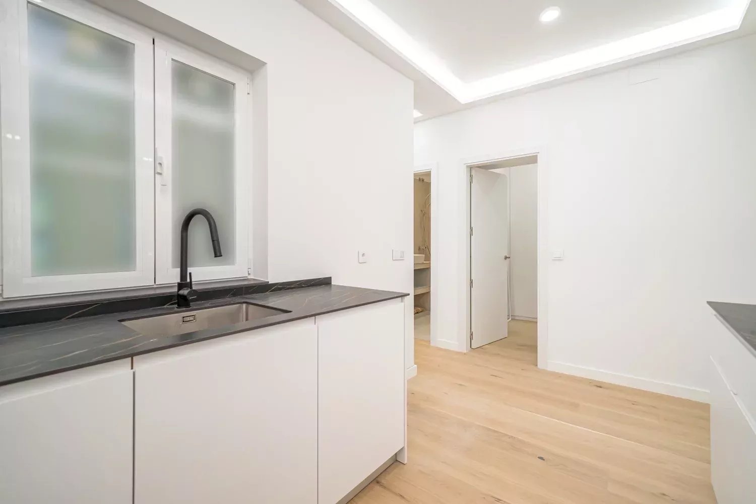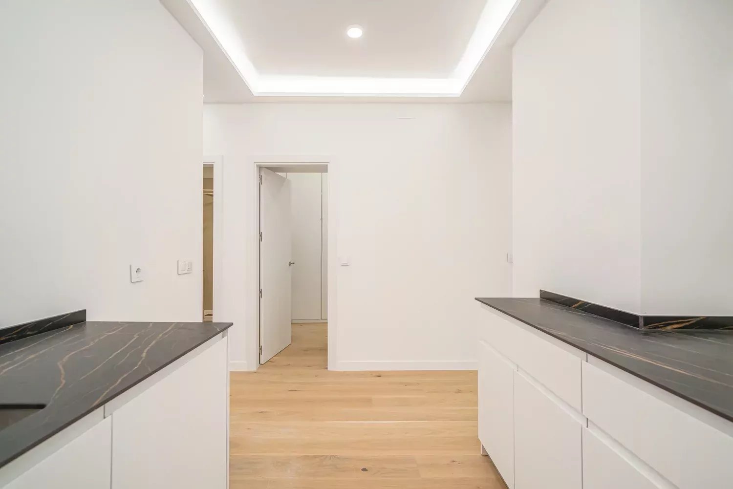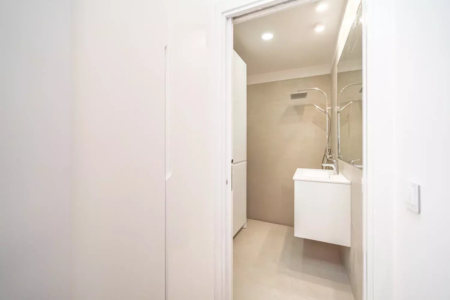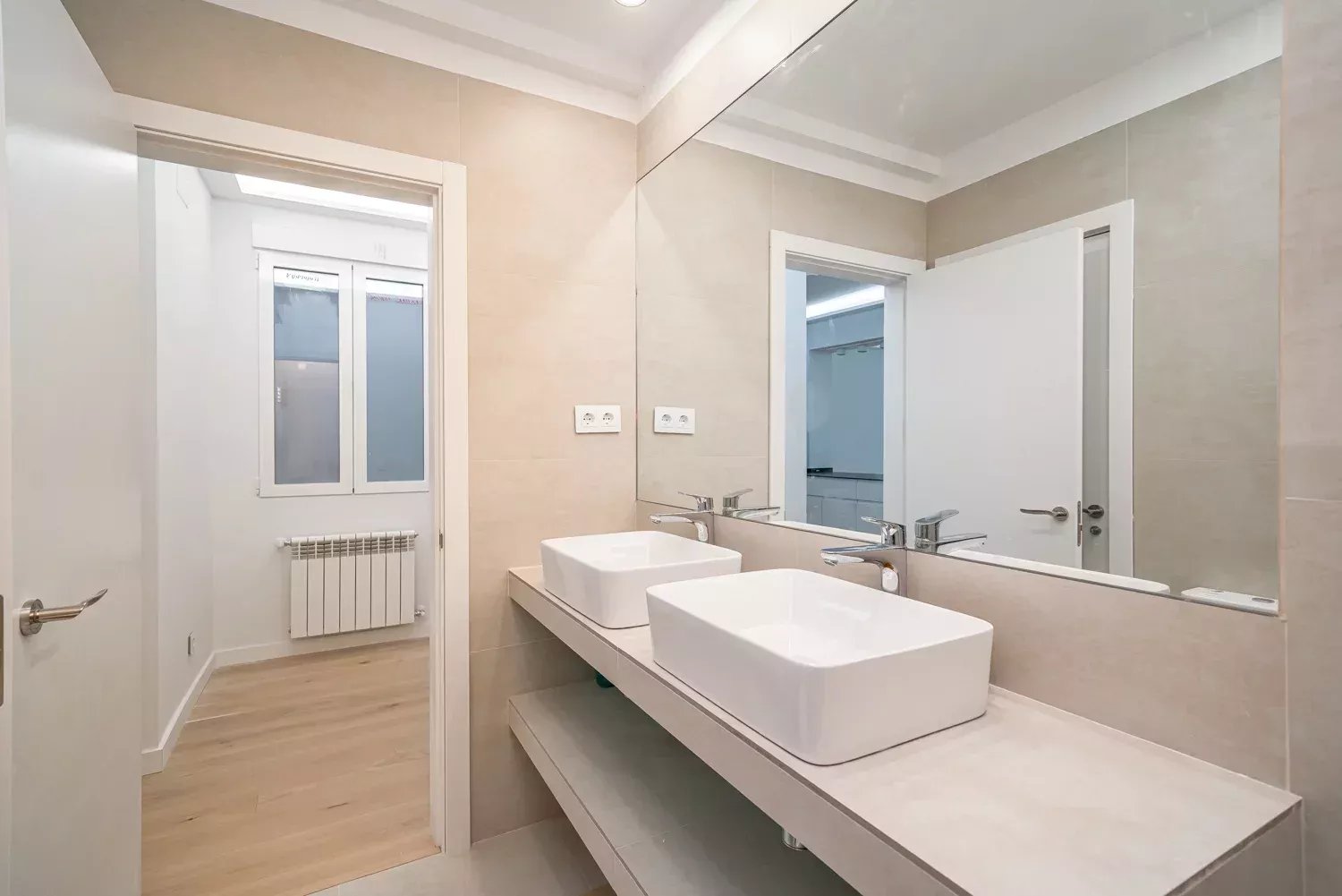Le logement dispose de deux chambres doubles, toutes deux avec salle de bain attenante. La suite principale, orientée vers la rue et donnant accès à un balcon, dispose d'un dressing sur mesure, ainsi que d'une élégante salle de bain privée. La deuxième chambre est également très lumineuse, avec une fenêtre donnant sur la cour intérieure, une armoire encastrée et une salle de bain complète avec ventilation naturelle.