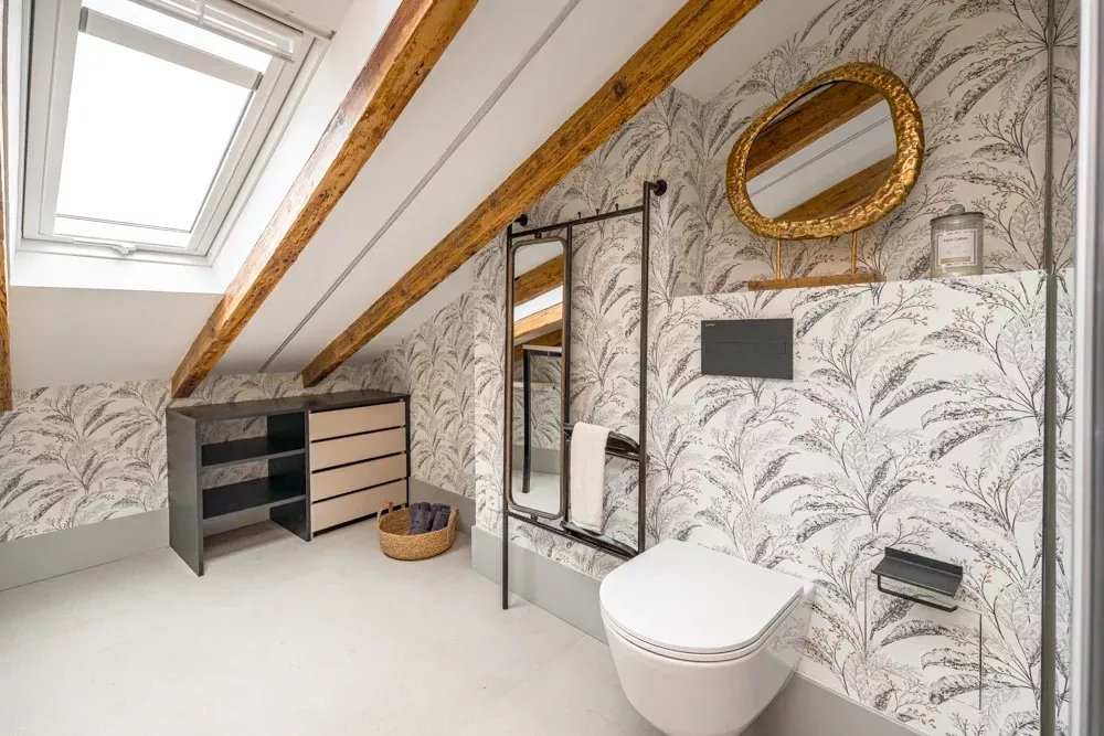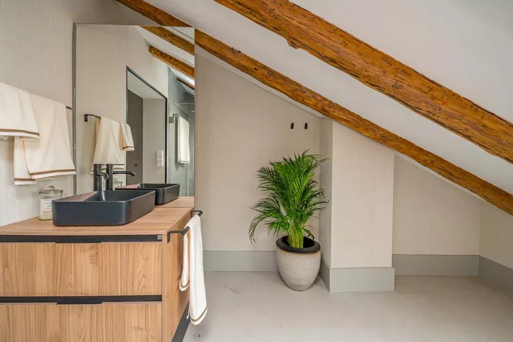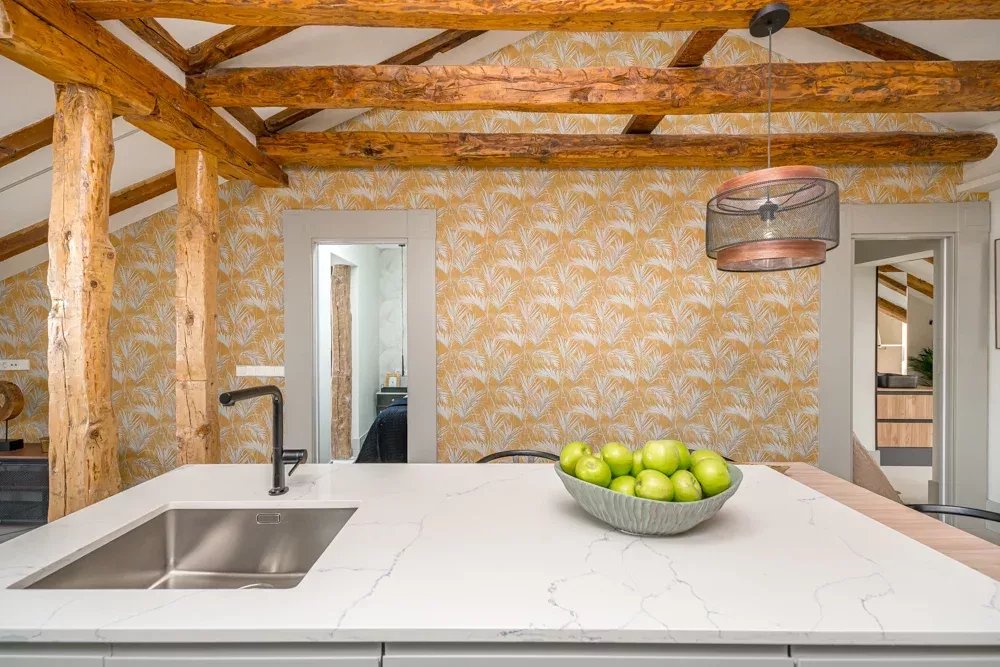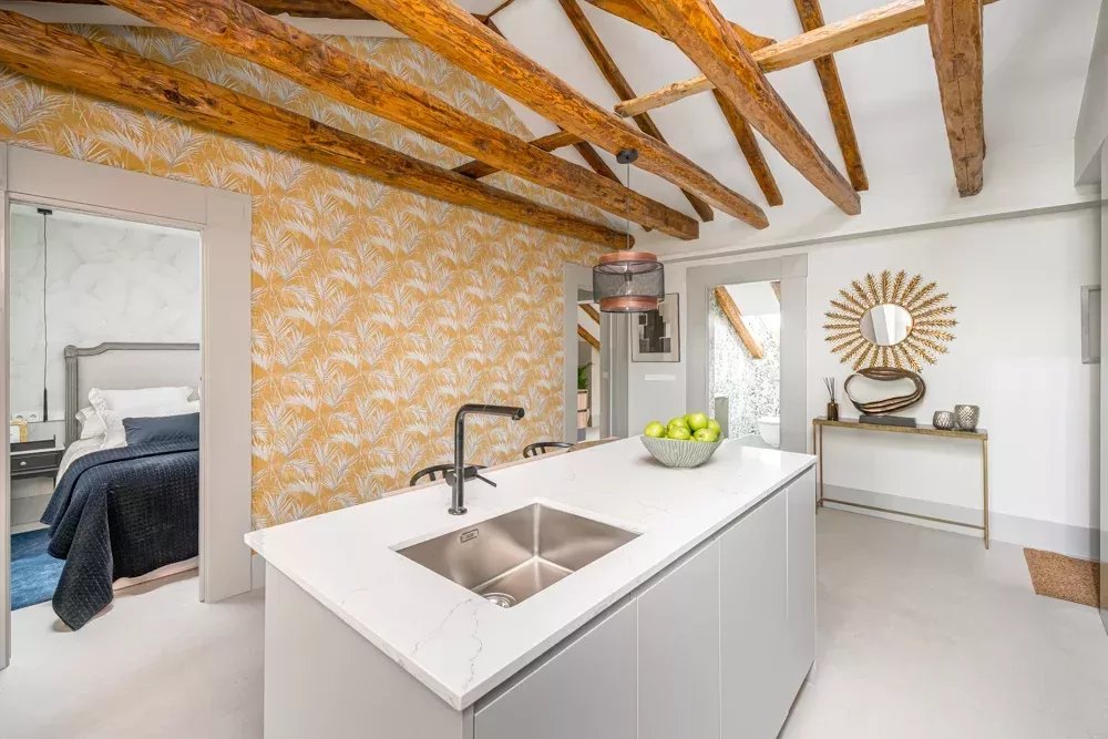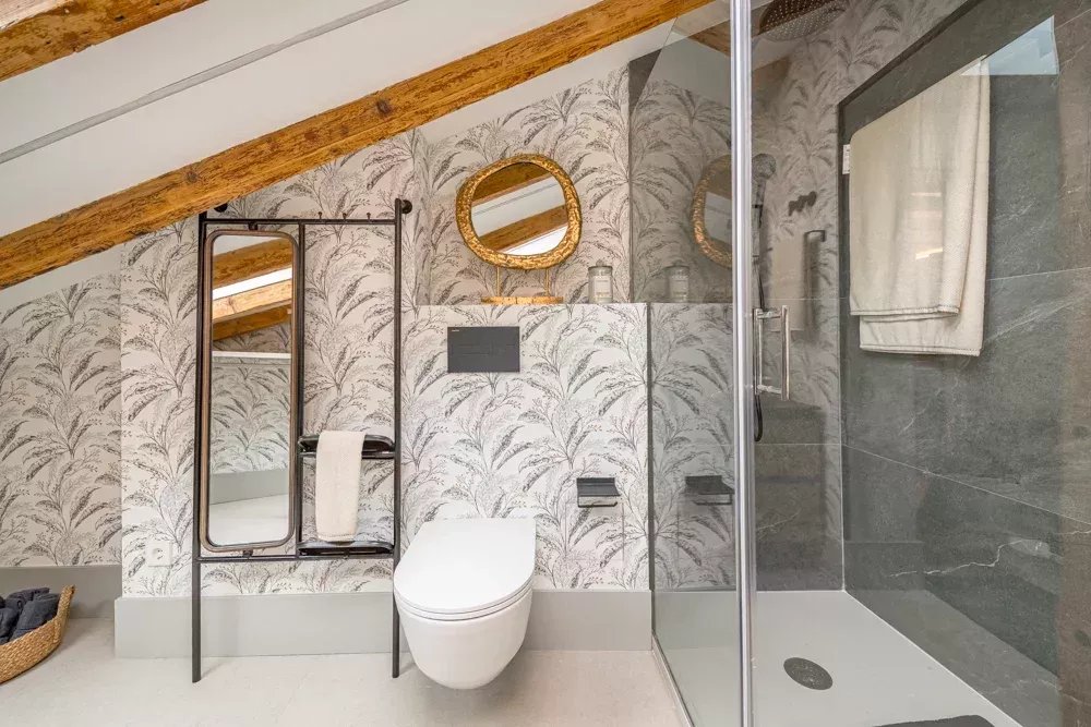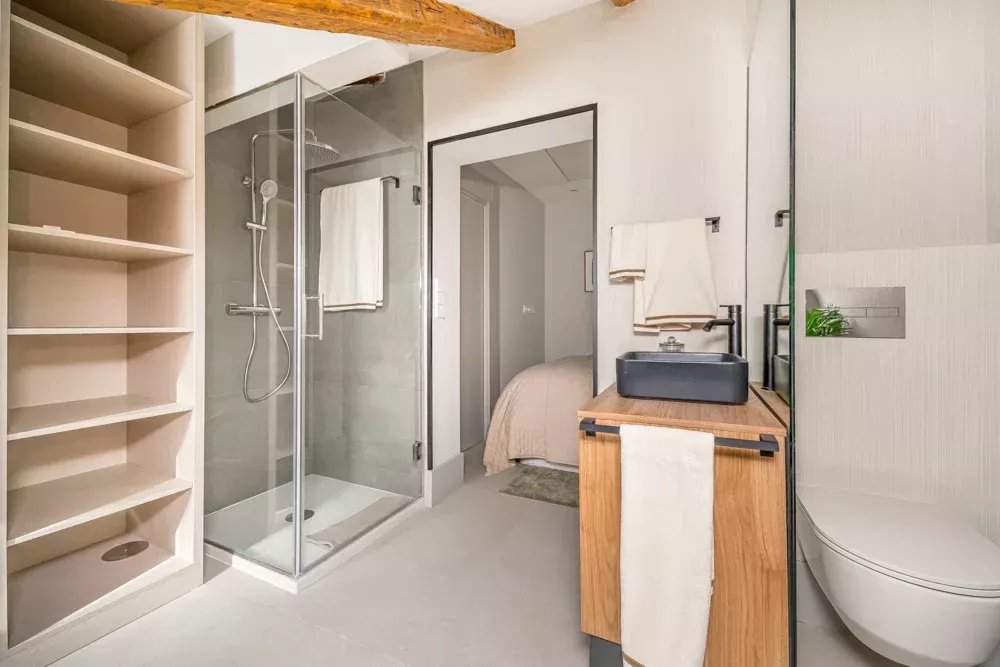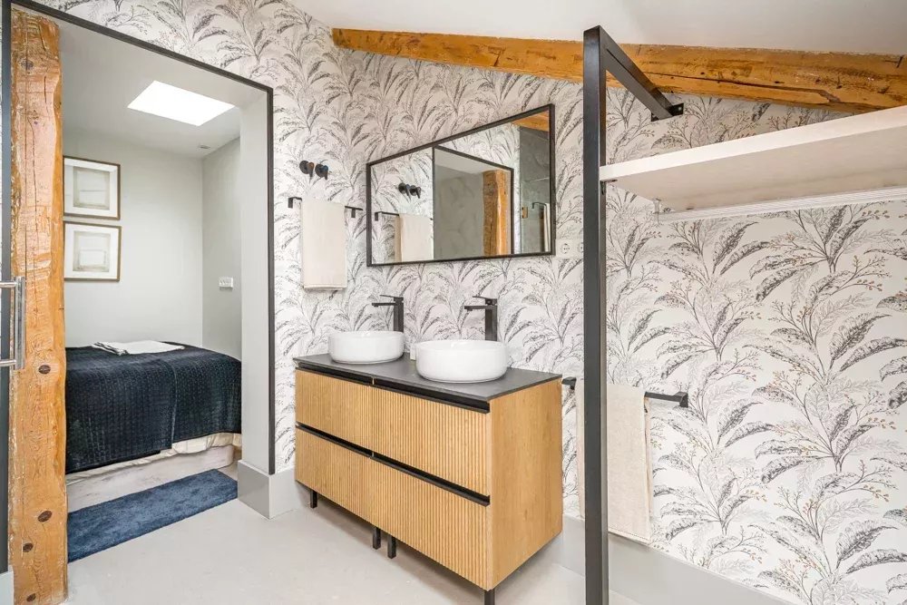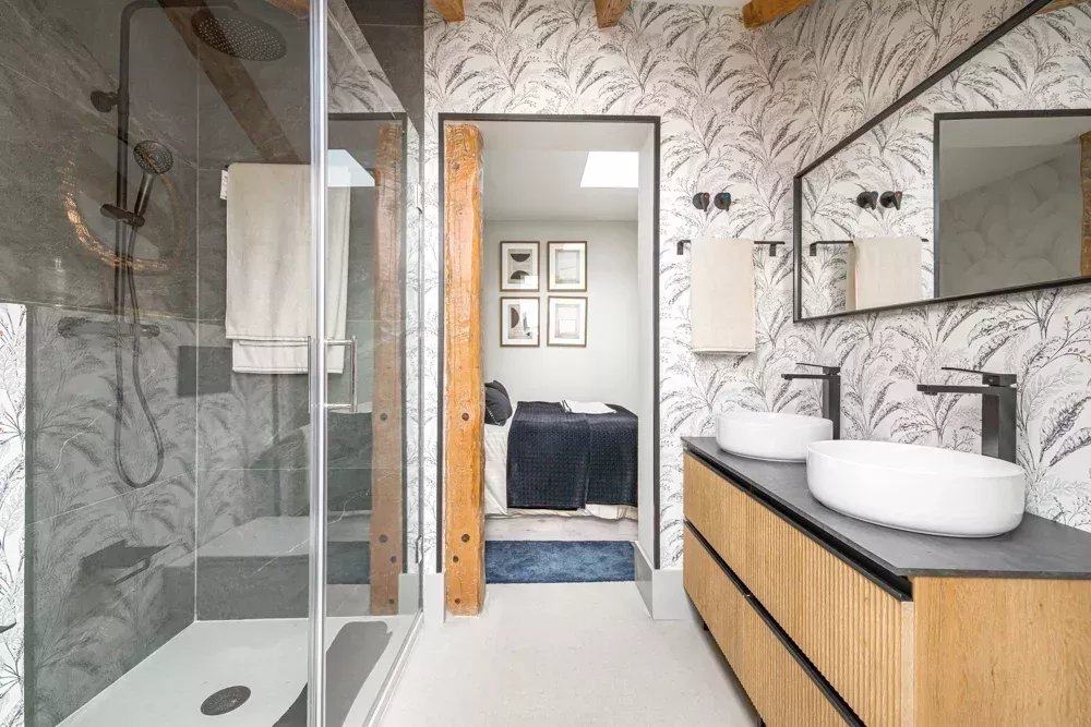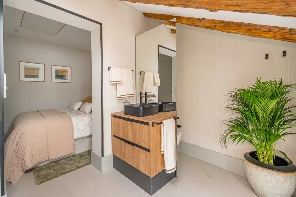 L'intérieur témoigne d'un design réfléchi, où des poutres apparentes et des puits de lumière stratégiques baignent l'espace dans une lumière naturelle chaude, créant une atmosphère qui semble à la fois intemporelle et actuelle. La disposition ouverte fusionne sans effort les espaces de vie, de repas et de cuisine en une symphonie d'espace, où chaque moment passé est une expérience de luxe. Deux chambres en suite, magistralement conçues, offrent un refuge privé, chacune étant un sanctuaire de confort avec une attention minutieuse aux détails qui respecte à la fois la vie privée et le luxe.