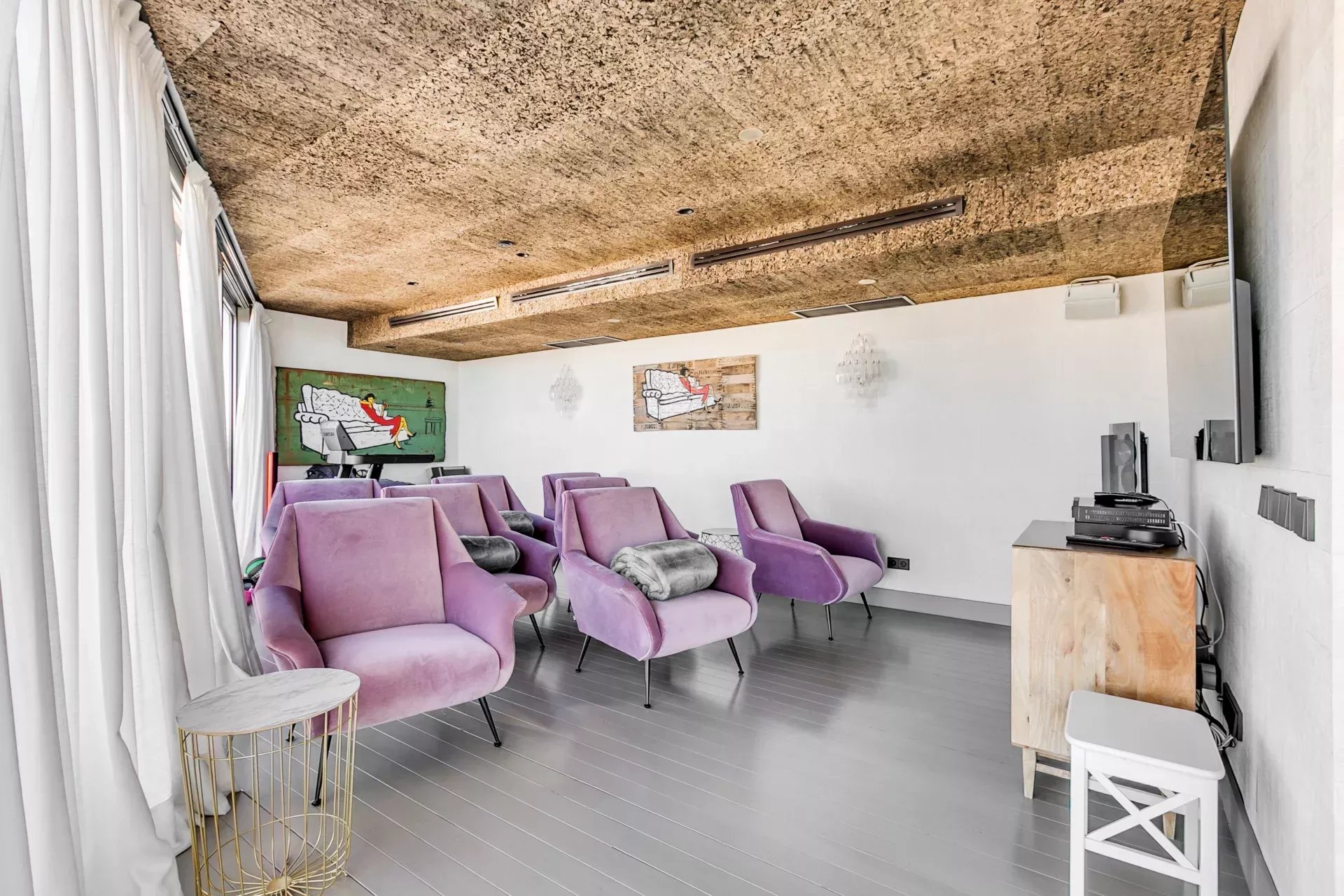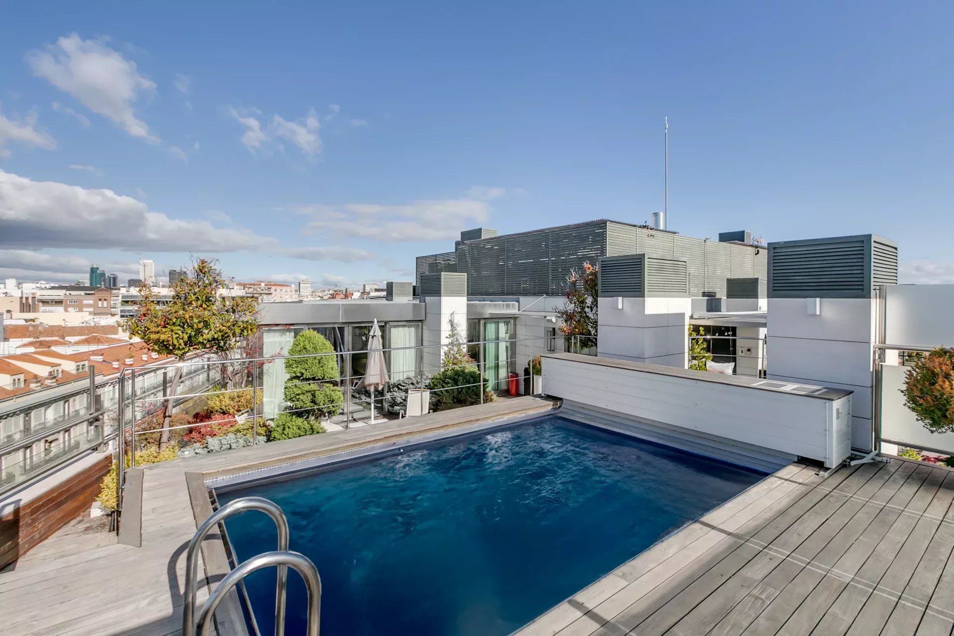 Le dernier étage, accessible par un escalier intérieur, abrite une spectaculaire terrasse avec piscine extérieure chauffée, espace bar, salons chill-out, salle à manger extérieure et salon d’été couvert. Ce niveau comprend également une salle de bain complète et une salle de cinéma privée.