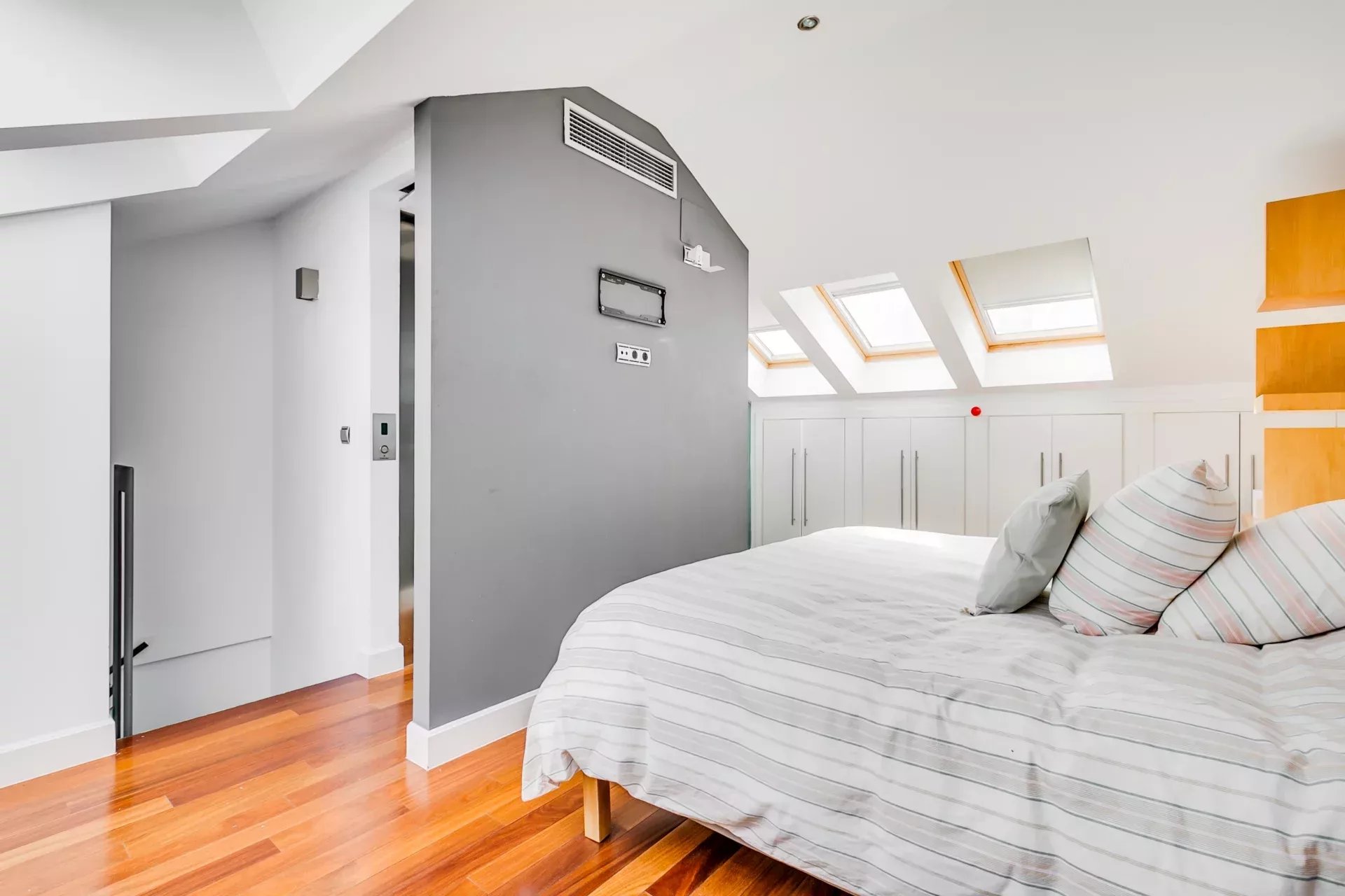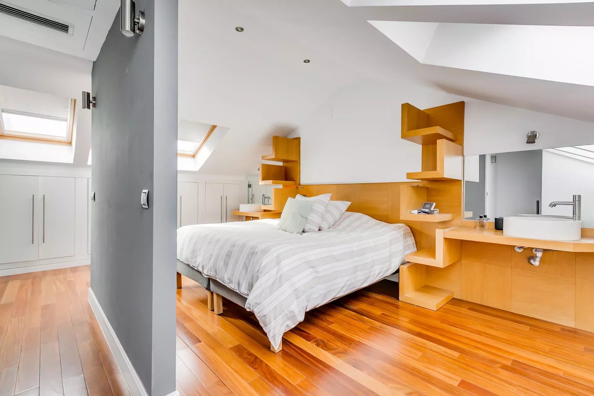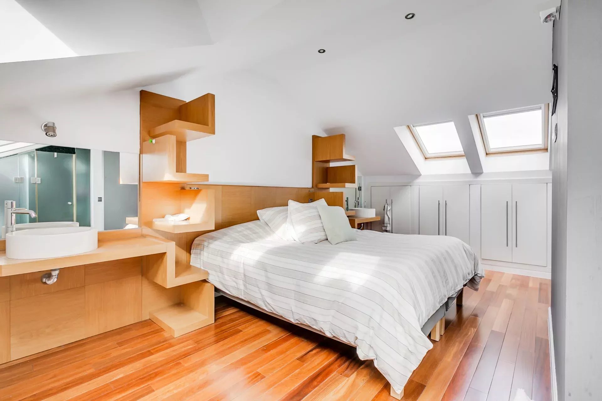 Au dernier étage, sous le pont, se trouve la chambre principale avec un design moderne, un dressing et une douche, une salle de bains et des toilettes séparées.