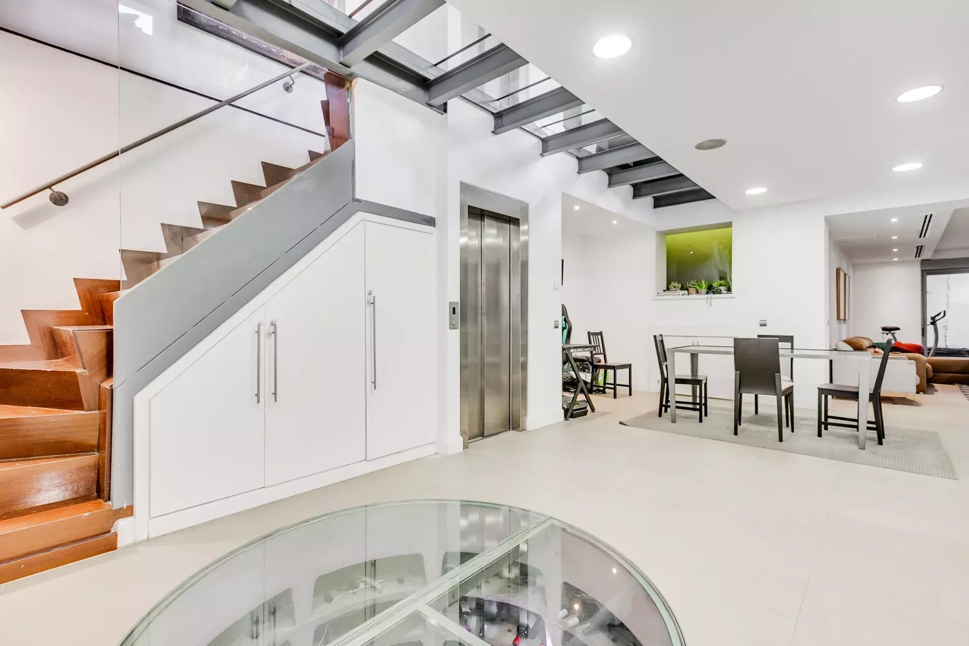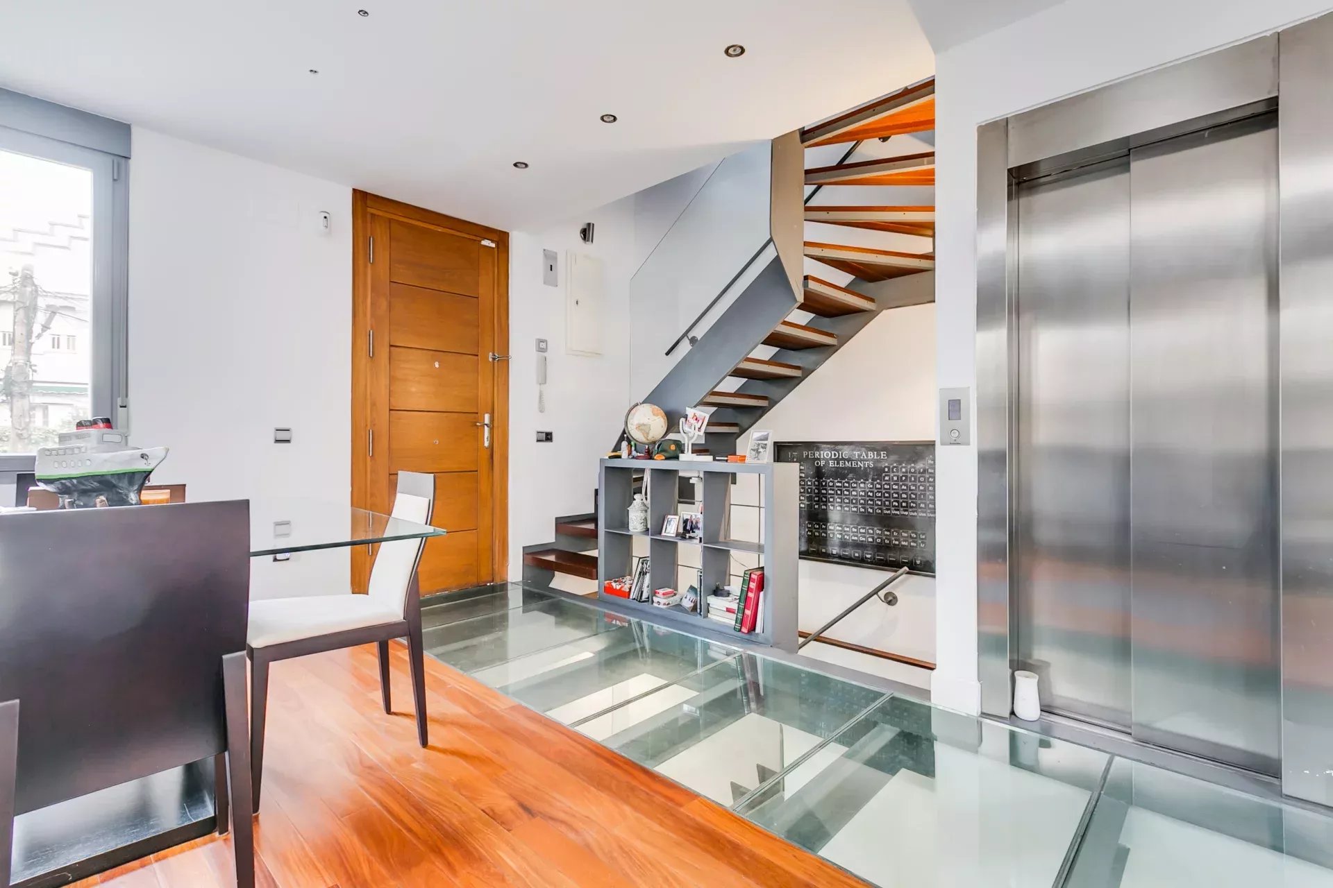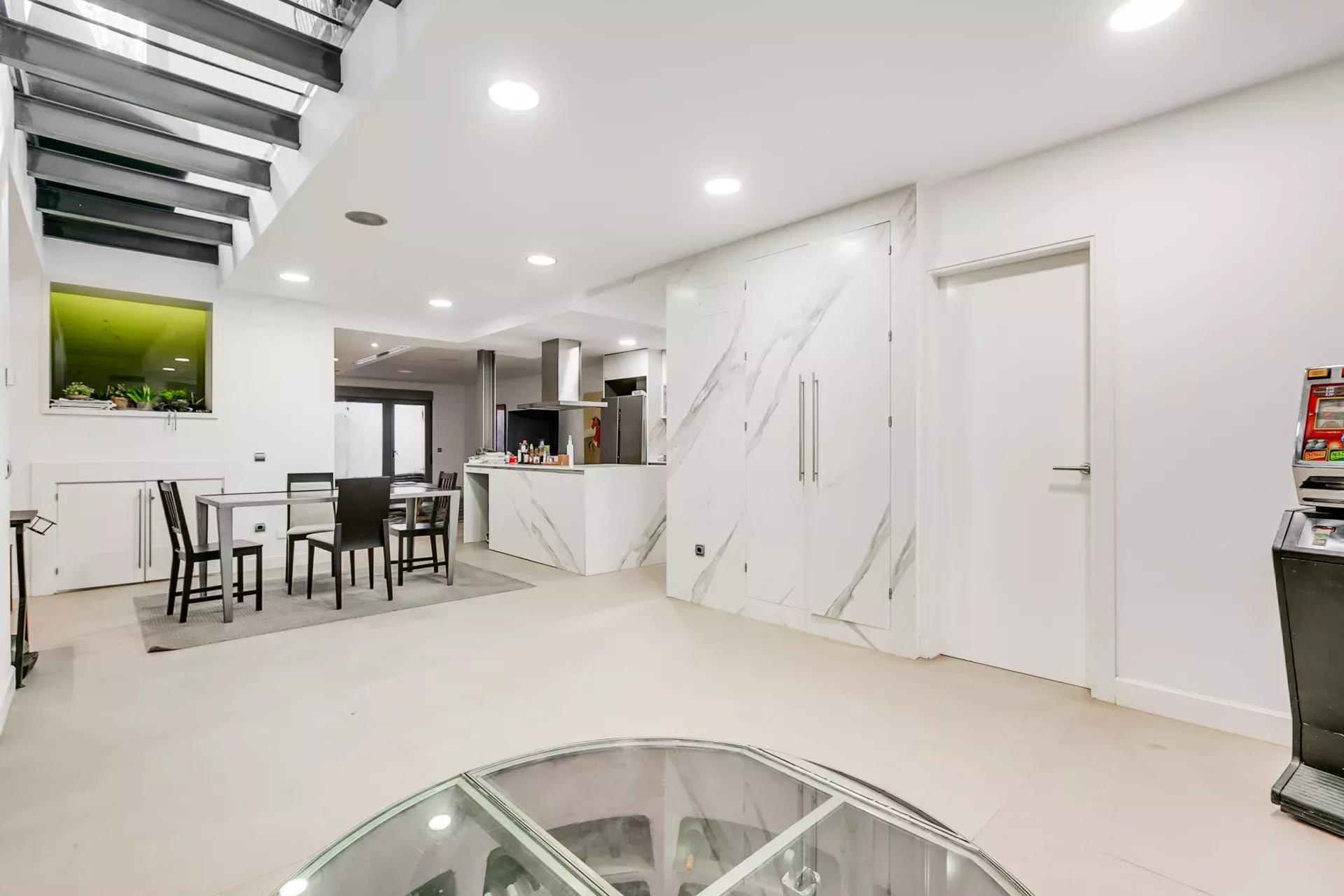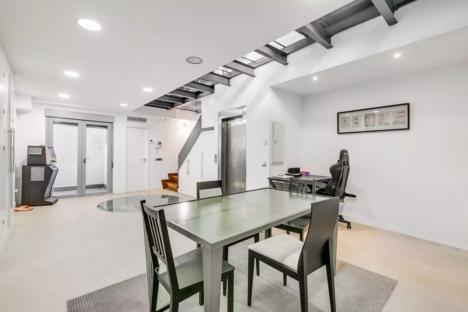 La propriété a une superficie de 250 mètres et est répartie sur 4 étages avec ascenseur. Au sous-sol, un grand espace de 70 mètres abrite une cuisine, une salle à manger et un salon, ainsi qu'une impressionnante cave à vin d'une capacité de 1 800 bouteilles. Il y a également un bureau qui peut être utilisé comme chambre d'amis ou de service, car il dispose d'une toilette avec douche. Sous l'escalier se trouvent la machine à laver et le sèche-linge.