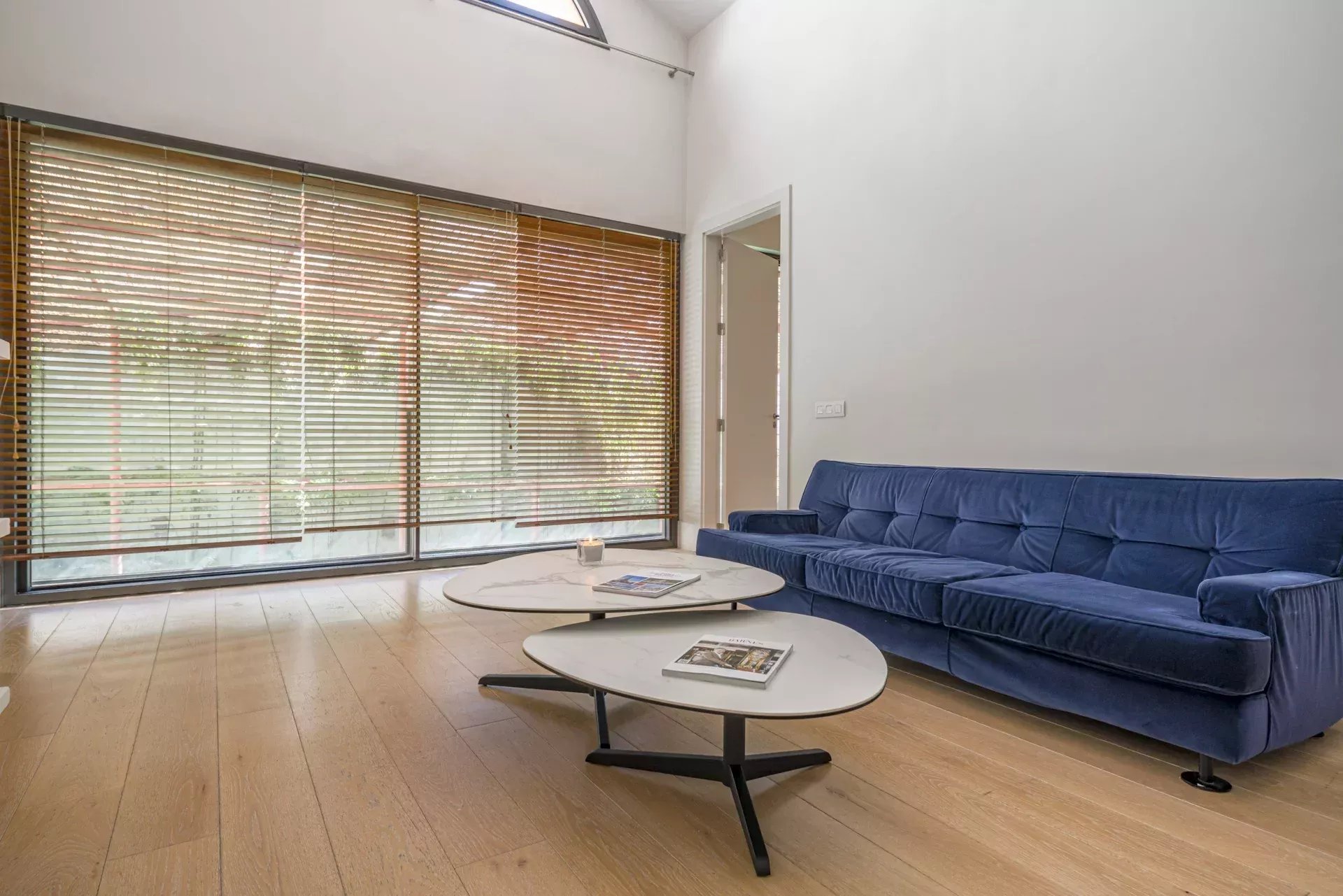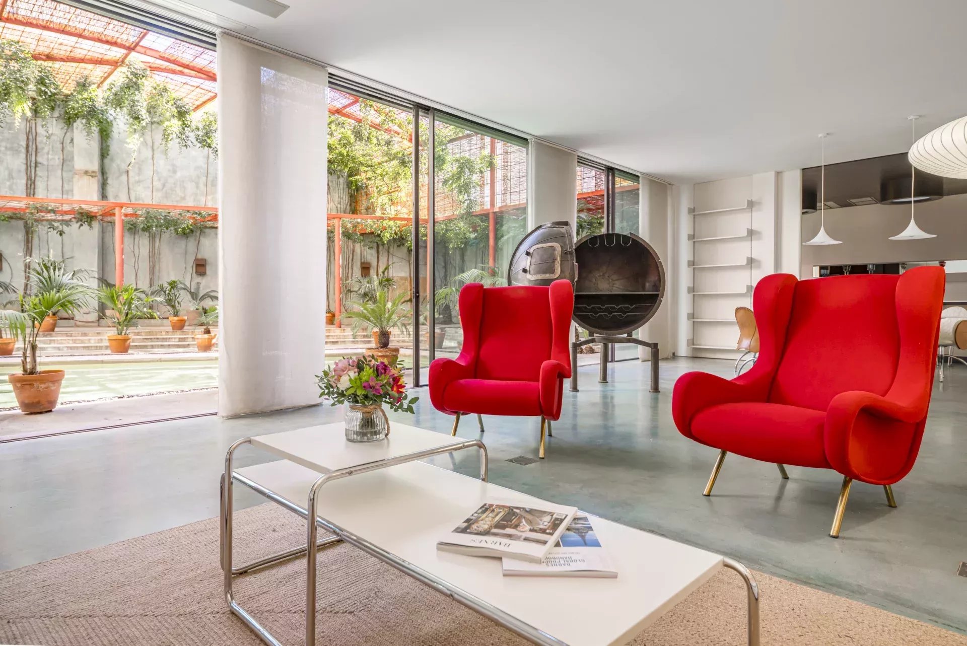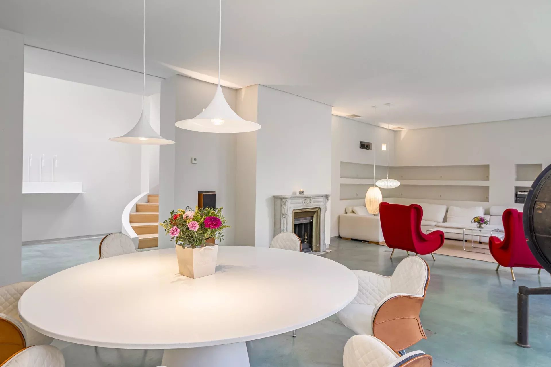 Le vaste salon-salle à manger, aux volumes généreux, s’ouvre harmonieusement vers l’extérieur grâce à de grandes baies vitrées, créant une continuité naturelle avec le jardin et la piscine privée. Cet espace offre une atmosphère unique de luminosité, d’intimité et de fluidité entre intérieur et extérieur, rare en centre-ville.