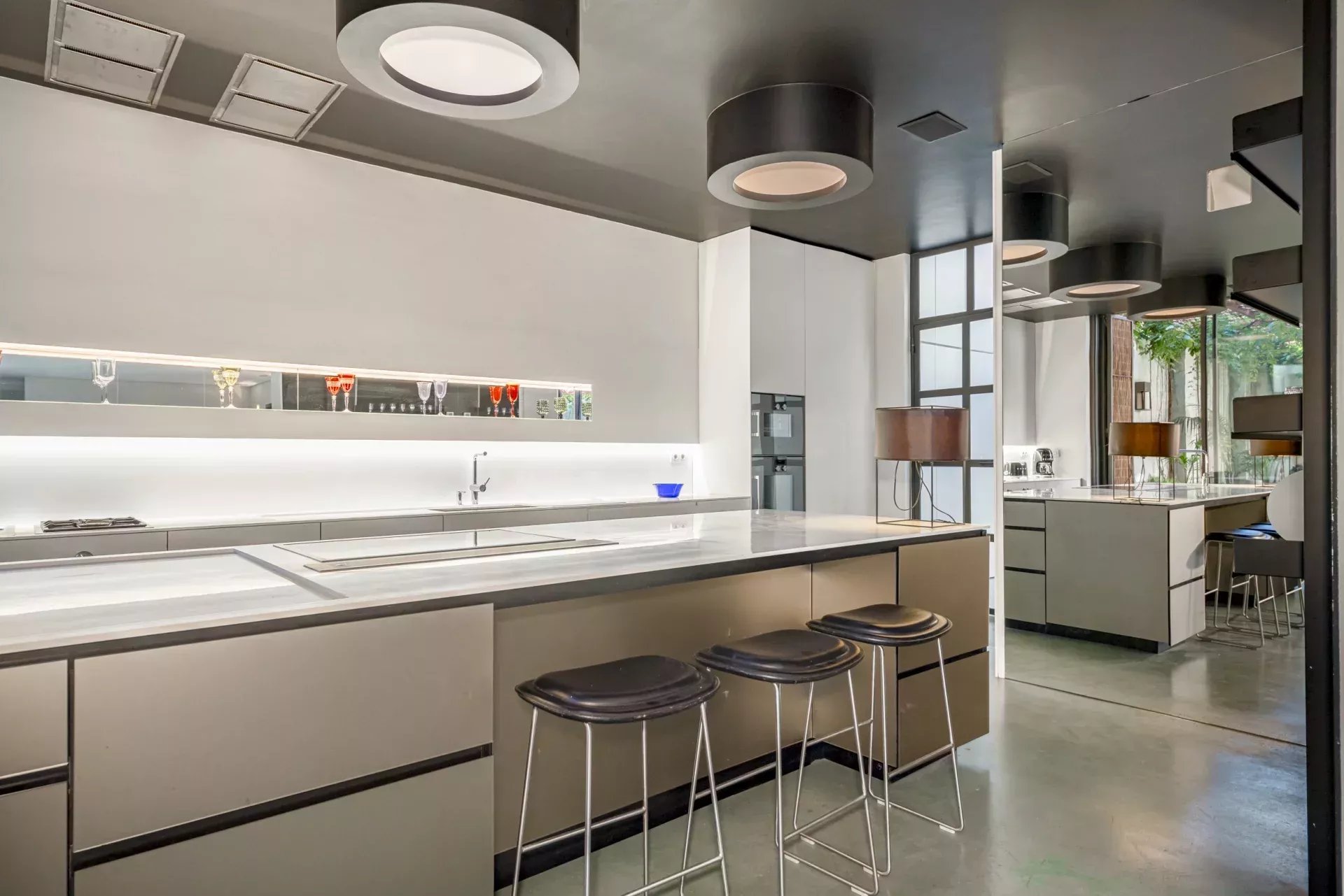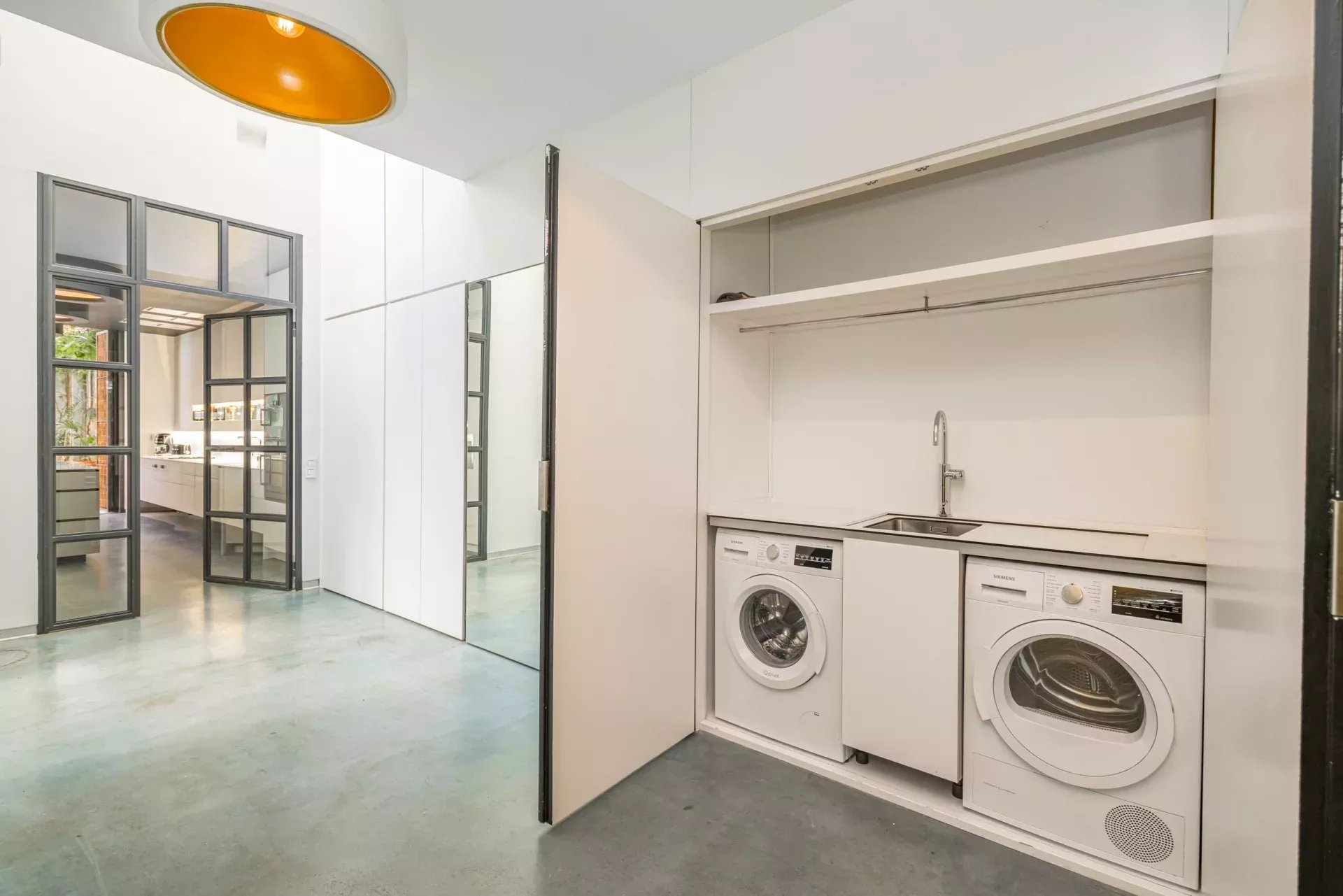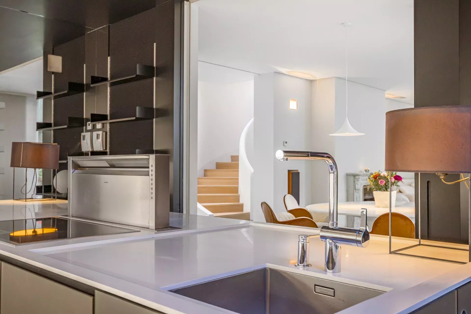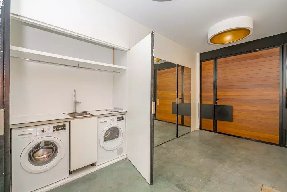 La cuisine, équipée d’électroménagers haut de gamme Gaggenau, allie design et fonctionnalité dans un environnement élégant, complétée par une buanderie indépendante.