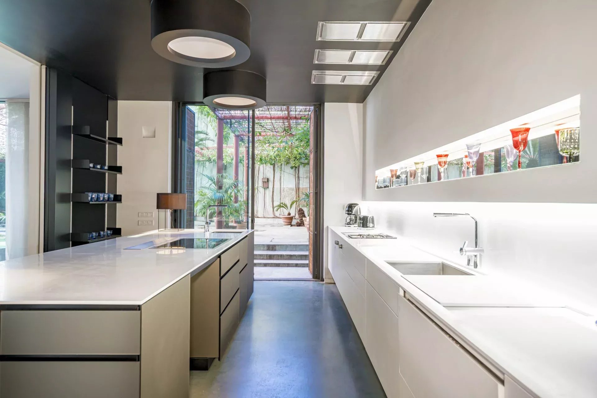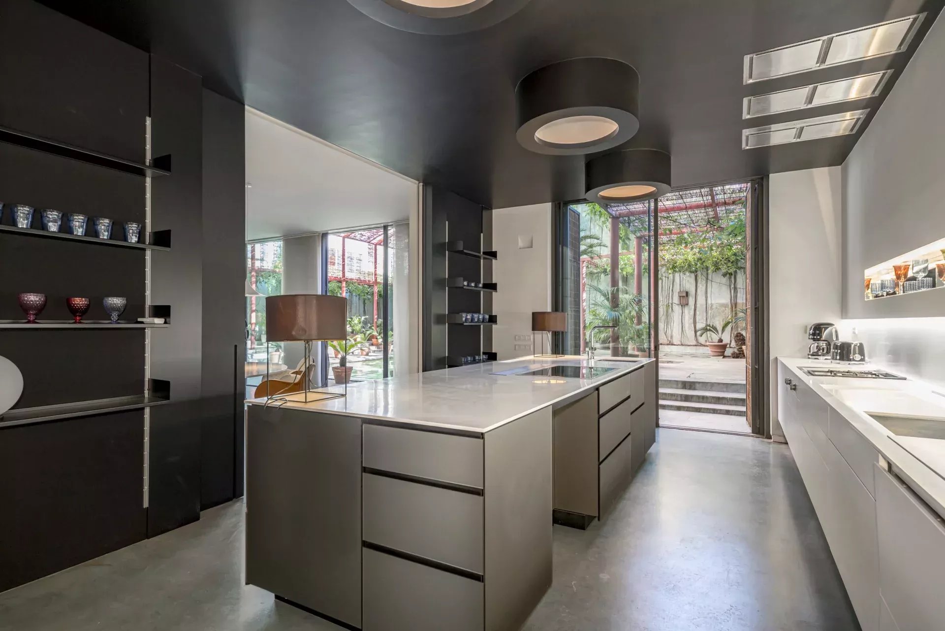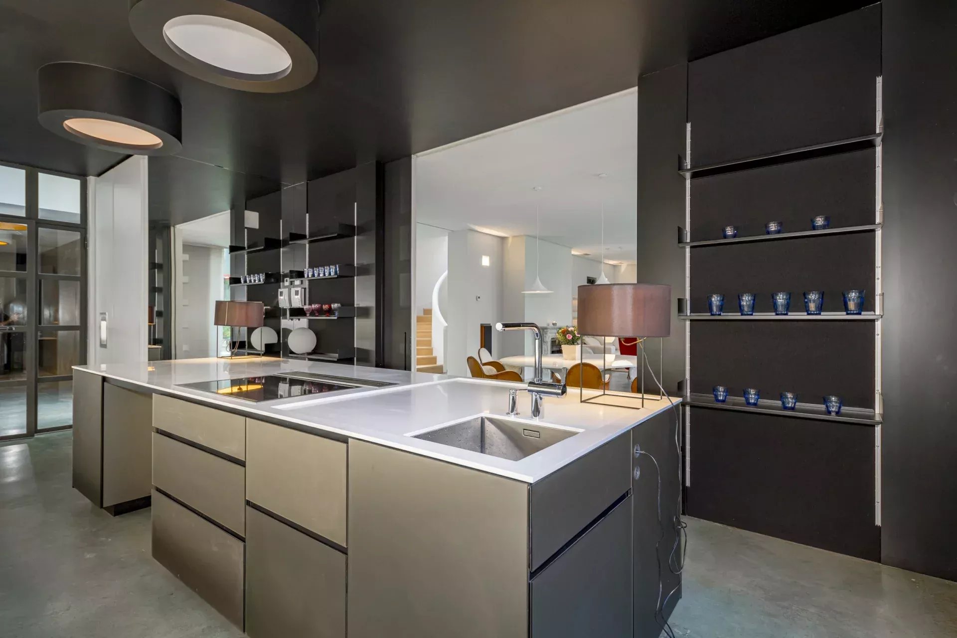 La cuisine, équipée d’électroménagers haut de gamme Gaggenau, allie design et fonctionnalité dans un environnement élégant, complétée par une buanderie indépendante.