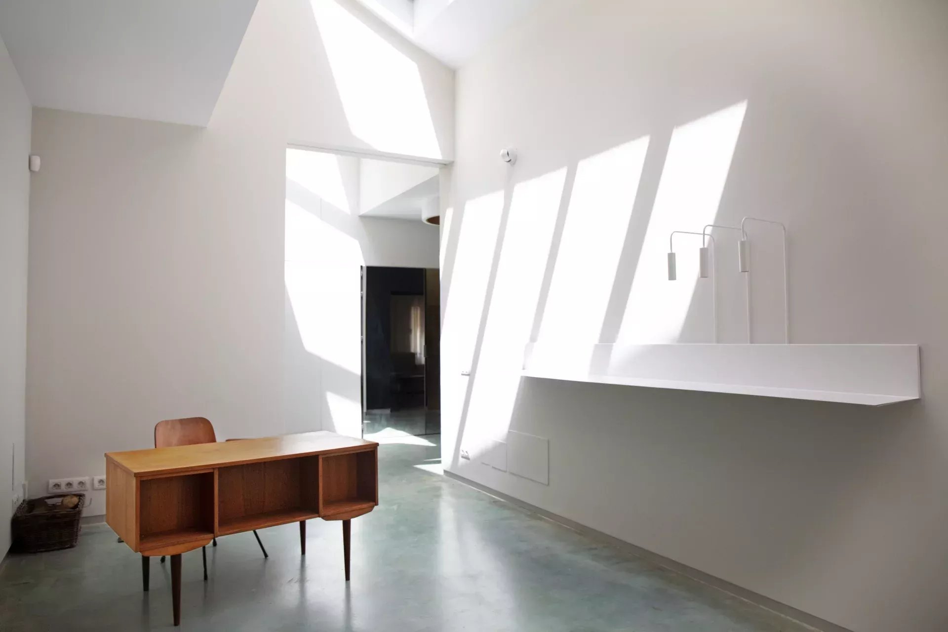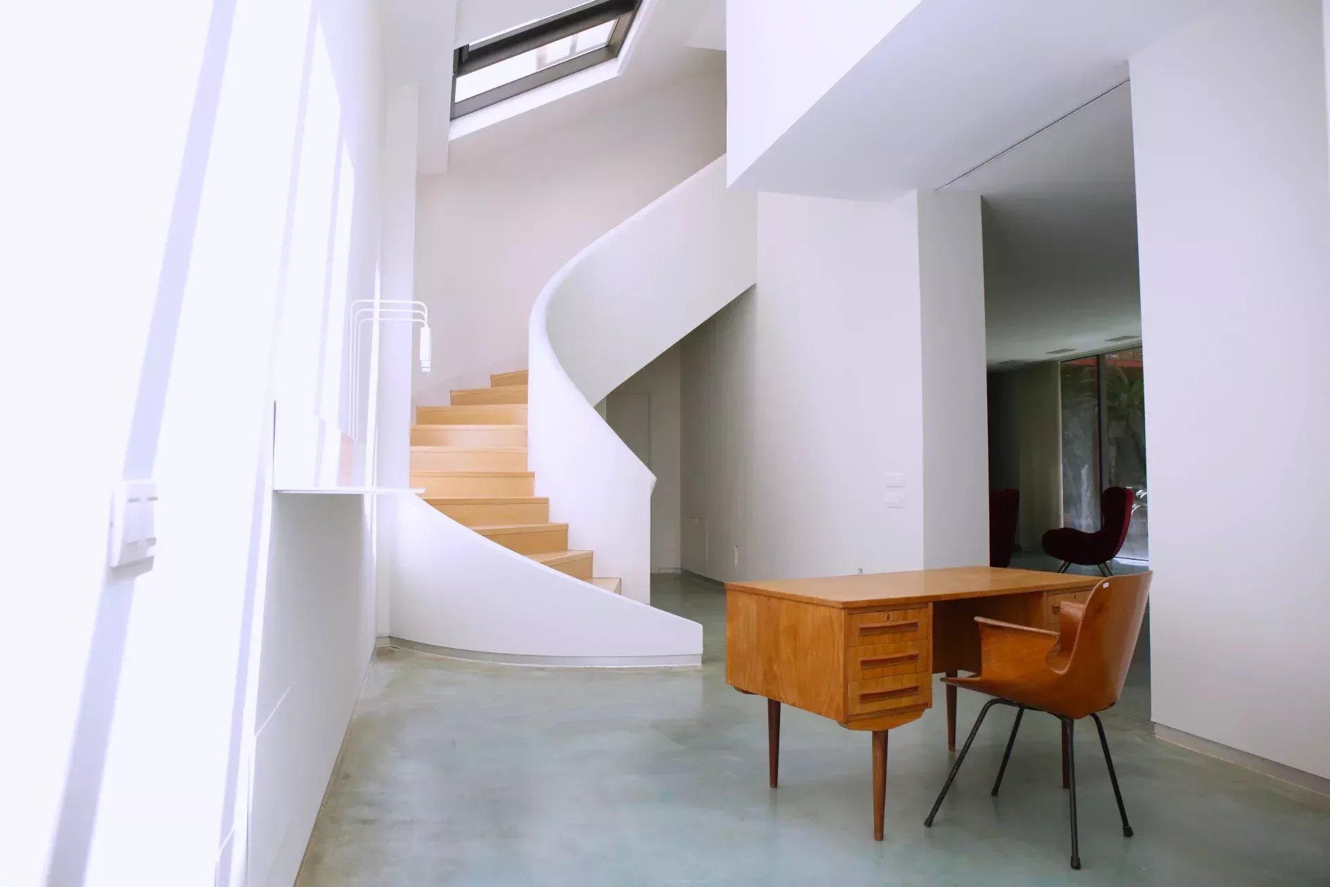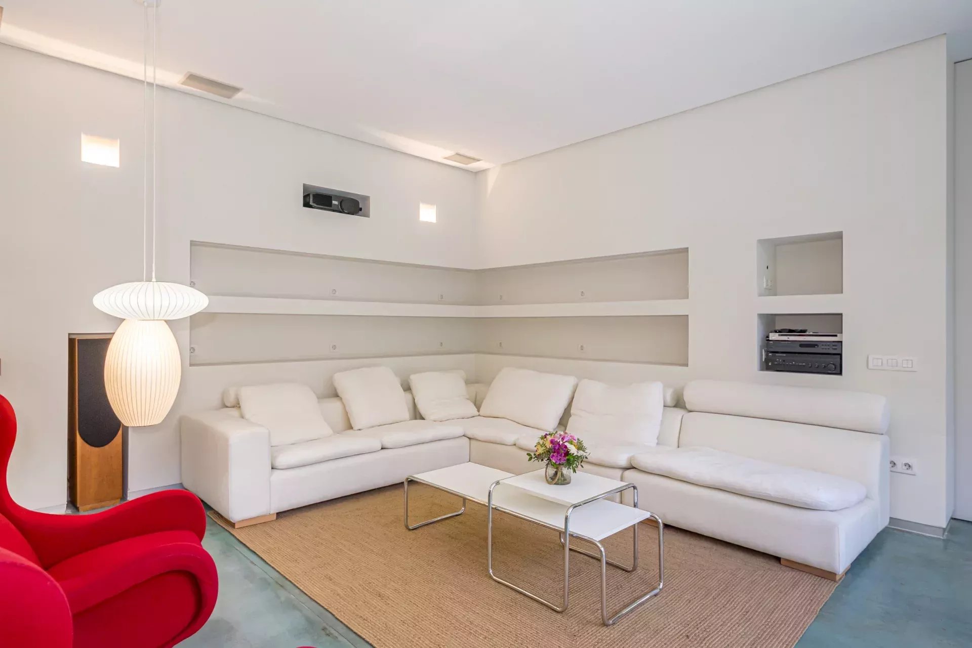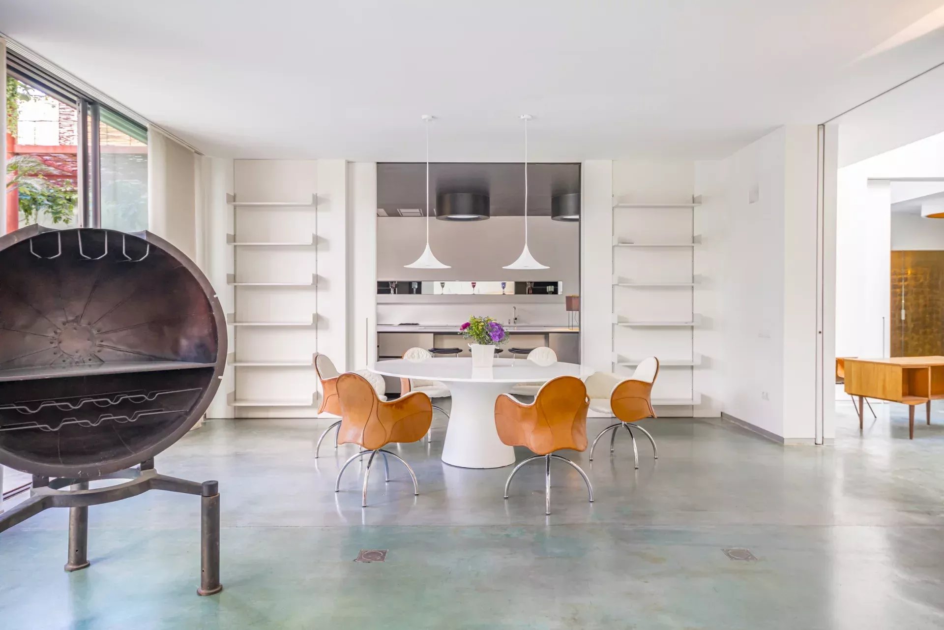 La propriété se distingue par son architecture contemporaine, ses impressionnantes hauteurs sous plafond et ses larges baies vitrées qui baignent les espaces de lumière naturelle, renforçant la sensation de volume. Les sols en béton ciré, la cheminée, le chauffage au sol et le système d’aérothermie offrent un équilibre parfait entre confort, efficacité et raffinement.