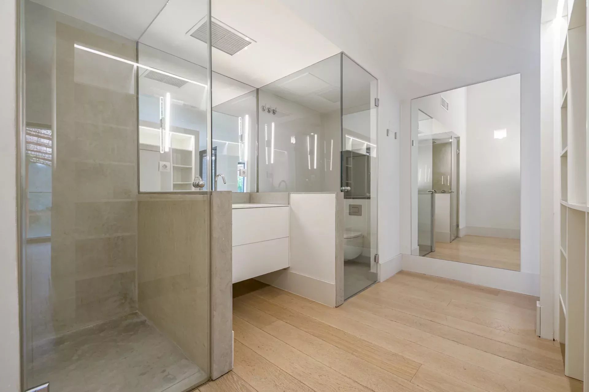 L’espace nuit comprend une spectaculaire suite parentale avec dressing et accès direct à la terrasse et à la piscine, conçue comme un véritable refuge privé. Elle est complétée par trois autres chambres en suite, dont deux avec terrasses privées, organisées autour d’un élégant espace family room.