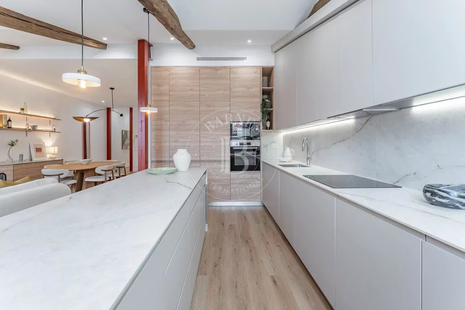 Avec ses plafonds de 3 mètres de hauteur et sa magnifique luminosité, l’appartement offre une sensation d’espace remarquable. La zone de vie se compose d’un espace ouvert et élégant avec un salon avec cheminée, salle à manger, espace bar et une cuisine américaine moderne dotée d’un îlot imposant et de nombreux rangements.