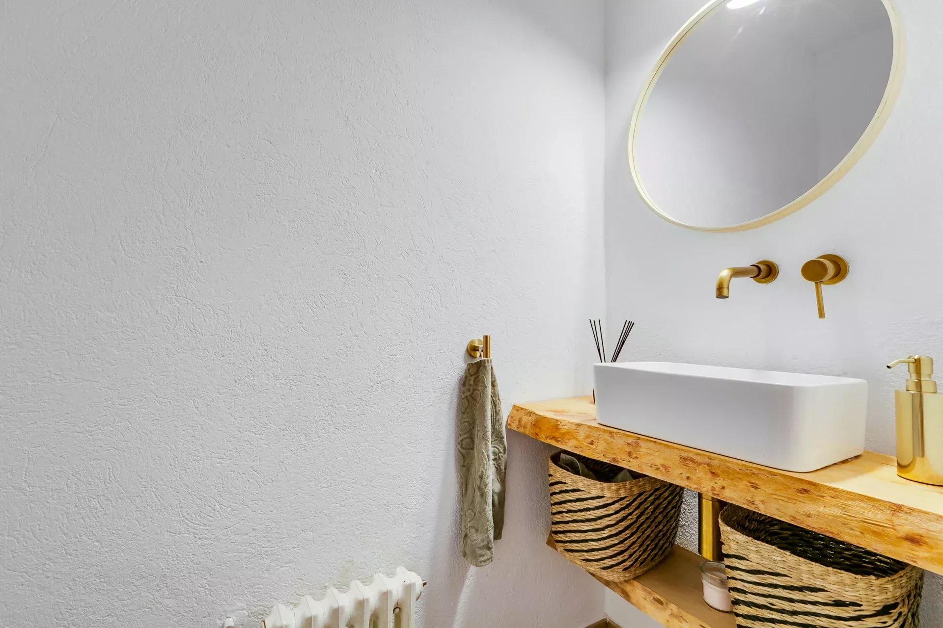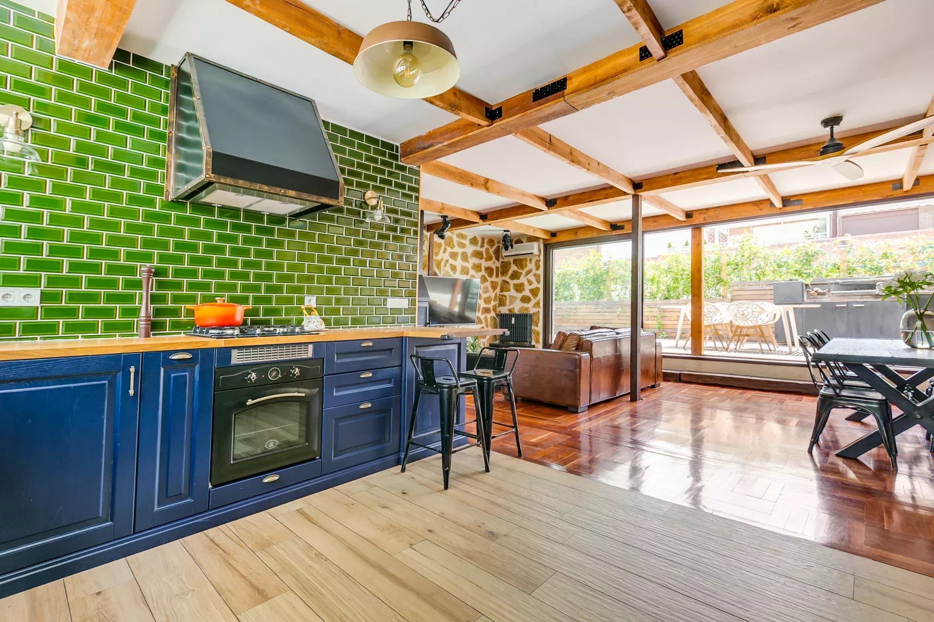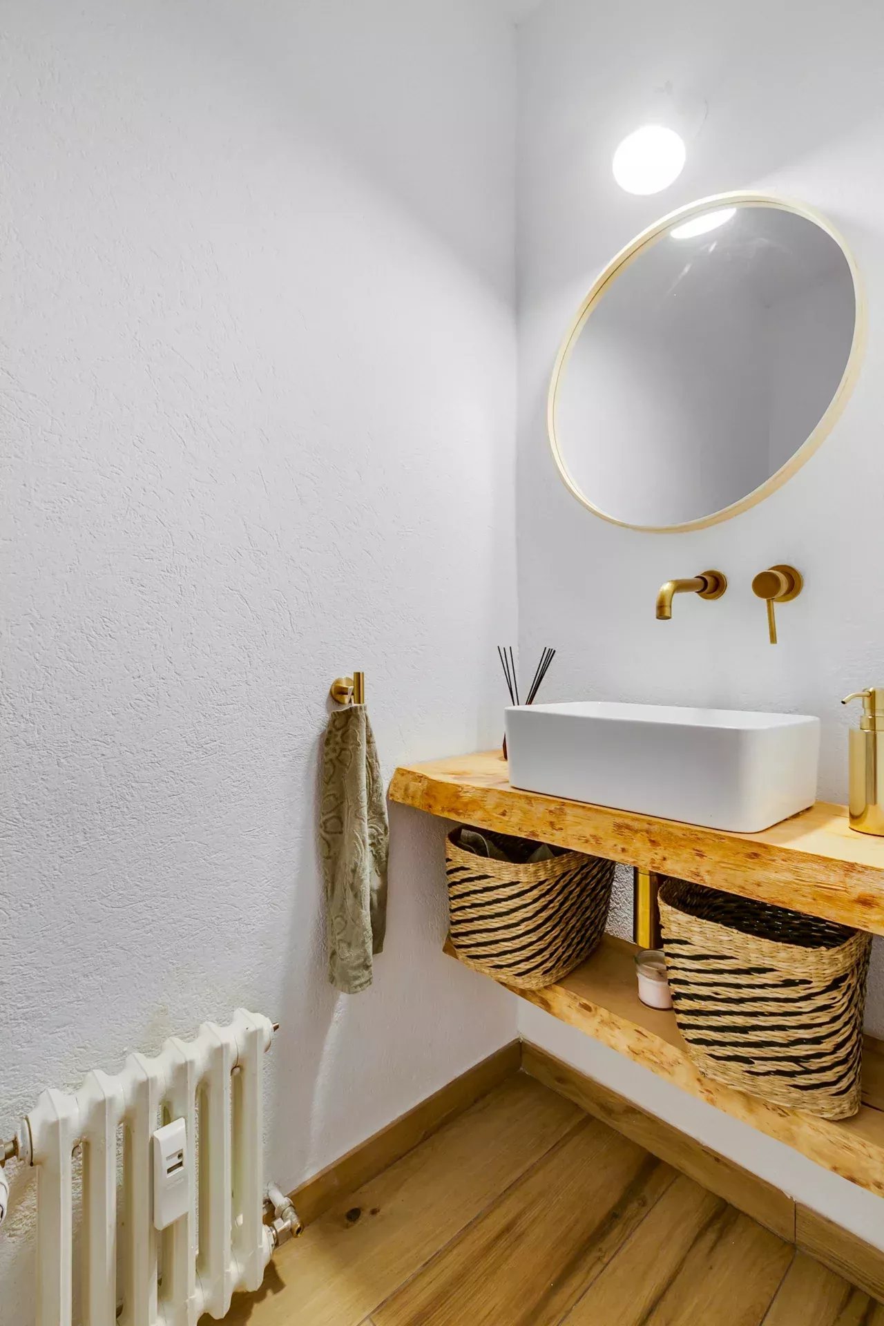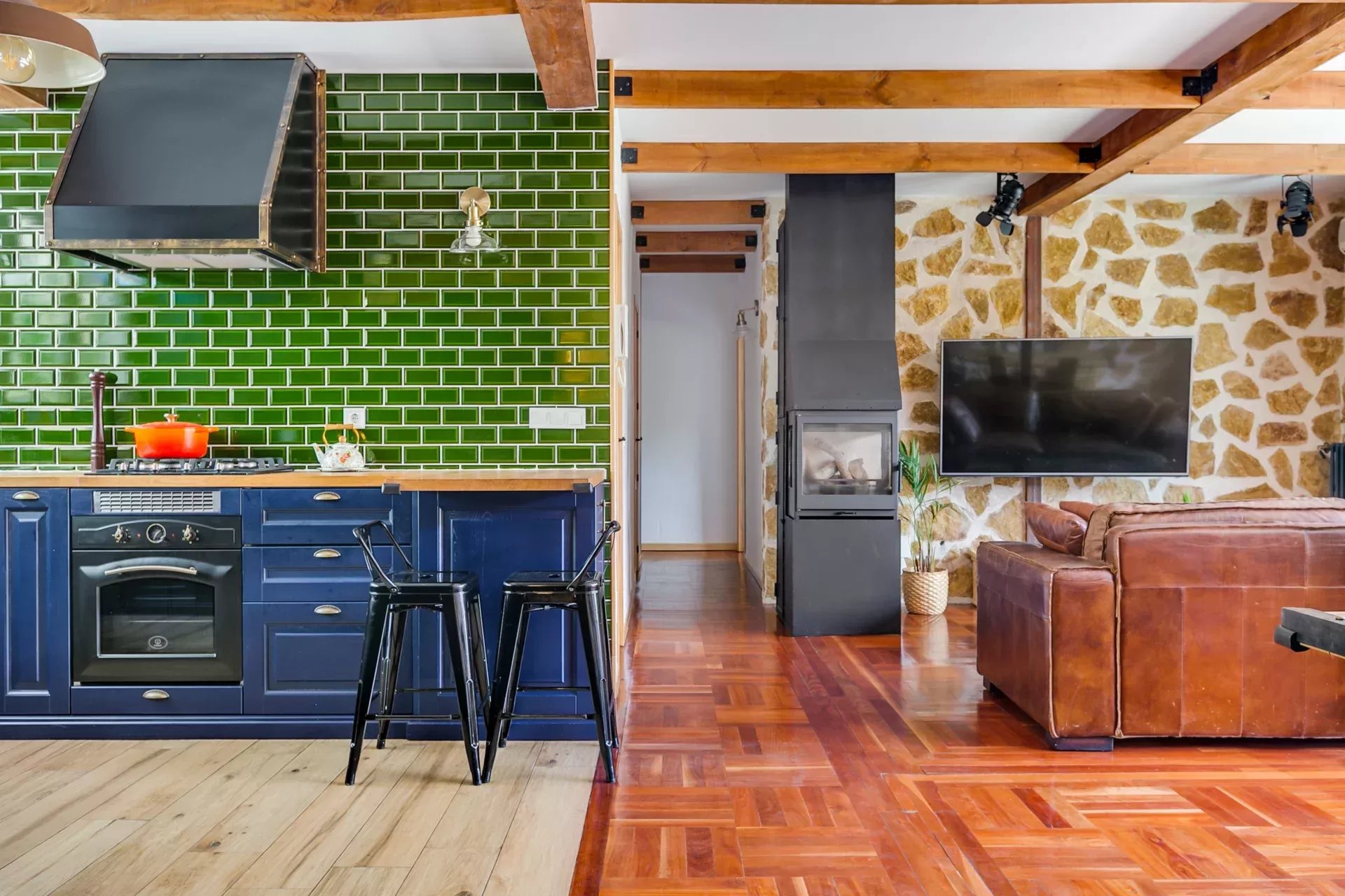 Il allie un design rétro-vintage à des touches modernes, en respectant les éléments d’origine comme le parquet et en combinant des finitions contemporaines en pierre naturelle et céramique brillante.