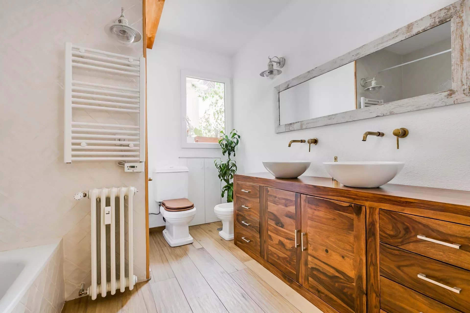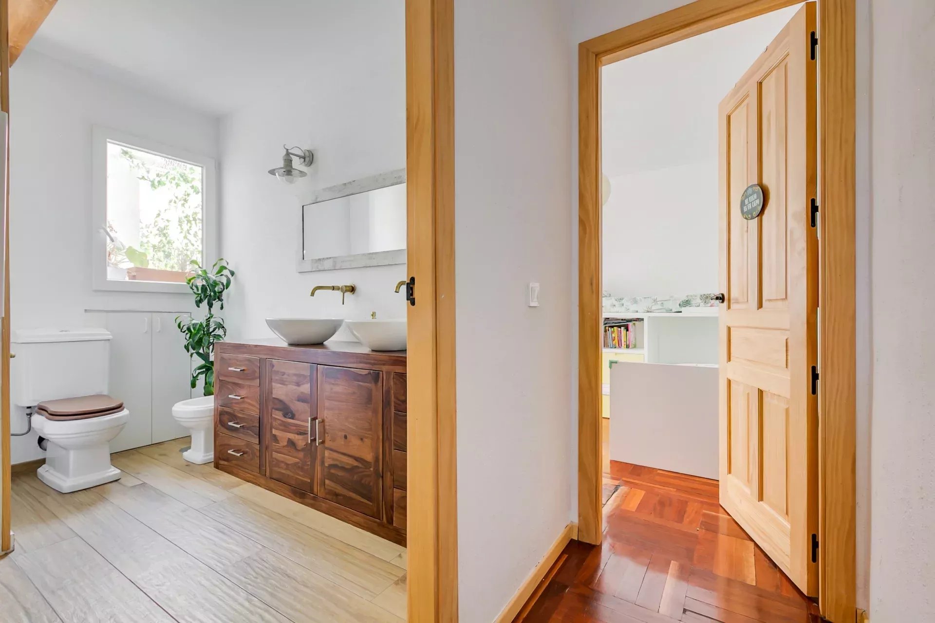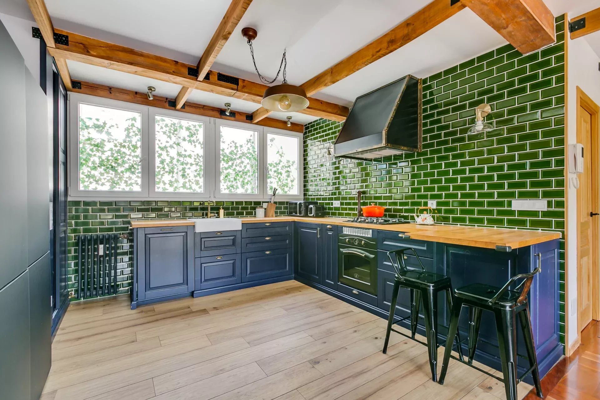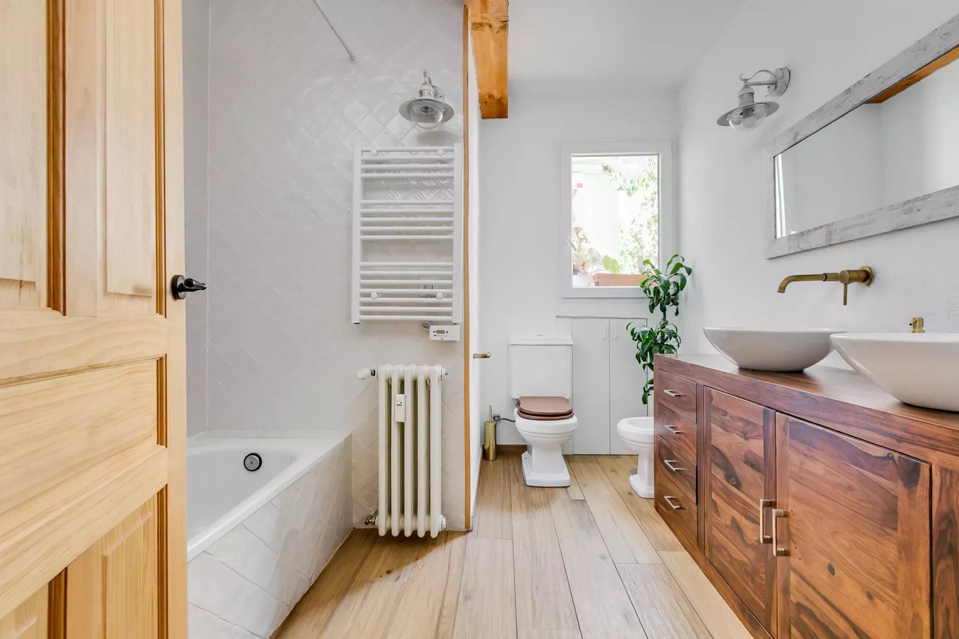 Il allie un design rétro-vintage à des touches modernes, en respectant les éléments d’origine comme le parquet et en combinant des finitions contemporaines en pierre naturelle et céramique brillante.