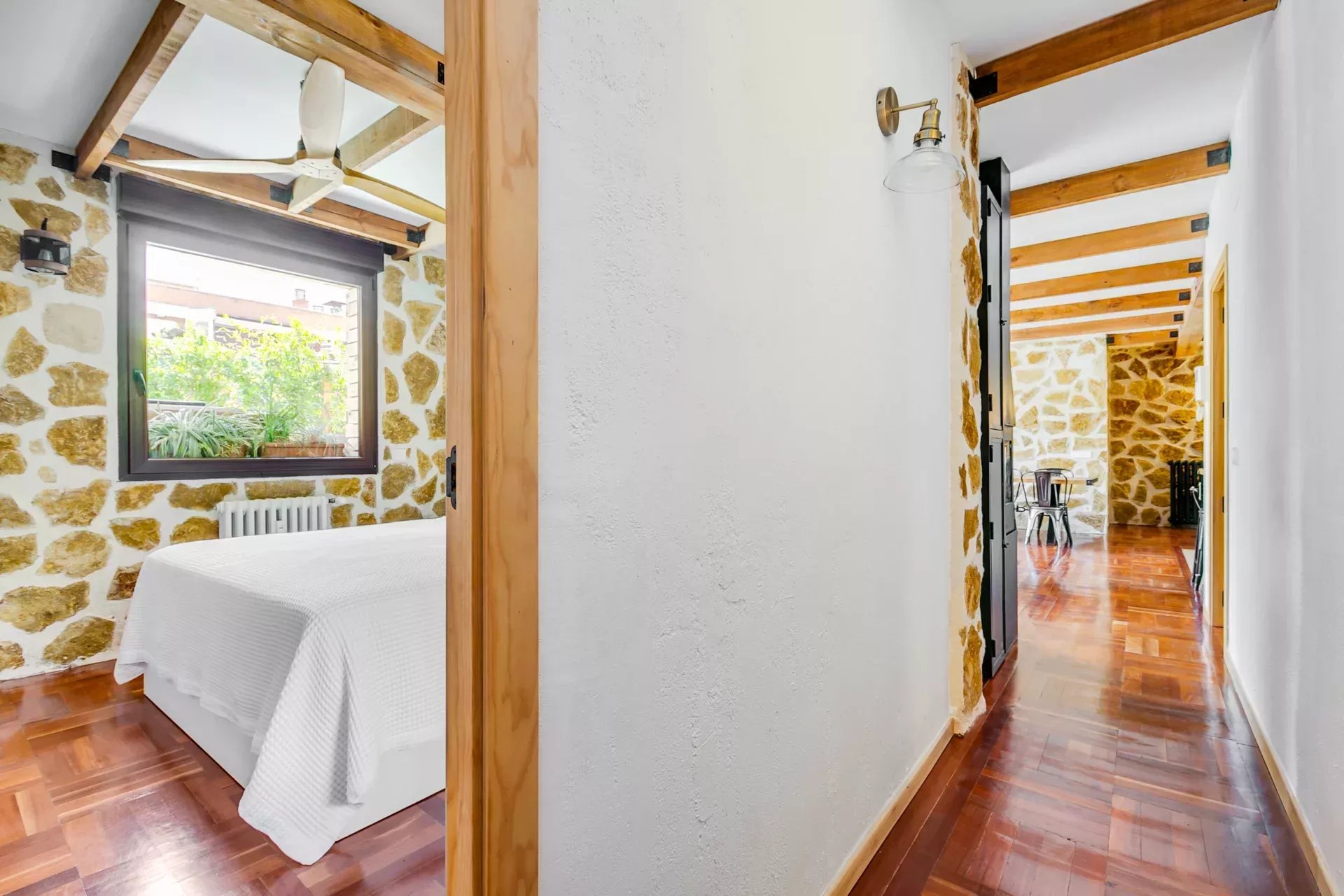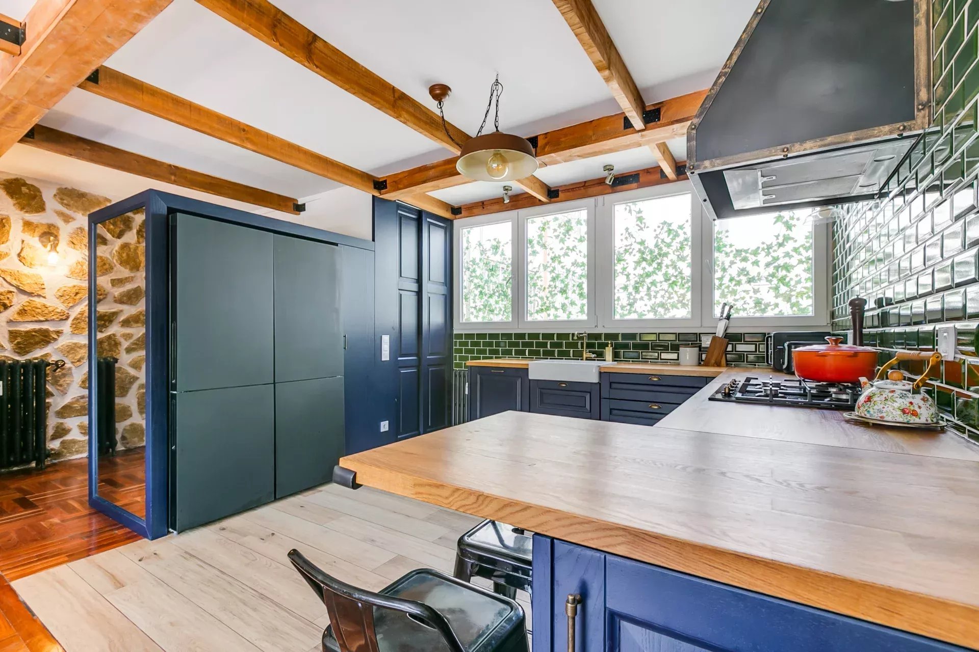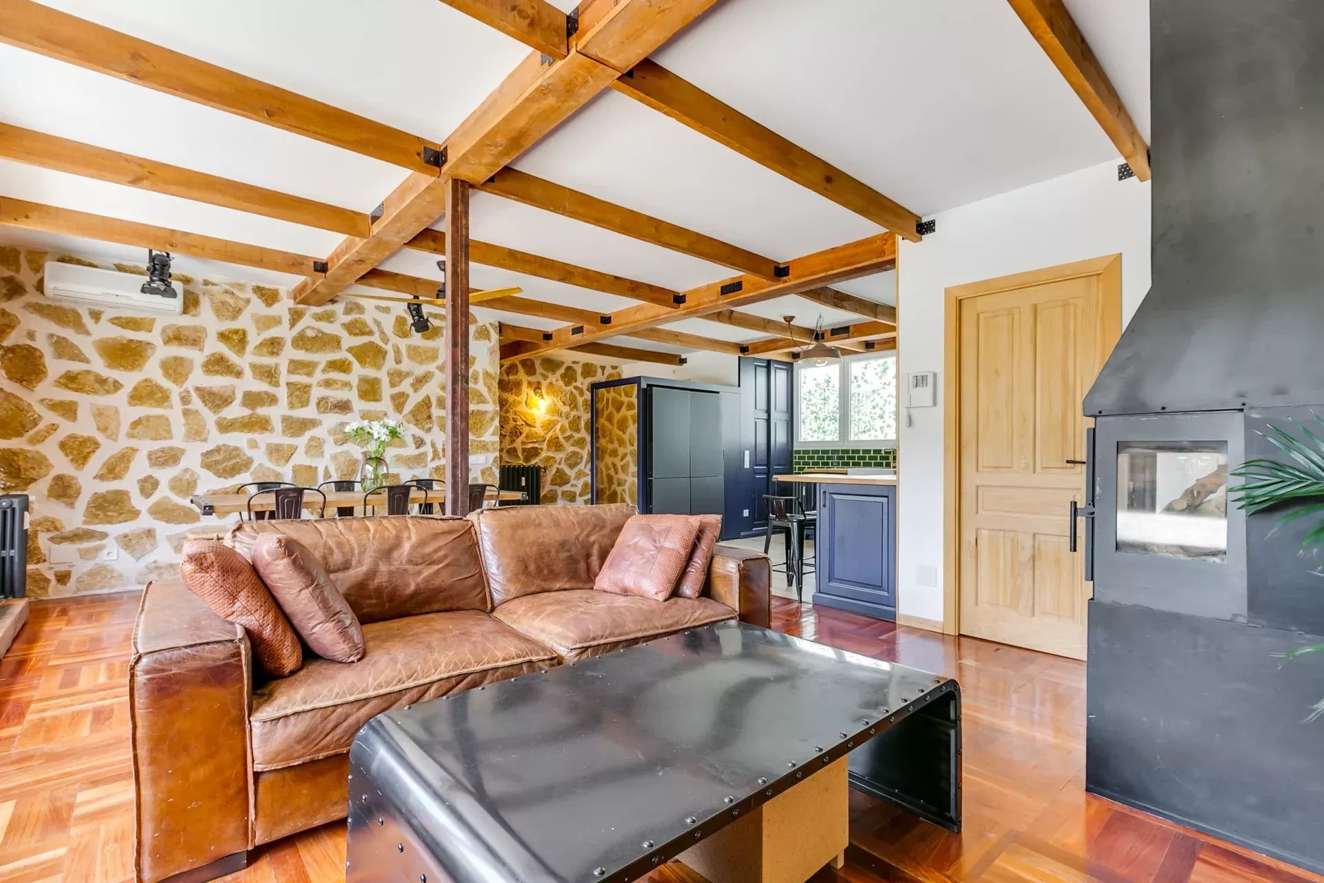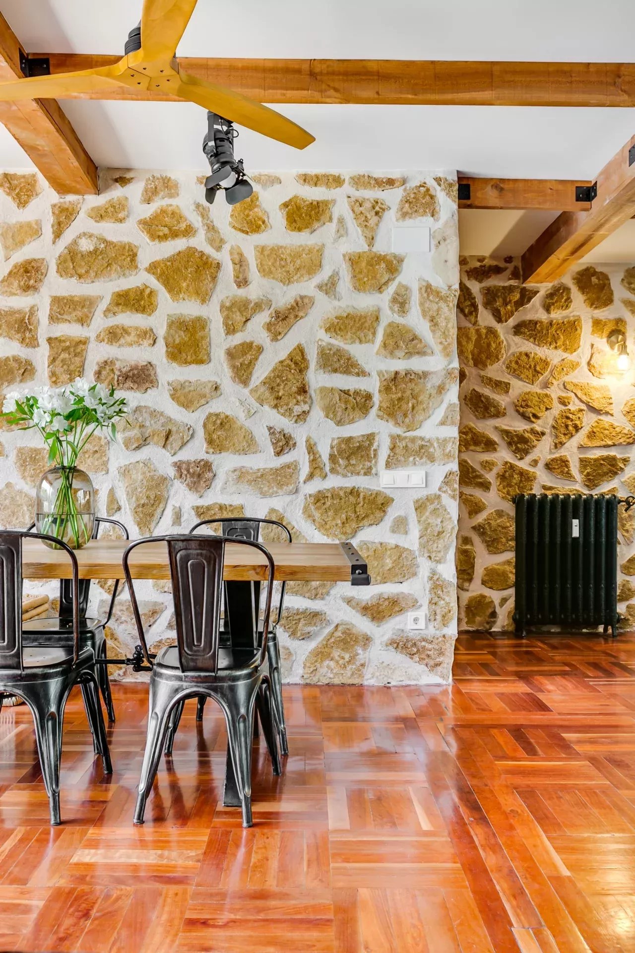 Parquet d’origine combiné à de la pierre naturelle.