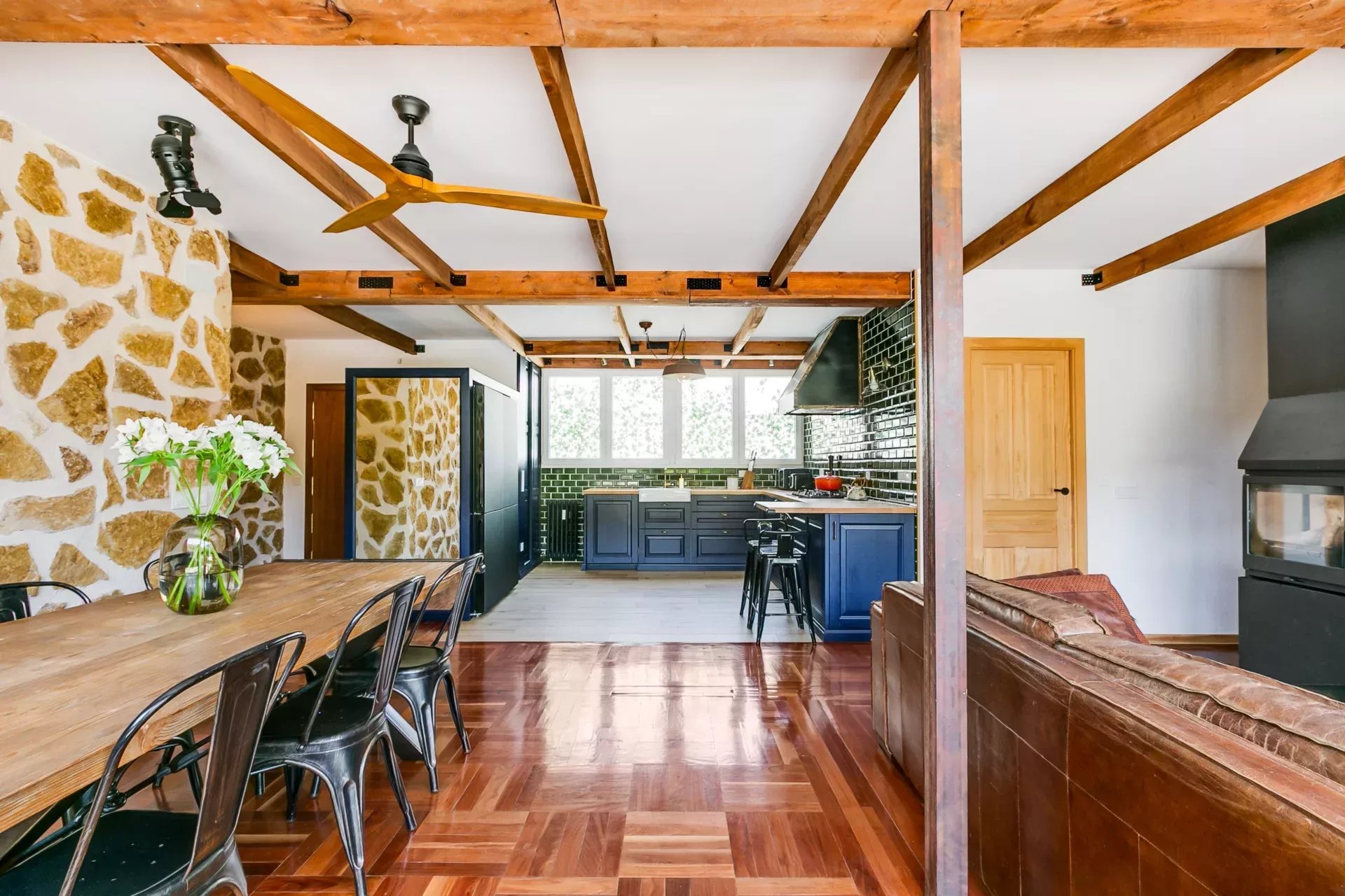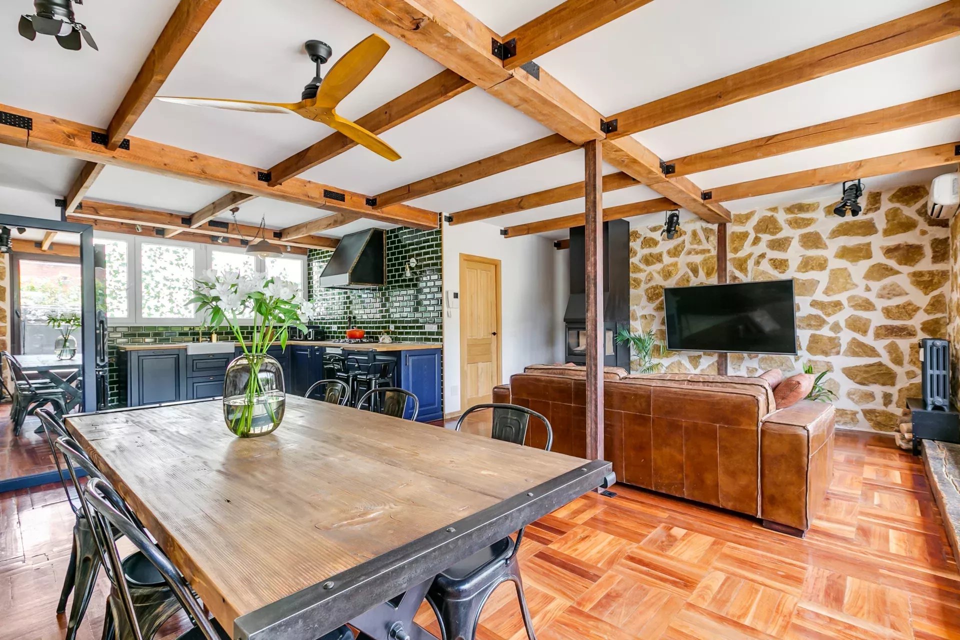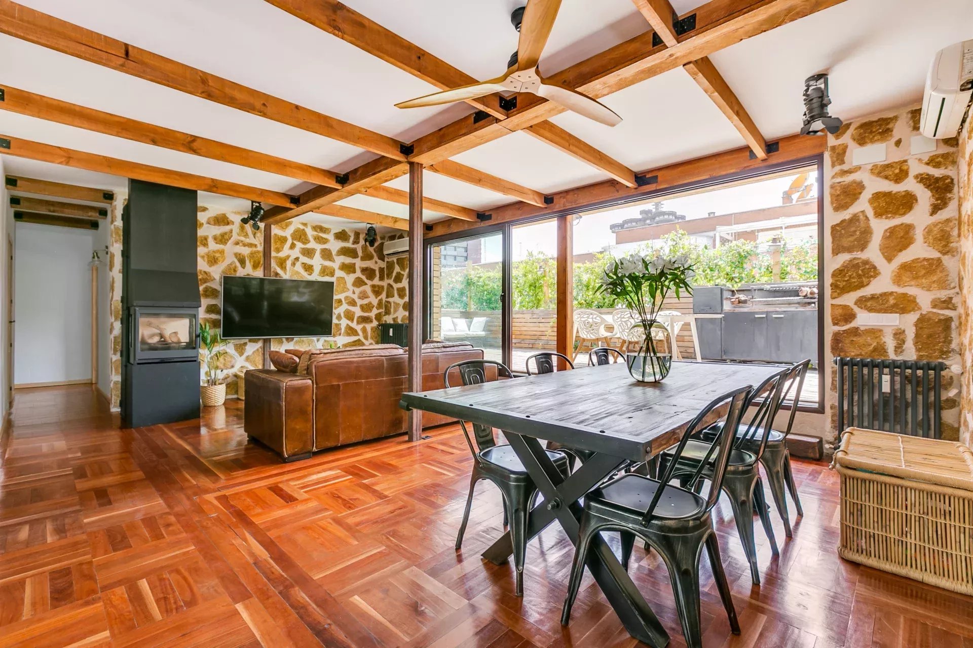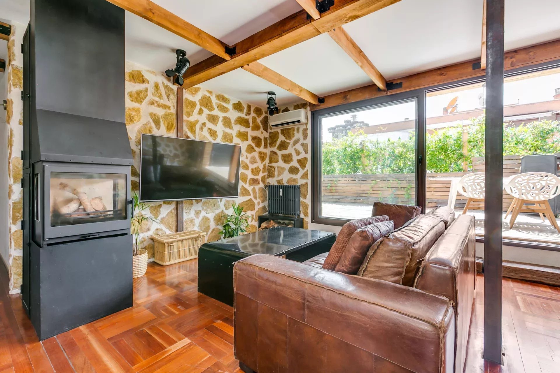 Parquet d’origine combiné à de la pierre naturelle.