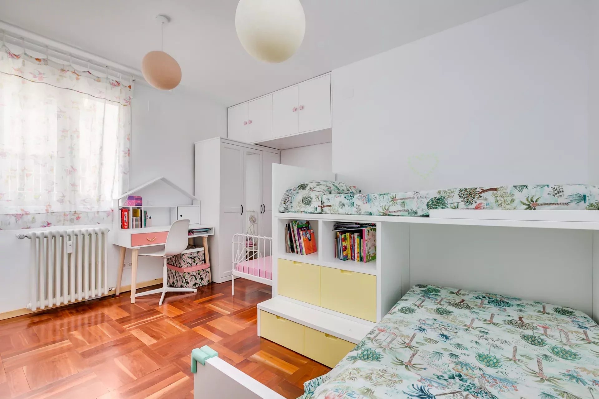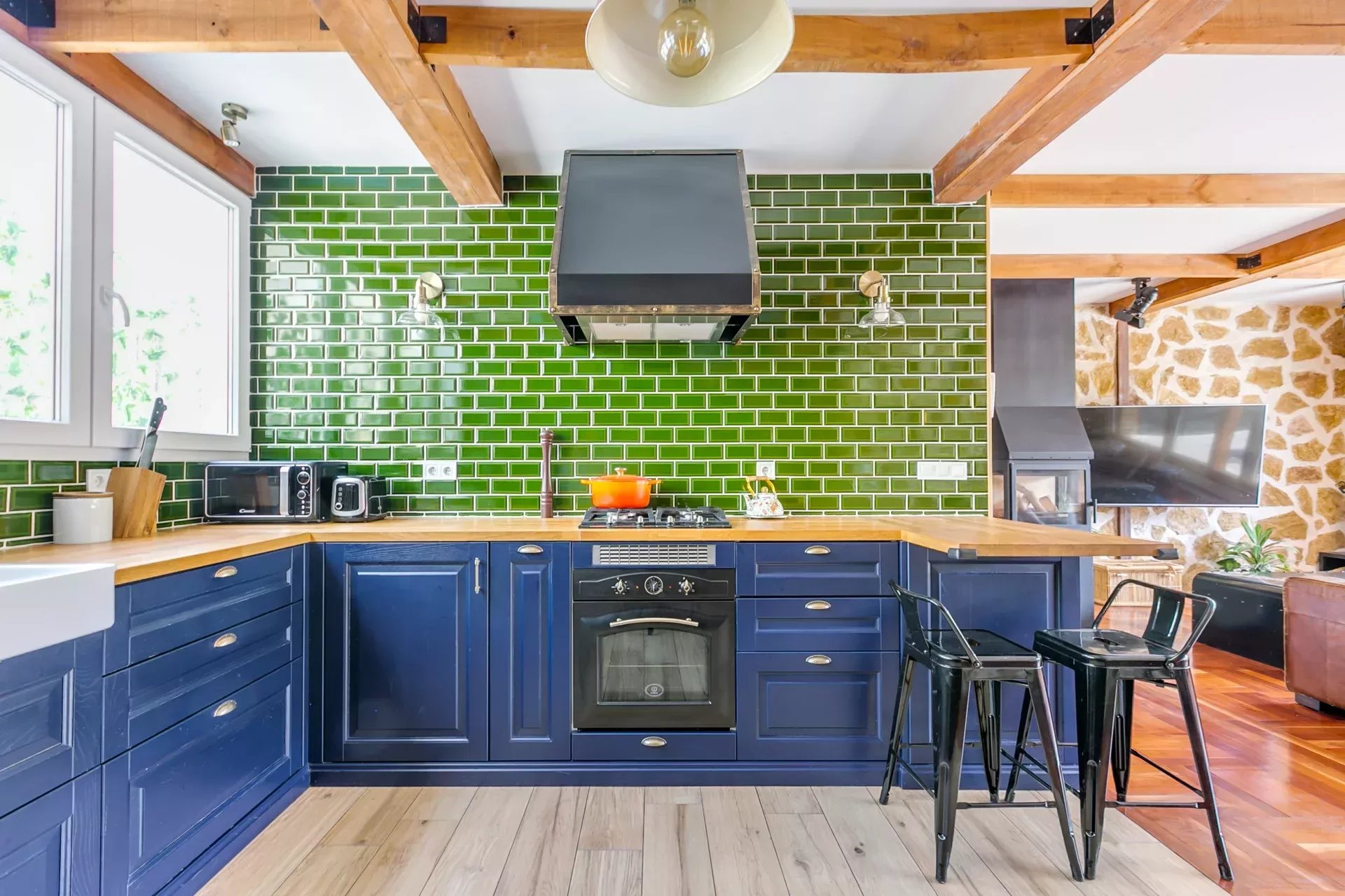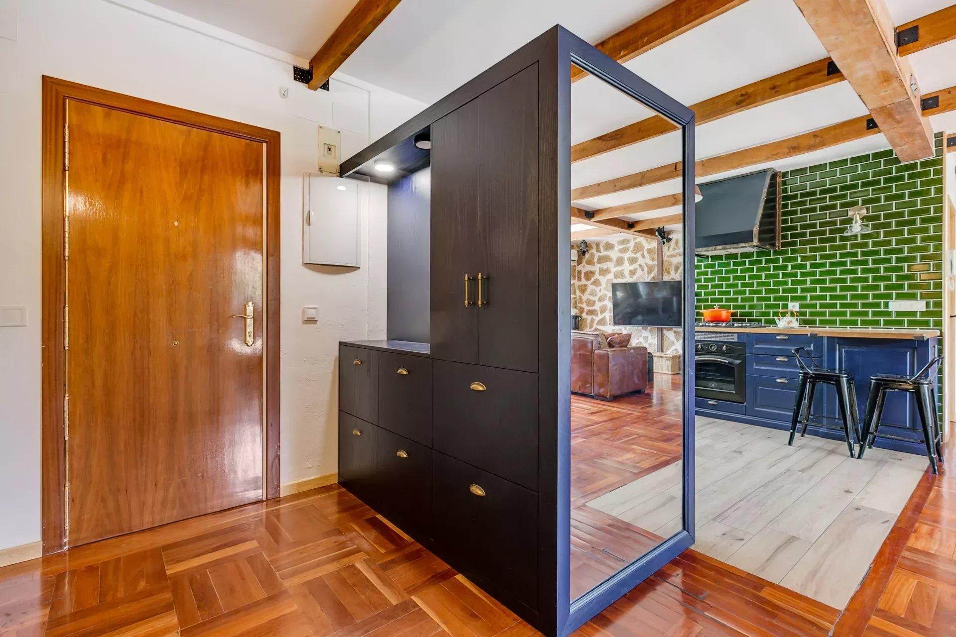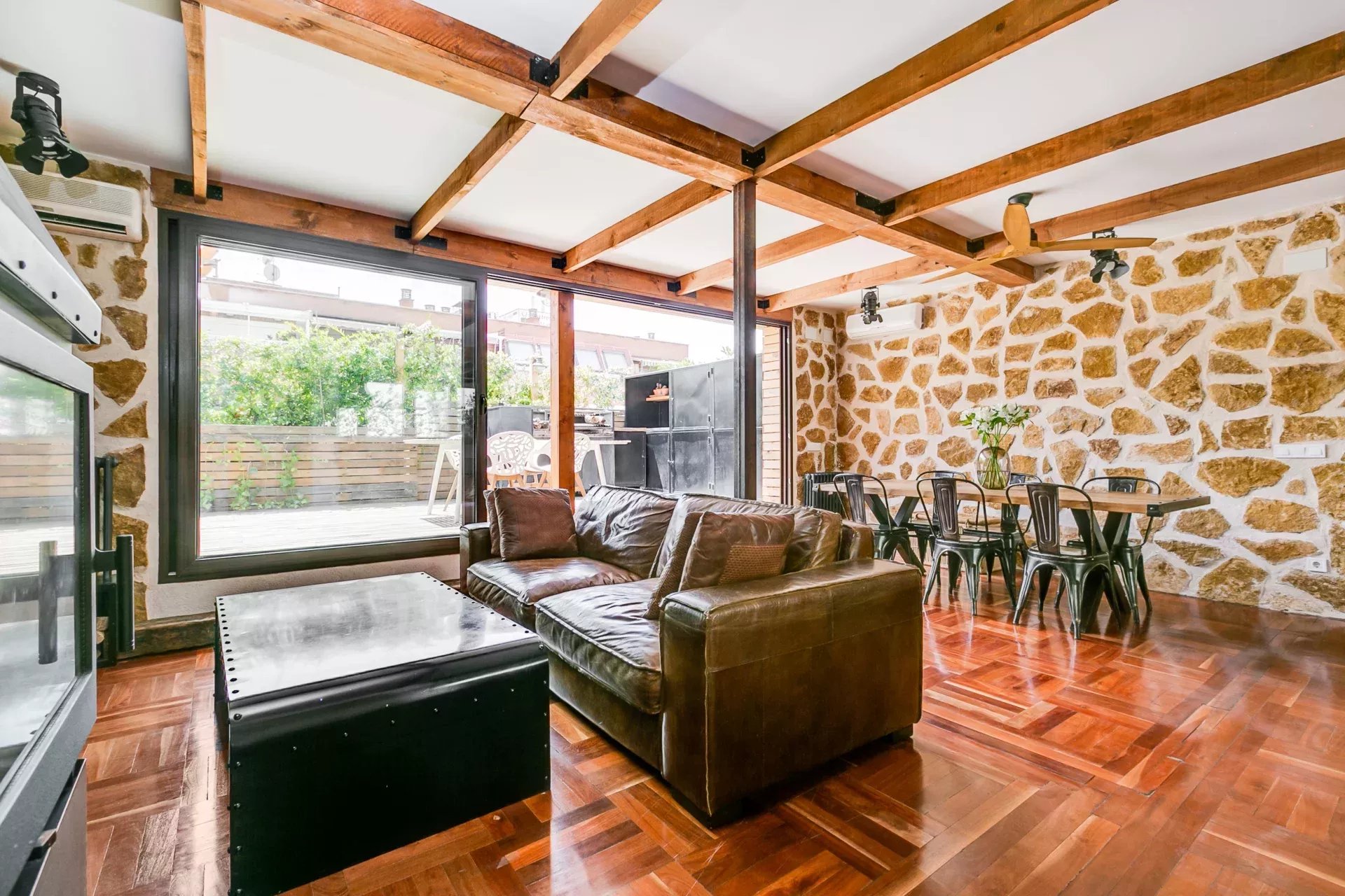 Parquet d’origine combiné à de la pierre naturelle.