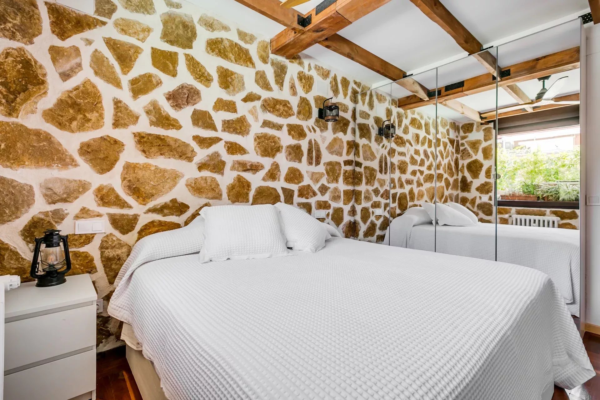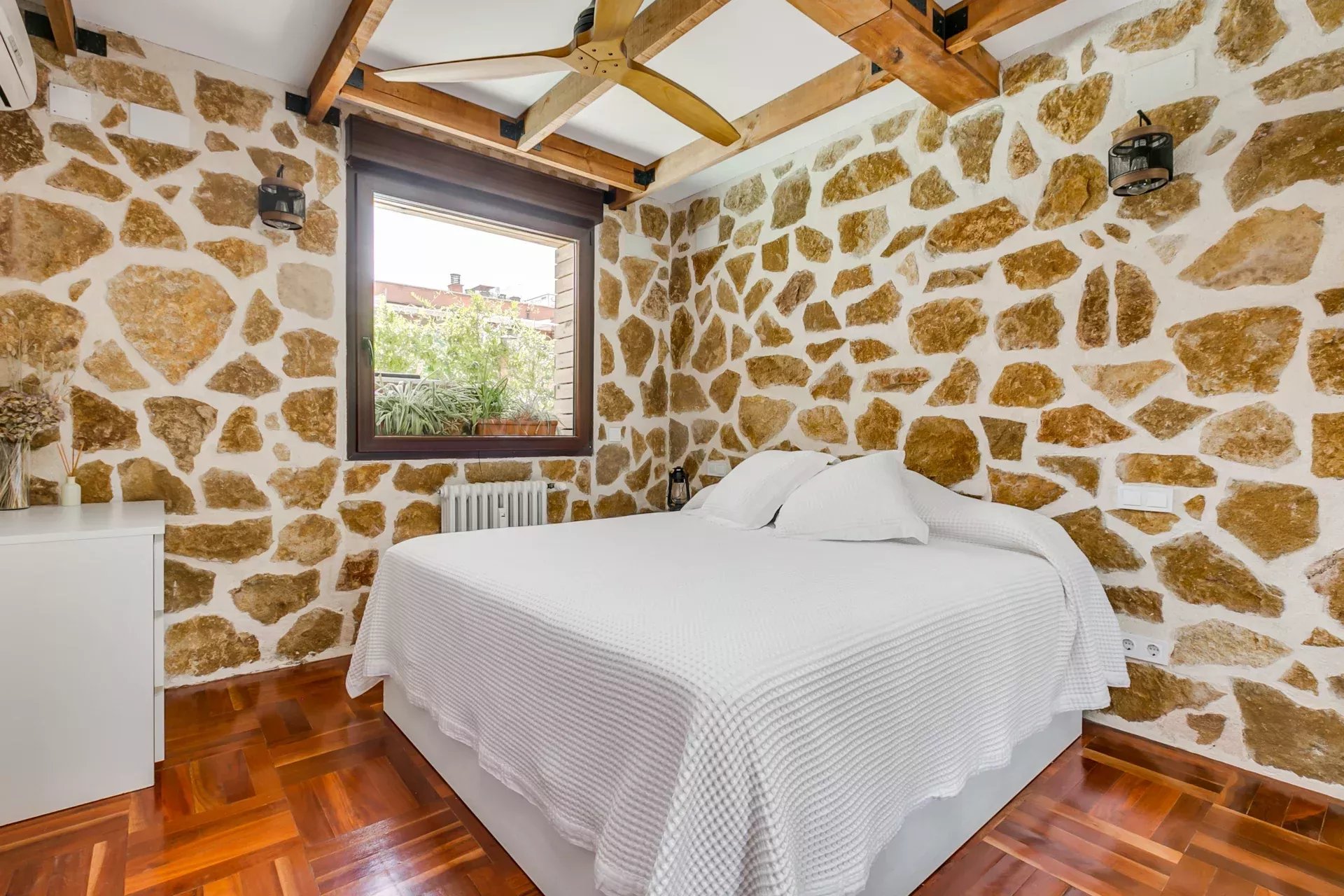 La zone nuit comprend deux chambres (dont une avec vue directe sur la terrasse et un mur revêtu en pierre naturelle) ainsi qu’un bureau fonctionnel, idéal pour le télétravail ou comme pièce polyvalente. Il comprend également une salle de bain complète et un WC invité.